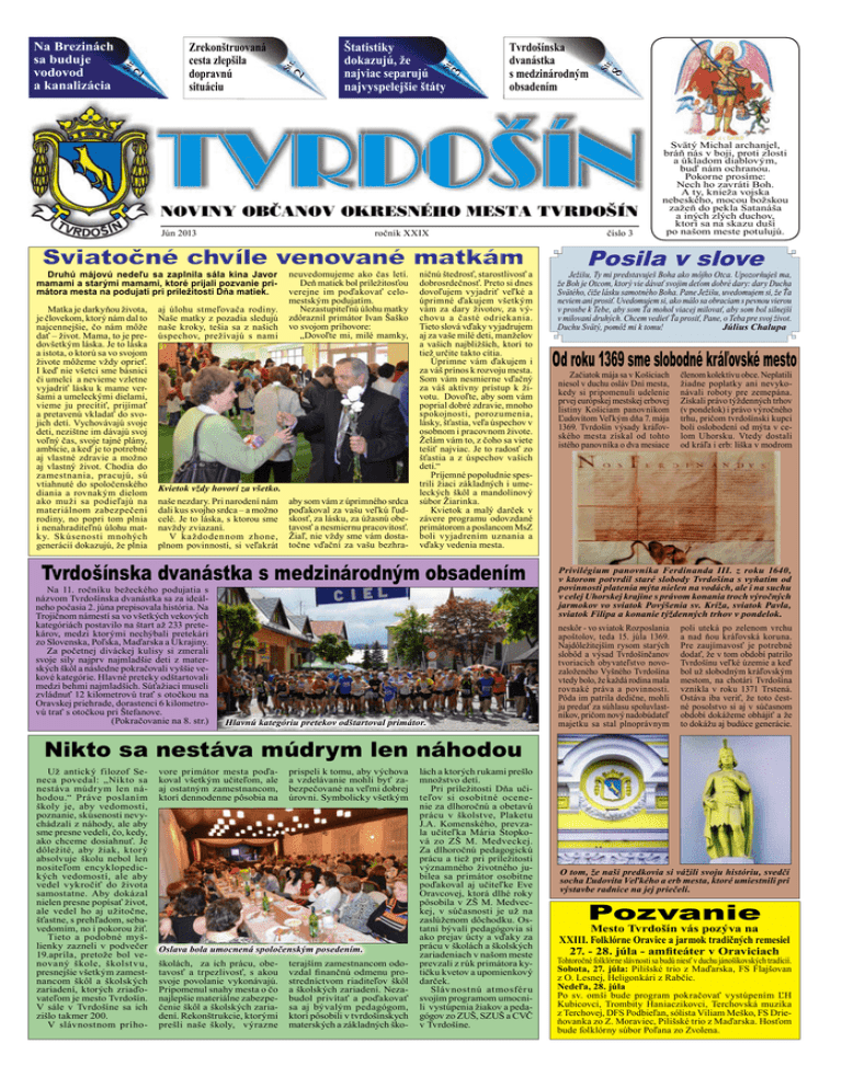 Jún 2013 ročník XXIX Sviatočné chvíle venované matkám Druhú májovú nedeľu sa zaplnila sála kina Javor mamami a starými mamami, ktoré prijali pozvanie primátora mesta na podujatí pri príležitosti Dňa matiek. Matka je darkyňou života, je človekom, ktorý nám dal to najcennejšie, čo nám môže dať – život. Mama, to je predovšetkým láska. Je to láska a istota, o ktorú sa vo svojom živote môžeme vždy oprieť. I keď nie všetci sme básnici či umelci a nevieme vzletne vyjadriť lásku k mame veršami a umeleckými dielami, vieme ju precítiť, prijímať a pretavenú vkladať do svojich detí. Vychovávajú svoje deti, nezištne im dávajú svoj voľný čas, svoje tajné plány, ambície, a keď je to potrebné aj vlastné zdravie a možno aj vlastný život. Chodia do zamestnania, pracujú, sú vtiahnuté do spoločenského diania a rovnakým dielom ako muži sa podieľajú na materiálnom zabezpečení rodiny, no popri tom plnia i nenahraditeľnú úlohu matky. Skúsenosti mnohých generácií dokazujú, že plnia aj úlohu stmeľovača rodiny. Naše matky z pozadia sledujú naše kroky, tešia sa z našich úspechov, prežívajú s nami Kvietok vždy hovorí za všetko. naše nezdary. Pri narodení nám dali kus svojho srdca – a možno celé. Je to láska, s ktorou sme navždy zviazaní. V každodennom zhone, plnom povinností, si veľakrát neuvedomujeme ako čas letí. Deň matiek bol príležitosťou verejne im poďakovať celomestským podujatím. Nezastupiteľnú úlohu matky zdôraznil primátor Ivan Šaško vo svojom príhovore: „Dovoľte mi, milé mamky, aby som vám z úprimného srdca poďakoval za vašu veľkú ľudskosť, za lásku, za úžasnú obetavosť a nesmiernu pracovitosť. Žiaľ, nie vždy sme vám dostatočne vďační za vašu bezhra- ničnú štedrosť, starostlivosť a dobrosrdečnosť. Preto si dnes dovoľujem vyjadriť veľké a úprimné ďakujem všetkým vám za dary životov, za výchovu a časté odriekania. Tieto slová vďaky vyjadrujem aj za vaše milé deti, manželov a vašich najbližších, ktorí to tiež určite takto cítia. Úprimne vám ďakujem i za váš prínos k rozvoju mesta. Som vám nesmierne vďačný za váš aktívny prístup k životu. Dovoľte, aby som vám poprial dobré zdravie, mnoho spokojnosti, porozumenia, lásky, šťastia, veľa úspechov v osobnom i pracovnom živote. Želám vám to, z čoho sa viete tešiť najviac. Je to radosť zo šťastia a z úspechov vašich detí.“ Príjemné popoludnie spestrili žiaci základných i umeleckých škôl a mandolínový súbor Žiarinka. Kvietok a malý darček v závere programu odovzdané primátorom a poslancom MsZ boli vyjadrením uznania a vďaky vedenia mesta. Tvrdošínska dvanástka s medzinárodným obsadením Na 11. ročníku bežeckého podujatia s názvom Tvrdošínska dvanástka sa za ideálneho počasia 2. júna prepisovala história. Na Trojičnom námestí sa vo všetkých vekových kategóriách postavilo na štart až 233 pretekárov, medzi ktorými nechýbali pretekári zo Slovenska, Poľska, Maďarska a Ukrajiny. Za početnej diváckej kulisy si zmerali svoje sily najprv najmladšie deti z materských škôl a následne pokračovali vyššie vekové kategórie. Hlavné preteky odštartovali medzi behmi najmladších. Súťažiaci museli zvládnuť 12 kilometrovú trať s otočkou na Oravskej priehrade, dorastenci 6 kilometrovú trať s otočkou pri Štefanove. (Pokračovanie na 8. str.) Hlavnú kategóriu pretekov odštartoval primátor. 8 Tvrdošínska dvanástka s medzinárodným obsadením Str . Str . Štatistiky dokazujú, že najviac separujú najvyspelejšie štáty 3 Str . Zrekonštruovaná cesta zlepšila dopravnú situáciu 2 Str . 2 Na Brezinách sa buduje vodovod a kanalizácia číslo 3 Svätý Michal archanjel, bráň nás v boji, proti zlosti a úkladom diablov ým, buď nám ochranou. Pokorne prosíme: Nech ho zavráti Boh. A ty, knieža vojska nebeského, mocou božskou zažeň do pekla Satanáša a iných zlých duchov, ktorí sa na skazu duší po našom meste pot ulujú. Posila v slove Ježišu, Ty mi predstavuješ Boha ako môjho Otca. Upozorňuješ ma, že Boh je Otcom, ktorý vie dávať svojim deťom dobré dary: dary Ducha Svätého, čiže lásku samotného Boha. Pane Ježišu, uvedomujem si, že Ťa neviem ani prosiť. Uvedomujem si, ako málo sa obraciam s pevnou vierou v prosbe k Tebe, aby som Ťa mohol viacej milovať, aby som bol silnejší v milovaní druhých. Chcem vedieť Ťa prosiť, Pane, o Teba pre svoj život. Duchu Svätý, pomôž mi k tomu! Július Chalupa Od roku 1369 sme slobodné kráľovské mesto Začiatok mája sa v Košiciach niesol v duchu osláv Dní mesta, kedy si pripomenuli udelenie prvej európskej mestskej erbovej listiny Košiciam panovníkom Ľudovítom Veľkým dňa 7. mája 1369. Tvrdošín výsady kráľovského mesta získal od tohto istého panovníka o dva mesiace členom kolektívu obce. Neplatili žiadne poplatky ani nevykonávali roboty pre zemepána. Získali právo týždenných trhov (v pondelok) i právo výročného trhu, pričom tvrdošínski kupci boli oslobodení od mýta v celom Uhorsku. Vtedy dostali od kráľa i erb: líška v modrom Privilégium panovníka Ferdinanda III. z roku 1640, v ktorom potvrdil staré slobody Tvrdošína s vyňatím od povinnosti platenia mýta nielen na vodách, ale i na suchu v celej Uhorskej krajine s právom konania troch výročných jarmokov vo sviatok Povýšenia sv. Kríža, sviatok Pavla, sviatok Filipa a konanie týždenných trhov v pondelok. neskôr - vo sviatok Rozposlania apoštolov, teda 15. júla 1369. Najdôležitejším rysom starých slobôd a výsad Tvrdošínčanov tvoriacich obyvateľstvo novozaloženého Vyšného Tvrdošína vtedy bolo, že každá rodina mala rovnaké práva a povinnosti. Pôda im patrila dedične, mohli ju predať za súhlasu spoluvlastníkov, pričom nový nadobúdateľ ma