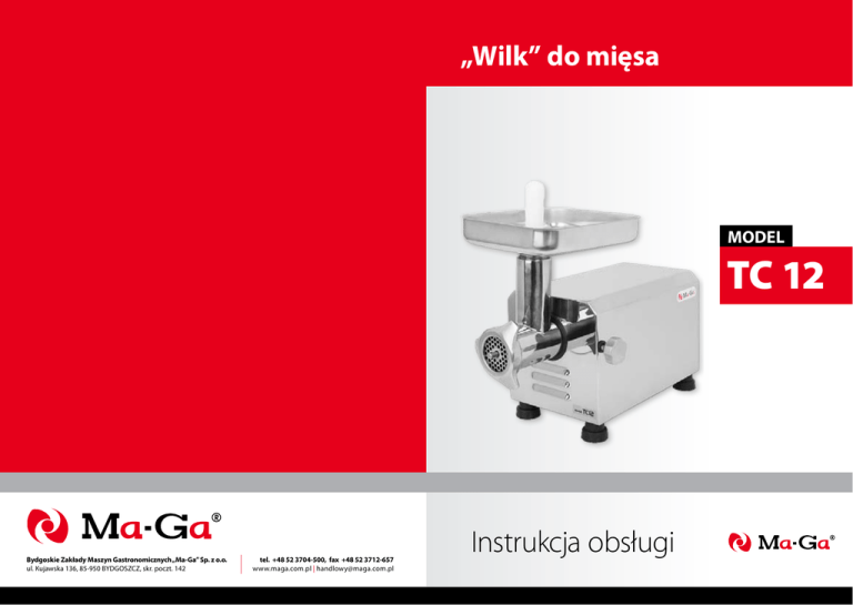„Wilk” do mięsa MODEL TC 12 Bydgoskie Zakłady Maszyn Gastronomicznych „Ma-Ga” Sp. z o.o. ul. Kujawska 136, 85-950 BYDGOSZCZ, skr. poczt. 142 tel. +48 52 3704-500, fax +48 52 3712-657 www.maga.com.pl | [email protected] Instrukcja obsługi Zaleca się używanie maszyny wyłącznie do mielenia mięsa! UWAGA! Elementy maszyny mające bezpośredni kontakt z żywnością wykonane są ze stali nierdzewnej. Codziennie po pracy należy umyć maszynę i wytrzeć do sucha Sitko oraz nóż nie podlega bezpłatnej wymianie w okresie gwarancji Naprawy gwarancyjne i remonty pogwarancyjne płatne, realizuje również producent Bydgoskie Zakłady Maszyn Gastronomicznych Ma-Ga Sp. z o.o. ul. Kujawska 136, 85-950 BYDGOSZCZ, skr. poczt. 142 tel. +48 52 3704-500, fax +48 52 3712-657 www.maga.com.pl | [email protected] „Wilk” do mięsa TC12 Instrukcja obsługi Użytkownikowi naszej maszyny życzymy przyjemnej pracy oraz uzyskania jak najlepszych efektów podczas mielenia żywności. Zalecamy dokładne zapoznanie się z instrukcją obsługi oraz przestrzeganie zawartych w niej wytycznych użytkownika. Lipiec 2011 SPIS TREŚCI WSTĘP....................................................................................... 3 Stan dostawy Opakowanie Ochrona czasowa Składowanie Kwalifikacje 2. 2.1 2.2 2.3 2.4 CHARAKTERYSTYKA TECHNICZNA...................................... 4 Przeznaczenie Wielkości podstawowe Budowa Schemat elektryczny TC12 3. 3.1 3.2 3.3 3.4 3.5 OCHRONA PRZED ZAGROŻENIAMI....................................... 7 Źródła zagrożeń Ryzyko resztkowe Poziom hałasu Zasady bezpiecznej pracy Zgodność z normami 4. 4.1 4.2 4.3 4.4 PRZYGOTOWANIE DO URUCHOMIENIA............................. 11 Rozpakowanie Ustawienie Podłączenie do sieci elektrycznej Uruchomienie maszyny 5. 5.1 UŻYTKOWANIE „WILKA”...................................................... 12 Montaż/demontaż maszyny 6. 6.1 6.2 KONSERWACJA....................................................................... 13 Czyszczenie maszyny Utrzymanie 7. KATALOG CZĘŚCI ZAMIENNYCH......................................... 15 8. USUWANIE NIEDOMAGAŃ TECHNICZNYCH...................... 16 1.1 Stan dostawy W trakcie odbioru dostarczonej maszyny należy sprawdzić, czy opakowanie nie jest uszkodzone oraz, czy znajdujące się wewnątrz przedmioty są zgodne z zamówieniem i specyfikacją. Jeśli będą niezgodności, należy poinformować dostawcę. Maszyna jest dostarczana przez producenta w stanie kompletnym. W celu rozpakowania należy usunąć wszystkie zabezpieczenia przed przemieszczaniem się maszyny w kartonie. Taca do maszyny dostarczana jest w osobnym kartonie znajdującym się razem z maszyną w głównym opakowaniu maszyny. 1.2 Opakowanie Maszyna jest dostarczana w kartonie. Podczas transportu karton należy zabezpieczyć przed wywróceniem i możliwością uszkodzenia mechanicznego. Wymiary zewnętrzne i ciężar podaje tablica 1. Jedn. miary Tablica 1 1. 1.1 1.2 1.3 1.4 1.5 1.WSTĘP Długość Szerokość Wysokość Ciężar brutto mm mm mm kg Karton 620 360 430 27 1.3 Ochrona czasowa Na czas transportu i składowania powierzchnie metalowe maszyny są pokryte cienką warstwą środka konserwującego. Użyte środki konserwujące pozwalają na przechowywanie maszyny w pomieszczeniach zamkniętych przez okres 3 miesięcy. 1.4 Składowanie Maszyna powinna być składowana w suchym pomieszczeniu, zapewniającym ochronę przed wpływami atmosferycznymi (temperatura, wilgotność powietrza). Warunki składowania są podane na kartonie. 1.5 Kwalifikacje Wszelkie czynności, związane z załadunkiem, rozładunkiem i przemieszczaniem maszyny, muszą być wykonane przez osoby uprawnione, o niezbędnych kwalifikacjach i doświadczeniu. 3 2.CHARAKTERYSTYKA TECHNICZNA 2.1 Przeznaczenie „Wilk” jest profesjonalnym urządzeniem do rozdrabniania mięsa. Maszyna została przygotowana z bardzo dużą starannością w zakresie utrzymania czystości. Użytkownik ma zapewnioną wygodną obsługę i możliwość zachowania maksymalnej czystości. Prawidłowa eksploatacja, codzienne staranne czyszczenie, konserwacja oraz regularne sprawdzanie stanu elementów tnących zapewnia wysoki stopień higieny, dobrą sprawność i długą żywotność maszyny. „Wilk” jest maszyną zaprojektowaną z myślą o zastosowaniu w dużych sklepach, supermarketach, cateringu, gastronomii, zakładach zbiorowego żywienia oraz wszelkiego rodzaju zakładach przerobu mięsa. 2.3 Budowa 1 1. 2. 3. 4. 5. 6. 7. 8. Taca załadowcza Popychacz Nakrętka ryglująca Obudowa Włącznik Nóżka Śruba blokująca Obudowa ślimaka 2 3 4 5 6 8 Maszyna nie powinna chodzić na biegu jałowym bez mięsa do przerobu. Dlatego zaleca się niezwłoczne wyłączenie urządzenia po skończonym procesie mielenia. „Wilk” do mielenia mięsa został zaprojektowany dla potrzeb handlu i gastronomii, gdzie proces krojenia odbywa się z przerwami. Używanie „Wilka” do przemysłowego rozdrabniania mięsa w pracy ciągłej, powoduje utratę praw gwarancji. Instrukcja informuje użytkownika o sposobie postępowania, obsługi w czasie użytkowania „Wilka”. 2.2 Wielkości podstawowe Model 7 Rys. 1. Widok ogólny „Wilk” jest wykonany z elementów nierdzewnych. Główne elementy maszyny posiadają dużą gładkość i są łatwe do wyczyszczenia. Nierdzewny ślimak napędzany jest silnikiem elektrycznym poprzez przekładnie zębatą. Obudowa ślimaka jak i elementy wewnątrz tworzące zespół tnący (Rys. 2), są także wykonane jako nierdzewne. Standardowe wyposażenie obejmuje zespół tnący z sitkiem o średnicy 70mm i otworami 4,5; 6mm i 8mm do wyboru. W zestaw tnący wchodzi także samoostrzący nóż. Włączenie urządzenia jest możliwe po wciśnięciu zielonego przycisku włącznika (Rys. 1, poz. 5). Wyłączenie maszyny dokonuje się po wciśnięciu czerwonego przycisku włącznika. TC12 Wymiary - długość 515mm - szerokość 255mm - wysokość 405mm Ciężar 25