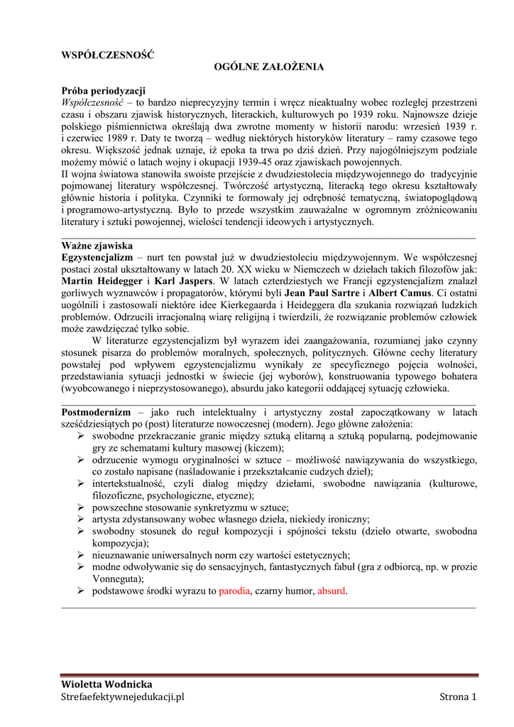 WSPÓŁCZESNOŚĆ OGÓLNE ZAŁOŻENIA Próba periodyzacji Współczesność – to bardzo nieprecyzyjny termin i wręcz nieaktualny wobec rozległej przestrzeni czasu i obszaru zjawisk historycznych, literackich, kulturowych po 1939 roku. Najnowsze dzieje polskiego piśmiennictwa określają dwa zwrotne momenty w historii narodu: wrzesień 1939 r. i czerwiec 1989 r. Daty te tworzą – według niektórych historyków literatury – ramy czasowe tego okresu. Większość jednak uznaje, iż epoka ta trwa po dziś dzień. Przy najogólniejszym podziale możemy mówić o latach wojny i okupacji 1939-45 oraz zjawiskach powojennych. II wojna światowa stanowiła swoiste przejście z dwudziestolecia międzywojennego do tradycyjnie pojmowanej literatury współczesnej. Twórczość artystyczną, literacką tego okresu kształtowały głównie historia i polityka. Czynniki te formowały jej odrębność tematyczną, światopoglądową i programowo-artystyczną. Było to przede wszystkim zauważalne w ogromnym zróżnicowaniu literatury i sztuki powojennej, wielości tendencji ideowych i artystycznych. ________________________________________________________________________________ Ważne zjawiska Egzystencjalizm – nurt ten powstał już w dwudziestoleciu międzywojennym. We współczesnej postaci został ukształtowany w latach 20. XX wieku w Niemczech w dziełach takich filozofów jak: Martin Heidegger i Karl Jaspers. W latach czterdziestych we Francji egzystencjalizm znalazł gorliwych wyznawców i propagatorów, którymi byli Jean Paul Sartre i Albert Camus. Ci ostatni uogólnili i zastosowali niektóre idee Kierkegaarda i Heideggera dla szukania rozwiązań ludzkich problemów. Odrzucili irracjonalną wiarę religijną i twierdzili, że rozwiązanie problemów człowiek może zawdzięczać tylko sobie. W literaturze egzystencjalizm był wyrazem idei zaangażowania, rozumianej jako czynny stosunek pisarza do problemów moralnych, społecznych, politycznych. Główne cechy literatury powstałej pod wpływem egzystencjalizmu wynikały ze specyficznego pojęcia wolności, przedstawiania sytuacji jednostki w świecie (jej wyborów), konstruowania typowego bohatera (wyobcowanego i nieprzystosowanego), absurdu jako kategorii oddającej sytuację człowieka. ________________________________________________________________________________ Postmodernizm – jako ruch intelektualny i artystyczny został zapoczątkowany w latach sześćdziesiątych po (post) literaturze nowoczesnej (modern). Jego główne założenia: swobodne przekraczanie granic między sztuką elitarną a sztuką popularną, podejmowanie gry ze schematami kultury masowej (kiczem); odrzucenie wymogu oryginalności w sztuce – możliwość nawiązywania do wszystkiego, co zostało napisane (naśladowanie i przekształcanie cudzych dzieł); intertekstualność, czyli dialog między dziełami, swobodne nawiązania (kulturowe, filozoficzne, psychologiczne, etyczne); powszechne stosowanie synkretyzmu w sztuce; artysta zdystansowany wobec własnego dzieła, niekiedy ironiczny; swobodny stosunek do reguł kompozycji i spójności tekstu (dzieło otwarte, swobodna kompozycja); nieuznawanie uniwersalnych norm czy wartości estetycznych; modne odwoływanie się do sensacyjnych, fantastycznych fabuł (gra z odbiorcą, np. w prozie Vonneguta); podstawowe środki wyrazu to parodia, czarny humor, absurd. ________________________________________________________________________________ Wioletta Wodnicka Strefaefektywnejedukacji.pl Strona 1 Socrealizm – to kierunek określany jako metoda twórcza, obowiązujący w ZSRR od 1934 r. we wszystkich dziedzinach sztuki, następnie przeniesiony do innych państw socjalistycznych. W Polsce na Zjeździe Związku Literatów Polskich w styczniu 1949 r. w Szczecinie został proklamowany jako oficjalna doktryna, podporządkowująca sztukę działalności propagandowej partii komunistycznej. Pozornie nawiązywał do estetyki mimetycznej realizmu, z założenia jednak miał tworzyć wizję świata odpowiadającą przyjętym hasłom ideologicznym (odwołanie do wątków dydaktycznych). Sztuka miała być socjalistyczna w treści, a narodowa w formie, co praktycznie wykluczało wszelkie nowatorstwo. „Pryszczatymi” nazywano ówczesnych pisarzy-aktywistów. Wytworem takiej literatury stała się powieść produkcyjna (socrealistyczna), ukazująca zazwyczaj wydarzenia rozgrywające się w fabryce lub na budowie. Główni bohaterowie byli ideowymi aktywistami z miast i wsi, propagującymi ideę socjalizmu. W opozycji autorzy prezentowali tzw. czarne charaktery (np. imperialistyczni szpiedzy), usiłujące zniweczyć działania postaci pozytywnych. Przykładem takiej socrealistycznej powieści jest utwór Tadeusza Konwickiego Przy budowie. ________________________________________________________________________________ Polska literatura lat wojny i okupacji Władze hitlerowskie ze szczególną zaciekłością tępiły na terenach okupowanych wszelkie przejawy polskiego życia kulturalnego, a materialny dorobek kultury został zniszczony lub zagrabiony. Po 1 września 1939 roku życie kulturalne i literackie nie zamarło, a jedynie zmienił się charakter społecznego obiegu. Dojrzali pisarze (tworzący już w dwudziestoleciu międzywojennym) w momencie wybuchu wojny kontynuowali twórczość w konspiracji lub na emigracji. Rozproszenie pisarzy i różnorodność ich doświadczeń zdecydowały o tematyce utworów, rodzaju i skali wysiłków zmierzających do utrzymania wartości duchowych. Narodowi potrzebna była przede wszystkim liryka patriotyczna, ukazująca obraz bojowych zmagań i cierpień narodu, dodająca sił do walki. Na drugi plan zeszła problematyka czysto artystyczna, jak np. poszukiwanie nowych form wyrazu. Dla twórców tego okresu najbliższe były tradycje literackie wieku XIX, zwłaszcza tradycje polskiego romantyzmu (hasła zjednoczenia narodu w walce z zaborcą). _________________________________
