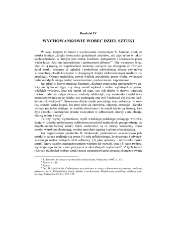 Rozdział IV WYCHOWANKOWIE WOBEC DZIEŁ SZTUKI W swej książce O sztuce i wychowaniu estetycznym S. Szuman pisał, że sztuka istnieje „dzięki twórczości genialnych artystów, ale żyje tylko w takim społeczeństwie, w którym jest znana, kochana, upragniona i szanowana przez wielu ludzi. Jest ona kulturalnym i społecznym dobrem”1. Nie wystarczy więc, idąc za tą myślą, że współcześnie możemy szczycić się dostępem do różnych dzieł sztuki, możemy je oglądać i podziwiać odwiedzając muzea czy nawet w dowolnej chwili korzystać z dostępnych dzięki elektronicznym mediom reprodukcji. Obrazy malarskie, nawet wielkie arcydzieła, przez wielu, zwłaszcza ludzi młodych, mogą zostać niezauważone, niedocenione, zapomniane. Jak pisał w innym miejscu Szuman: „Kultura estetyczna społeczeństwa zależy nie tylko od tego, czy dany naród wyłonił z siebie wybitnych artystów, wielkich twórców, lecz nie mniej od tego, czy ich dzieła w danym narodzie i wśród ludzi na całym świecie znalazły oddźwięk, czy zaistniało i nadal trwa zapotrzebowanie na te dzieła, czy pomagają one żyć i radować się życiem każdemu człowiekowi”2. Stworzone dzieło sztuki potrzebuje więc odbiorcy, w swoisty sposób szuka kogoś, kto przy nim się zatrzyma, odczyta, przeżyje. „Sztuka istnieje nie tylko dlatego, że została stworzona i że nadal artyści ją tworzą, lecz żyje szeroko i konkretnie przede wszystkim w odbiorcach, którzy z nią obcują, nią się radują i sycą”3. Te trzy, wyżej wymienione, myśli wielkiego polskiego pedagoga wprowadzają w rozdział poświęcony odbiorcom arcydzieł malarskich, przypominają, że dopełnieniem każdej sztuki, także malarstwa, są ci, którzy konkretny obraz swoim wzrokiem dostrzegą, swoim umysłem ogarną i całym sobą przeżyją. Jak współcześnie podkreśla D. Jankowski, podmiotowe uczestnictwo jednostki w sztuce realizuje się przez (1) rolę refleksyjnego, krytycznego i zdystansowanego wobec różnych ofert odbiorcy, (2) jako sprawcy – uczestnika rynku sztuki, który swoim zaangażowaniem wspiera jej rozwój, oraz (3) jako twórcy, wyrażającego siebie i swe przeżycia w określonych wytworach4. Z tych trzech różnych odniesień wobec sztuki nasze zainteresowania zostaną skoncentrowane 1 S. SZUMAN, O sztuce i wychowaniu estetycznym, Warszawa 19904, s. 131. Tamże, s. 118. 3 Tamże. 4 Por. D. JANKOWSKI, Podmiotowe uczestnictwo w sztuce a kreowanie tożsamości osobowej jednostki, w: K. PANKOWSKA (red.), Sztuka i wychowanie. Współczesne problemy edukacji estetycznej, Warszawa 2010, s. 152–155. 2 114 ARCYDZIEŁA MALARSTWA W KATECHEZIE wokół pierwszego – ukazania człowieka jako odbiorcy dzieł malarskich, kogoś, kto ma możliwość spotkania z obrazem i potrafi tę możliwość wykorzystać na rzecz własnego rozwoju. Zajmiemy się więc nie tyle zagadnieniami ekonomii czy twórczości, ale kwestiami związanymi z odbiorem arcydzieł malarskich. Jak podkreślono to wcześniej, jest to istotny zakres wychowania estetycznego. Współczesna pedagogika, choć podzielona na tak wiele nurtów, koncepcji i modeli, wciąż próbuje wracać i zaczynać od wychowanków – od uczniów, którzy stanowią, zgodnie z zasadą personalizmu, sens wszelkich oddziaływań wychowawczych. Także wychowanie estetyczne, które przez spotkanie z obrazem pragnie doprowadzić do różnych zmian wychowawczych, winno przede wszystkim wychodzić od uczniów. Oni mogą stać się odbiorcami dzieł sztuki, oni winni być uposażani w odpowiednią wiedzę i umiejętności, które pozwolą im nie tylko dostrzec określone wartości estetyczne, ale także je przeżyć, ucieszyć się nimi i przyjąć w obręb swych osobistych doświadczeń. W obecnym rozdziale rozważania będą koncentrowały się na osobie wychowanka/ucznia – odbiorcy dzieła, na zmianach, jakie zachodzą (mogą/powinny zajść) w momencie, kiedy staje on wobec określonych arcydzieł malarstwa, kiedy obraz, początkowo nieznany, zaczyna przemawiać swoistym językiem, docierać przez zmysły do serca i intelektu, zostawiając w nich wyraźny ślad, a także prowokując do określonych zachowań. Ponieważ także ta problematyka ma swoją długą historię, wypada wpierw ją przywołać, a także przypomnieć, w jaki sposób odkrywano i opisywano przeżycie estetyczne. Tym kwestiom poświęcali swe publikacje zarówno estetycy, jak i psychologowie. Bazując na ich przemyśleniach, należy odnaleźć istotne elementy przeżyć estetycznych, które mogą być odniesione także do współczesnych młodych ludzi. Te wskazówki warto będzie przenieść na grunt pedagogiczny, by ukazać istotne zadania, jakie stają przed osobami pragnącymi wprowadzać innych w bogaty świat wartości estetycznych, wyrażonych zwłaszcza, choć nie wyłącznie, w twórczości malarskiej. 1. Człowiek w spotkaniu ze sztuką (aspekt historyczny) Termin „przeżycie estetyczne” wiąże się z określeniem szczególnej relacji człowieka do sztuki, z jej odbiorem (percepcją). Stwierdzenie, że przeżycie estetyczne stanowi podstawę procesu wychowawczego, zawiera w sobie przekonanie, iż wynika ono z określonego rodzaju kontaktów odbiorcy z dziełem sztuki, którego nie jest on autorem. Przeżycie estetyczne kojarzy się z istnieniem odrębnego, swoistego świata sztuki i stanowi treść afirmatywnego stosunku do jej wartości. Jako odrębny przedmiot zainteresowań badawczych, przeżycie estetyczne pojawiło się stosunkowo późno, bo dopiero w XIX w. Teoretyczne badania nad przeżyciem estetycznym prowadzone były w ramach estetyki, natomiast badania empirycz- WYCHOWANKOWIE WOBEC DZIEŁ SZTUKI 115 ne rozwinęły się w obrębie psychologii. Problematyką przeżycia estetycznego zainteresowali się także pedagodzy, dostrzegając w sztuce ważny element wychowania człowieka na różnych etapach jego rozwoju5. Ujmując historycznie, przeżyciem estetycznym zajmowali się fi