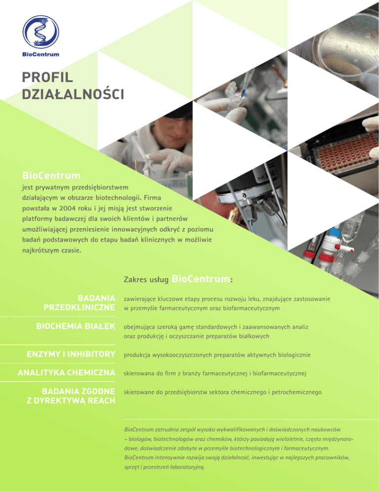 profil działalności BioCentrum jest prywatnym przedsiębiorstwem działającym w obszarze biotechnologii. Firma powstała w 2004 roku i jej misją jest stworzenie platformy badawczej dla swoich klientów i partnerów umożliwiającej przeniesienie innowacyjnych odkryć z poziomu badań podstawowych do etapu badań klinicznych w możliwie najkrótszym czasie. Zakres usług BioCentrum: badania przedkliniczne biochemiA białek ENZYMY I INHIBITORY analityka chemiczna badania zgodne z dyrektywą reach zawierające kluczowe etapy procesu rozwoju leku, znajdujące zastosowanie w przemyśle farmaceutycznym oraz biofarmaceutycznym obejmująca szeroką gamę standardowych i zaawansowanych analiz oraz produkcję i oczyszczanie preparatów białkowych produkcja wysokooczyszczonych preparatów aktywnych biologicznie skierowana do firm z branży farmaceutycznej i biofarmaceutycznej skierowane do przedsiębiorstw sektora chemicznego i petrochemicznego BioCentrum zatrudnia zespół wysoko wykwalifikowanych i doświadczonych naukowców – biologów, biotechnologów oraz chemików, którzy posiadają wieloletnie, często międzynarodowe, doświadczenie zdobyte w przemyśle biotechnologicznym i farmaceutycznym. BioCentrum intensywnie rozwija swoją działalność, inwestując w najlepszych pracowników, sprzęt i przestrzeń laboratoryjną. Nasze indywidualne podejście do potrzeb klientów, profesjonalne zarządzanie projektami oraz zaangażowanie w dostarczenie jak najwyższej jakości produktów i usług, pomogły nam zbudować długotrwałe relacje z wieloma firmami z branży biotechnologicznej i farmaceutycznej. Do grona klientów BioCentrum należą: - międzynarodowe koncerny i firmy: Serva, Jerini, Pfizer, Ratiopharm, Phillip Morris Products, Fermentas, CosmoBio, Mologic, Wita, BioConnect Services - wiodące instytucje naukowe: Instytut Biotechnologii i Antybiotyków, Uniwersytet M. Skłodowskiej-Curie w Lublinie, Uniwersytet w Bristolu, Szkoła Medyczna w Hanowerze - wiodące polskie firmy farmaceutyczne: Adamed, ICN Polfa Rzeszów, Bioton oraz Polpharma. Laboratorium BioCentrum o powierzchni 250 m2 zlokalizowane jest w nowoczesnym parku technologicznym w Krakowie. Przestrzeń pracowni analitycznej, biochemicznej oraz analizy komórkowej wyposażona jest zgodnie z najwyższymi standardami i spełnia wszelkie wymogi stawiane tego typu laboratoriom. Doświadczony zespół naukowców oraz najnowsze i najbardziej zaawansowane wyposażenie gwarantuje najwyższą jakość usług. BioCentrum wyposażone jest między innymi w: laboratorium analityczne system LC/MSn składający się z chromatografu cieczowego (Dionex) oraz spektrometru masowego HCT (Bruker Daltonics) , wysokosprawny system chromatografii cieczowej (HPLC Rapid Separation) z detektorem PDA (Dionex), spektrofotometr UV-VIS (Shimadzu), łaźnia do uwalniania (Hanson Research) Laboratorium biochemiczne sekwenator białek i peptydów (Applied Biosystems), liofilizatory, wirówki, wytrząsarki, termocykler, termomiksery, zamrażarka niskotemperaturowa, naczynia Dewara , sprzęt do elektroforezy białkowej i DNA, testów PAMPA, dyfraktometr rentgenowski (Rigaku) Laboratorium komórkowe komory laminarne (BSL2), wielodetekcyjny czytnik płytek Synergy 2 realizujący pomiary spektrofotometryczne w zakresie UV-VIS oraz pomiary fluorescencji i luminescencji (BioTek), inkubatory CO2 , mikroskop z przystawką fluorescencyjną, zestawem filtrów i aparatem fotograficznym W BioCentrum wdrożony jest system zapewnienia jakości potwierdzony zezwoleniem Głównego Inspektora Farmaceutycznego na wytwarzanie produktów leczniczych w zakresie badań fizykochemicznych. Ponadto, w laboratorium funkcjonuje informatyczny system klasy LIMS (Laboratory Information Management System) firmy STARLIMS Corp., który między innymi zapewnia klientom firmy zdalny dostęp do wyników i raportów dotyczących ich projektów. BioCentrum sp. z o.o. ul. Bobrzyńskiego 14, 30-348 Kraków, POLSKA tel. +48 12 297 47 20 [email protected] www.biocentrum.com.pl