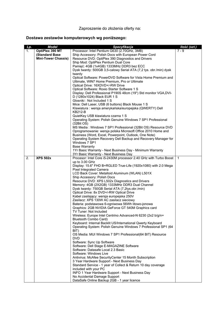 Zaproszenie do złożenia oferty na: Dostawa zestawów komputerowych wg poniższego: Lp. 1. Model OptiPlex 390 MT (Standard Base Mini-Tower Chassis) 2. XPS 502x Specyfikacja Processor: Intel Pentium G630 (2.70GHz, 3MB) Ship Accessory: Polish Docs with European Power Cord Resource DVD: OptiPlex 390 Diagnostics and Drivers Ship Mod: OptiPlex Pentium Dual Core Pamięć: 4GB (1x4GB) 1333MHz DDR3 bez ECC Dysk twardy: 500GB 3,5-calowy Serial ATA (7,2 tys. obr./min) dysk twardy Optical Software: PowerDVD Software for Vista Home Premium and Ultimate, WIN7 Home Premium, Pro or Ultimate Optical Drive: 16XDVD+/-RW Drive Optical Software: Roxio Starter Software 1 S Display: Dell Professional P190S 48cm (19") Std monitor VGA,DVID (1280x1024) Black EUR 1 S Glosniki : Not Included 1 S Mice: Dell Laser, USB (6 buttons) Black Mouse 1 S Klawiatura : wersja amerykańska/europejska (QWERTY) Dell KB212-B QuietKey USB klawiatura czarna 1 S Operating System: Polish Genuine Windows 7 SP1 Professional (32Bit OS) MS Media : Windows 7 SP1 Professional (32Bit OS) Resource DVD Oprogramowanie: wersja polska Microsoft Office 2010 Home and Business (Word, Excel, Powerpoint, Outlook, One Note) Operating System Recovery Dell Backup and Recovery Manager for Windows 7 SP1 Base Warranty 1Yr Basic Warranty - Next Business Day - Minimum Warranty 3Yr Basic Warranty - Next Business Day Procesor: Intel Core i5-2430M processor 2.40 GHz with Turbo Boost up to 3.00 GHz Display: 15.6" FHD B+RGLED True-Life (1920x1080) with 2.0 Mega Pixel Integrated Camera LCD Back Cover: Metalloid Aluminum (WLAN) L501X Ship Accessory: Polish Docs Resource DVD: XPS L502x Diagnostics and Drivers Memory: 4GB (2X2GB) 1333MHz DDR3 Dual Channel Dysk twardy: 750GB Serial ATA (7,2tys.obr./min) Optical Drive: 8x DVD+/-RW Optical Drive Kabel zasilający: wersja europejska 250V Zasilacz: XPS 130W AC zasilacz sieciowy Bateria: podstawowa 6-ogniwowa 56Wh litowo-jonowa Graphics: 2GB NVIDIA GeForce GT 540M Graphics card TV Tuner: Not Included Wireless: Europe Intel Centrino Advanced-N 6230 (2x2 b/g/n+ Bluetooth Combo Card) Keyboard: Internal Backlit US/International Qwerty Keyboard Operating System: Polish Genuine Windows 7 Professional SP1 (64 BIT) OS Media: MUI Windows 7 SP1 Professional(64 BIT) Resource DVD Software: Sync Up Software Software: Dell Stage E-MAGAZINE Software Software: Datasafe Local 2.3 Basic Software: Windows Live Antivirus: McAfee SecurityCenter 15 Month Subscription 3 Year Hardware Support - Next Business Day Standard Service - 1 year of Collect & Return 10 day coverage included with your PC INFO 1 Year Hardware Support - Next Business Day No Accidental Damage Support DataSafe Online Backup 2GB - 1 year licence Ilość (szt.) 7-9 1 Software: DataSafe Online Backup 2GB - 1 year trial Oprogramowanie: wersja polska Microsoft Office 2010 Home and Business (Word, Excel, Powerpoint, Outlook, One Note) Carry Case: Targus Czarna torba do notebooka 15,6'' Meridian II Toploading W ofercie należy podać cenę brutto, termin dostawy (14 dni od daty zamówienia) oraz termin związania ofertą (30 dni). Do oferty należy dołączyć kserokopię dokumentu potwierdzającego prowadzenie działalności gospodarczej w przedmiotowym zakresie. Oferty, w zamkniętej kopercie podając nazwę wykonawcy i zapis „Dostawa zestawów komputerowych”, należy składać do godz. 12.00 dnia 12.12.2011r. w pok. 112 (Sekretariat Zastępców Burmistrza). Uwaga: 1. Do wyżej wymienionego zamówienia nie stosuje się ustawy Prawo zamówień publicznych. 2. Zamawiający zastrzega sobie prawo do unieważnienia postępowania bez podania przyczyn, do odrzucenia oferty lub ofert z podaniem uzasadnienia oraz do prowadzenia dalszych negocjacji z oferentem lub oferentami.