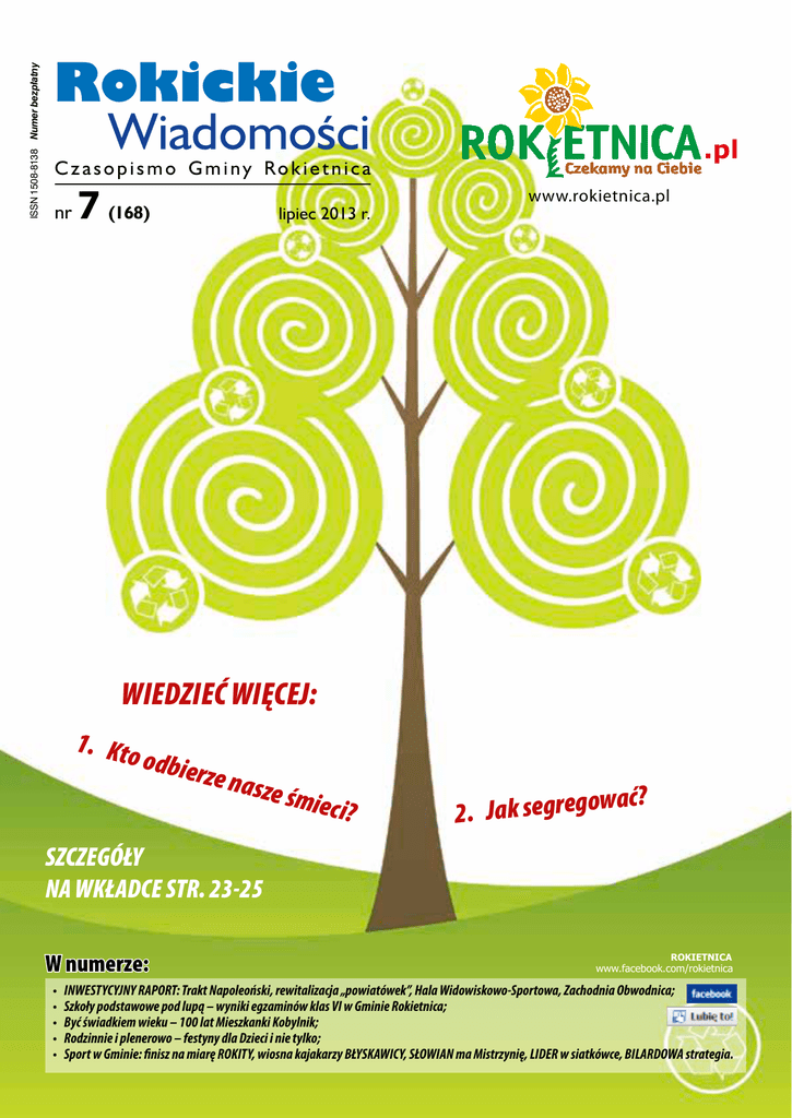 ISSN 1508-8138 Numer bezpłatny Rokickie Wiadomości Czasopismo Gminy Rokietnica nr 7 (168) lipiec 2013 r. www.rokietnica.pl WIEDZIEĆ WIĘCEJ: 1. Kto odbier ze nas ze śmi eci? ? ać 2. Jak segregow SZCZEGÓŁY NA WKŁADCE STR. 23-25 W numerze: • • • • • ROKIETNICA www.facebook.com/rokietnica INWESTYCYJNY RAPORT: Trakt Napoleoński, rewitalizacja „powiatówek”, Hala Widowiskowo-Sportowa, Zachodnia Obwodnica; Szkoły podstawowe pod lupą – wyniki egzaminów klas VI w Gminie Rokietnica; Być świadkiem wieku – 100 lat Mieszkanki Kobylnik; Rodzinnie i plenerowo – festyny dla Dzieci i nie tylko; Sport w Gminie: finisz na miarę ROKITY, wiosna kajakarzy BŁYSKAWICY, SŁOWIAN ma Mistrzynię, LIDER w siatkówce, BILARDOWA strategia. Drodzy Czytelnicy! Czerwiec zdobny we wszystko to, czym przyroda potrafi zachwycić, zawsze niósł ze sobą optymizm. Wywoływany myślą o czasie przerwy w rocznym cyklu zmagań i tysiąca zajęć, oprócz odkrywanych na nowo i jedynych w swoim rodzaju zapachów i dźwięków lata, wydobywa pokłady przychylności i ludzkiego solidaryzmu. Gdzieś głęboko ukryte na co dzień, jakby w obawie przed niepożądaną otwartością , kojarzoną mylnie z infantylizmem, stają się dziwnie bliskie, by nie powiedzieć niezbędne. Poszukiwanie wspólnych odniesień, zastępowanie kontrastów nagle bez trudu i z pasją odkrywanymi wspólnymi korzeniami, jest namiętnie celebrowanym zwyczajem. Zwłaszcza podczas zagranicznych wojaży. Wtedy każdy Polak to brat, dziedzic chrześcijańskich wartości i spadkobierca wielowiekowej europejskiej tradycji. Jakby za dotknięciem czarodziejskiej różdżki na plan dalszy odchodzą małe spory i waśnie. Wszystko bowiem czym jesteśmy zdecydowanie bardziej nas łączy, niż dzieli. Dlaczego jednak tylko na chwilę? Prezydent Komorowski podjął w tym roku, właśnie w czerwcu, w rocznicę pamiętnych wyborów z 1989 r., przypadających w 4. dzień tego miesiąca, próbę zbudowania identyfikowalnej dla wszystkich i teoretycznie przez nikogo niekrytykowanej wartości. Jej ideą jest przeświadczenie o łączącym nas wszystkich szacunku dla wolności. Stąd Święto Wolności właśnie, trochę wykreowane, trochę wywołujące zdziwienie. Budzące pytanie o powód wyróżnienia właśnie tego wydarzenia spośród wielu innych, może bardziej bezsprzecznych? Po co jednak pytać – zaakceptujmy zwyczajnie ten dzień jako symbol. Bezkrwawych zmian, optymizmu, początku nowej rzeczywistości, w której zamiast waśni i sporów o przywilej definiowania wolności, zaczniemy na jej fundamencie tworzyć wspólną przestrzeń. Miejsce w niej powinno znaleźć się dla każdego, bez względu na przekonania tego, kto dzięki przywilejowi wolności uzyskał demokratyczny mandat do sprawowania władzy. Zapraszam do lektury. Danuta Potrawiak Redaktor Naczelny „Rokickich Wiadomości” Rokietnica PO RAZ VI zaprasza na RUMPUĆ Już 7 września 2013 roku GOTUJĄ się niezapomniane wrażenia. Na znanym i lubianym placu za Stacją „BLISKA”, u zbiegu ulicy Szkolnej z Traktem Napoleońskim w Rokietnicy, szykuje się wielkie Z(a)MIESZANIE. ZGOTUJEMY mnóstwo kulturalnych i kulinarnych atrakcji, PRZYPRAWIAJĄC naszych Gości o szybsze bicie serc. ZASMAKUJEMY w niepowtarzalnej atmosferze plenerowej zabawy, DELEKTUJĄC się jedynym w swoim rodzaju widowiskiem. Mając APETYT na ponowne spotkanie w plenerze ROKIETNICA GORĄCO ZAPRASZA NA RUMPUĆ, który ODKRYJE przed nami swoje największe tajemnice! SKOSZTUJEMY RUMPUCIA z jajem – w KABARETOWEJ OPRAWIE I TOWARZYSTWIE. CZERPIĄC z bogactwa sołeckich stoisk, naturalnej radości i PARY, z jaką BUZUJĄ emocje. PrzyGOTUJCIE się na niezapomniane wrażenia muzyczne i konkursowe, DOPRAWIONE szczyptą humoru, garścią uśmiechu i wzajemnej życzliwości. „Chochliczny” i „garncarski” RUMPUĆ przyRZĄDZI… naGMINNIE bestSELEROWĄ imprezę! Zapraszamy do współpracy organizacyjnej i sponsorskiej wszystkich fanów RUMPUCiowej fiesty KONTAKT I WSZELKIE INFORMACJE: Katarzyna Filipowiak- Łuczyńska mł. inspektor ds. organizacji i współpracy tel. (61) 89 60 619 kom. 691 293 022 e-mail: [email protected] www.rokietnica.pl Rokickie Wiadomości Wydawca: Gmina Rokietnica Adres: ul. Golęcińska 1, 62-090 Rokietnica, tel 61-89-60-614 Redaktor naczelny: Danuta Potrawiak zaprasza codziennie w godzinach pracy Urzędu Gminy Zespół redakcyjny: Ryszard Lubka, Katarzyna Filipowiak-Łuczyńska, Anna Skrzypiec Współpraca: Anna Adamkiewicz, Gabrysia Anglart, Alicja Ankudowicz, Radosław Babica, L. Bigos, Magdalena Błaszczyk, M. Budzicz, Maria Cierpikowska, Maria Chojnacka, Arkadiusz Chołżyński, Michał Cieciora, K. Czyż, Andrzej Deckert, Katarzyna Dobrochowska - Łopuch, Malwina Dokowicz, M. Dubas, Magdalena Dziel - Sierszuła, Katarzyna Filipowiak - Łuczyńska, Kazimierz Fryś, Joanna Gawenda - Wróblewska, Robert Górny, Piotr Hałas, Jagoda Haussa, Izabela Janeczek - Płóciennik, Piotr Janowski, Bogdan Andrzej Jeran, Anna Kamińska, Sylwia Kiejnich, Celina Kiełbasiewicz, Joanna Kriger - Bronowicka, Beata Kucharska, Ks. Maciej Kweiser, Ewa Lepsza, Róża Lubka, Edyta Łuckiewicz - Laskowska, Sławomir Machaj, Filip Mazur, Joanna Miecznik, Lidia Napierała, Jacek Olejniczak, Michał Piszora, Anna Politowicz - Piszora, Michał Potrawiak, Daniel Powałowski, Krystyna Semba, Agnieszka Sip, Anna Skrzypiec, A. Smólska - Radziejczak, I. Speina, Kazimierz Szulc, Emilia Świst, Katarzyna Trojan, A. Tylczyńska, Małgorzata Urbanowicz, Aneta Wendland, Karolina Władysiak, Halina Wroniecka, D. Zalewska lipiec 2013 Zadanie na wakacje. „TRAKTując rzecz OBIEKTYWnie”, czyli doroczny Konkurs Fotograficzny... Szczegóły regulaminu i niezbędne informacje na www.rokietnica.pl, zakładka KONKURSY oraz pod nr telefonu: (61) 89 60 619 i adresem mailowym: [email protected]. Redakcja zastrzega sobie prawo do skrótu i opracowywania materiałów. Za treść reklam i ogłoszeń redakcja nie odpowiada