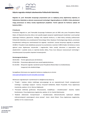 Gdynia, 29.03.2016 r. Gdynia nagradza młodych absolwentów Politechniki Gdańskiej Nagroda im. prof. Romualda Szczęsnego przyznawana jest za najlepszą pracę dyplomową napisaną na Politechnice Gdańskiej w zakresie nowoczesnych technologii. Nagroda główna to 10.000 zł, którą absolwenci mogą przeznaczyć na dalszy rozwój nagrodzonych projektów. Termin zgłoszeń do Konkursu upływa 30 kwietnia 2016 r. O konkursie Prestiżowa Nagroda im. prof. Romualda Szczęsnego fundowana jest od 2002 roku przez Prezydenta Miasta Gdyni, dr Wojciecha Szczurka, który w ten sposób pragnie wesprzeć najzdolniejszych studentów i uczcić pamięć wybitnego Profesora, gdynianina. Każdego roku Kapituła Konkursu, w skład której wchodzą profesorowie Politechniki Gdańskiej oraz przedstawiciel Pomorskiego Parku Naukowo-Technologicznego Gdynia, przestawia Prezydentowi ranking prac nominowanych do nagrody i wyróżnień. Laureat otrzymuje nagrodę w wysokości 10.000 zł. Prezydent może dodatkowo przyznać trzy wyróżnienia o wartości 3.000 zł każde. Do Konkursu można zgłaszać prace dyplomowe inżynierskie i magisterskie, które zostały obronione w poprzednim roku akademickim i uzyskały ocenę co najmniej bardzo dobrą. Praca musi dotyczyć nowoczesnych technologii i charakteryzować się wysokim stopniem innowacyjności. Harmonogram Konkursu 30.04.2016 - Termin zgłaszania prac do Konkursu. 07.06.2016 - Prezentacja zgłoszonych prac przed kapitułą Konkursu. 01.10.2016 - Wręczenie nagrody i wyróżnień przez Prezydenta Miasta Gdyni na środowiskowej inauguracji roku akademickiego. Szczegółowe informacje oraz regulamin konkursu znajdują się na stronie: www.ppnt.pl/nagroda-im-prof-romualda-szczesnego Wśród prac nagrodzonych i wyróżnionych w ubiegłorocznej edycji są: "Projekt i budowa robota mobilnego poruszającego się po napowietrznych liniach energetycznych średniego i wysokiego napięcia". Autorzy: Krzysztof Giełdziński, Robert Przystalski. Praca dyplomowa inżynierska, opiekun: dr inż. Mariusz Dąbkowski. "Porowate elektrody grafenowe. Otrzymywanie, modyfikacje i charakterystyka". Autorka: Izabela Kondratowicz. Praca dyplomowa magisterska, opiekun: dr inż. Kamila Żelechowska "Badanie właściwości transportowych i charakterystyka mikrostrukturalna wybranych układów mikroemulsyjnych zawierających ciecze jonowe". Autor: Jakub Piekart. Praca dyplomowa magisterska, opiekun: dr inż. Justyna Łuczak. Gdynia, 29.03.2016 r. "Aplikacja na urządzenia mobilne wspomagająca wstępną diagnostykę schorzenia AMD – zwyrodnienia plamki żółtej". Autorka: Alicja Kwaśniewska. Praca dyplomowa inżynierska, opiekun: dr inż. Jacek Rumiński. Romuald Szczęsny Wybitny Gdynianin, ukończył Wydział Elektroniki Politechniki Gdańskiej. Bezpośrednio po uzyskaniu dyplomu w 1968 roku rozpoczął pracę na Wydziale Elektrycznym PG, jako asystent w Katedrze Napędu Elektrycznego. Jednocześnie studiował matematykę na Uniwersytecie Warszawskim. Jego doktorat i pionierskie prace badawcze koncentrowały się w zakresie modelowania i symulacji układów energoelektronicznych. Swoje doświadczenie dydaktyczne wzbogacił podczas pięcioletniej pracy na Uniwersytecie Technicznym USTO w Oranie, w Algierii. Profesor Romuald Szczęsny był propagatorem współpracy międzynarodowej; osobiście prowadził ścisłą współpracę naukową z Instytutem Politechnicznym w Tuluzie we Francji. Jest autorem wybitnej monografii pt. „Komputerowa symulacja układów energoelektronicznych”. Jest współautorem pakietu symulacji układów energoelektronicznych TCAD, który stał się narzędziem badawczo-projektowym w licznych uczelniach i instytutach. Jako kierownik Katedry Energoelektroniki i Maszyn Elektrycznych, a jednocześnie prodziekan ds. nauki w kadencji 1996-1999, a następnie dziekan Wydziału Elektrotechniki i Automatyki PG wyróżnił się nadzwyczajną otwartością na sprawy współpracowników, pogodą ducha, odwagą i pracowitością. Kontakt dla mediów Michał Rybak [email protected] tel. kom. +48 512 585 035, tel. +48 58 698 21 26 www.ppnt.pl