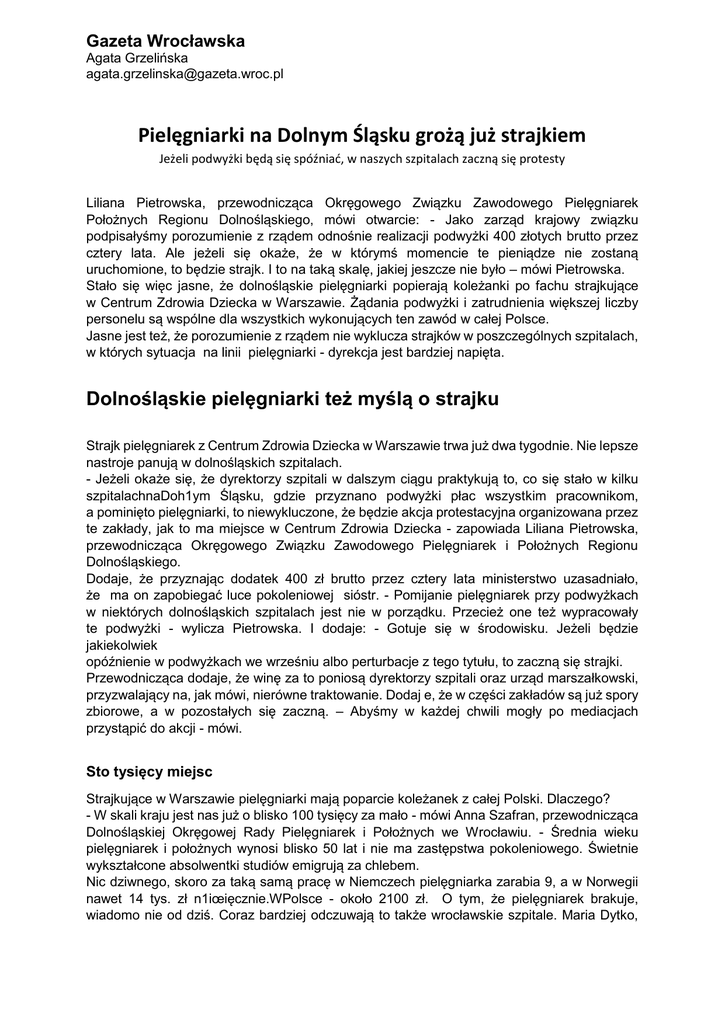 artykuł z gazety wrocławskiej na temat zatrudnienia pielęgniarek na