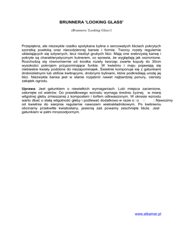 BRUNNERA 'LOOKING GLASS' (Brunnera 'Looking Glass') Przepiękna, ale niezwykle rzadko spotykana bylina o sercowatych liściach pokrytych szorstką powłoką oraz niecodziennej barwie i formie. Tworzy rozety regularnie układających się sztywnych, lecz niezbyt grubych liści. Mają one srebrzystą barwę i pokryte są charakterystycznym kutnerem, co sprawia, że wyglądają jak oszronione. Rozchodzą się równomiernie od środka rozety tworząc zwarte kopuły do 30cm wysokości pokrojem przypominające funkie. W kwietniu i maju pojawiają się niebieskie kwiaty podobne do niezapominajek. Świetnie komponuje się z gatunkami drobnolistnymi lub obficie kwitnącymi, drobnymi bylinami, które podkreślają urodę jej liści. Niezwykła barwa jest w stanie rozjaśnić nawet najbardziej ponury, cienisty zakątek ogrodu. Uprawa: Jest gatunkiem o niewielkich wymaganiach. Lubi miejsca zacienione, osłonięte od wiatrów. Do prawidłowego wzrostu wymaga średnio żyznej, w miarę wilgotnej gleby zmieszanej z kompostem i torfem odkwaszonym. W okresie wzrostu warto dbać o stałą wilgotność gleby i podlewać dodatkowo w razie oMo MNawozimy od kwietnia do sierpnia regularnie nawozem wieloskładnikowym. Po kwitnieniu obcinamy przekwitłe kwiatostany, jesienią zaś powamy zeschnięte liście. Jest gatunkiem w pełni mrozoodpornym. www.albamar.pl