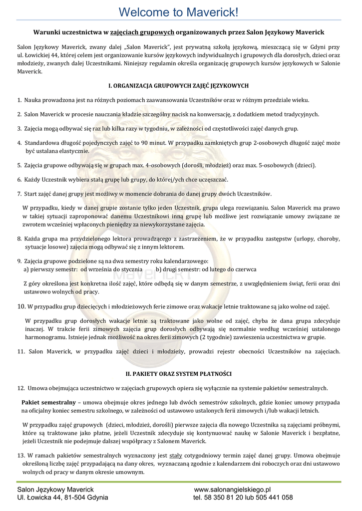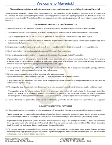 Welcome to Maverick! Warunki uczestnictwa w zajęciach grupowych organizowanych przez Salon Językowy Maverick Salon Językowy Maverick, zwany dalej „Salon Maverick”, jest prywatną szkołą językową, mieszczącą się w Gdyni przy ul. Łowickiej 44, której celem jest organizowanie kursów językowych indywidualnych i grupowych dla dorosłych, dzieci oraz młodzieży, zwanych dalej Uczestnikami. Niniejszy regulamin określa organizację grupowych kursów językowych w Salonie Maverick. I. ORGANIZACJA GRUPOWYCH ZAJĘĆ JĘZYKOWYCH 1. Nauka prowadzona jest na różnych poziomach zaawansowania Uczestników oraz w różnym przedziale wieku. 2. Salon Maverick w procesie nauczania kładzie szczególny nacisk na konwersację, z dodatkiem metod tradycyjnych. 3. Zajęcia mogą odbywać się raz lub kilka razy w tygodniu, w zależności od częstotliwości zajęć danych grup. 4. Standardowa długość pojedynczych zajęć to 90 minut. W przypadku zamkniętych grup 2-osobowych długość zajęć może być ustalana elastycznie. 5. Zajęcia grupowe odbywają się w grupach max. 4-osobowych (dorośli, młodzież) oraz max. 5-osobowych (dzieci). 6. Każdy Uczestnik wybiera stałą grupę lub grupy, do której/ych chce uczęszczać. 7. Start zajęć danej grupy jest możliwy w momencie dobrania do danej grupy dwóch Uczestników. W przypadku, kiedy w danej grupie zostanie tylko jeden Uczestnik, grupa ulega rozwiązaniu. Salon Maverick ma prawo w takiej sytuacji zaproponować danemu Uczestnikowi inną grupę lub możliwe jest rozwiązanie umowy związane ze zwrotem wcześniej wpłaconych pieniędzy za niewykorzystane zajęcia. 8. Każda grupa ma przydzielonego lektora prowadzącego z zastrzeżeniem, że w przypadku zastępstw (urlopy, choroby, sytuacje losowe) zajęcia mogą odbywać się z innym lektorem. 9. Zajęcia grupowe podzielone są na dwa semestry roku kalendarzowego: a) pierwszy semestr: od września do stycznia b) drugi semestr: od lutego do czerwca Z góry określona jest konkretna ilość zajęć, które odbędą się w danym semestrze, z uwzględnieniem świąt, ferii oraz dni ustawowo wolnych od pracy. 10. W przypadku grup dziecięcych i młodzieżowych ferie zimowe oraz wakacje letnie traktowane są jako wolne od zajęć. W przypadku grup dorosłych wakacje letnie są traktowane jako wolne od zajęć, chyba że dana grupa zdecyduje inaczej. W trakcie ferii zimowych zajęcia grup dorosłych odbywają się normalnie według wcześniej ustalonego harmonogramu. Istnieje jednak możliwość na okres ferii zimowych (2 tygodnie) zawieszenia uczestnictwa w grupie. 11. Salon Maverick, w przypadku zajęć dzieci i młodzieży, prowadzi rejestr obecności Uczestników na zajęciach. II. PAKIETY ORAZ SYSTEM PŁATNOŚCI 12. Umowa obejmująca uczestnictwo w zajęciach grupowych opiera się wyłącznie na systemie pakietów semestralnych. Pakiet semestralny – umowa obejmuje okres jednego lub dwóch semestrów szkolnych, gdzie koniec umowy przypada na oficjalny koniec semestru szkolnego, w zależności od ustawowo ustalonych ferii zimowych i/lub wakacji letnich. W przypadku zajęć grupowych (dzieci, młodzież, dorośli) pierwsze zajęcia dla nowego Uczestnika są zajęciami próbnymi, które są traktowane jako płatne, jeżeli Uczestnik zdecyduje się kontynuować naukę w Salonie Maverick i bezpłatne, jeżeli Uczestnik nie podejmuje dalszej współpracy z Salonem Maverick. 13. W ramach pakietów semestralnych wyznaczony jest stały cotygodniowy termin zajęć danej grupy. Umowa obejmuje określoną liczbę zajęć przypadającą na dany okres, wyznaczaną zgodnie z kalendarzem dni roboczych oraz dni ustawowo wolnych od pracy w danym okresie umownym. Salon Językowy Maverick Ul. Łowicka 44, 81-504 Gdynia www.salonangielskiego.pl tel. 58 350 81 20 lub 505 441 058 Welcome to Maverick! 14. Płatność za pojedynczy semestr dokonywana jest jednorazowo przed rozpoczęciem zajęć lub w systemie ratalnym (dwie lub cztery raty). W przypadku braku dokonania stosownych płatności przez Uczestnika, Salon Maverick ma prawo przerwać prowadzenie kursu danemu Uczestnikowi w ramach danego pakietu. Umowa jest zawsze podpisywana minimum na okres trwający do końca danego semestru, w którym dana osoba dołączyła do grupy. Istnieje możliwość dołączenia do grupy w ciągu całego roku szkolnego. W takim przypadku płatność za kurs jest wyliczana indywidualnie. 15. Wszystkie zajęcia objęte umową są pełnopłatne niezależnie od obecności danej osoby na konkretnych zajęciach. 16. W przypadku wyboru zajęć grupowych prowadzonych przez native speaker’a, Salon Maverick ma prawo przeprowadzić część zajęć w ramach danego semestru z polskim lektorem (w wypadku chorób, urlopów, czynników niezależnych). 17. W przypadku wyboru zajęć grupowych prowadzonych przez polskiego lektora, część zajęć może, ale nie musi, odbyć się z native speakerem. 18. Lektorzy prowadzący są dobierani do danej grupy pod kątem ogólnej dostępności czasowej oraz logistycznej lektorów. 19. W przypadku stałej zmiany lektora prowadzącego (przyczyny losowe, niezależne od Salonu Maverick, zmiana miejsca zamieszkania lektora itd.), Uczestnik nie ma możliwości rezygnacji z umowy i zwrotu pieniędzy za niewykorzystane zajęcia. Do prowadzenia zajęć danej grupy zostaje przydzielony inny lektor. III. ZASADY ODRABIANIA GRUPOWYCH ZAJĘĆ JĘZYKOWYCH 20. Wszystkie ustalenia formalne muszą odbywać się z pracownikami Biura lub przez wybrany wspólnie przez Uczestnika oraz Salon Maverick kanał komunikacji (sms, email, telefon). Ustalenia z lektorami nie będą uznawane jako wiążące. 21. Oficjalne godziny pracy Biura to 9.00-19.00 od poniedziałku do czwartku oraz 9.00-15.00 w piątki. Adres email Salonu Maverick: [email protected]; numer kontaktowy komórkowy: 505 441 058. 22. W przypadku zajęć odbywających się poza oficjalnymi godzinami pracy Biura, wszystkie kwestie dotyczące terminów odrabian