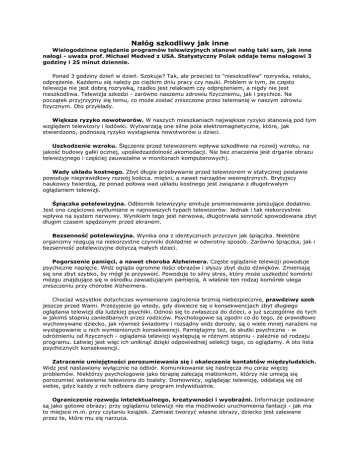 Nałóg szkodliwy jak inne Wielogodzinne oglądanie programów telewizyjnych stanowi nałóg taki sam, jak inne nałogi - uwaŜa prof. Michael Medved z USA. Statystyczny Polak oddaje temu nałogowi 3 godziny i 25 minut dziennie. Ponad 3 godziny dzień w dzień. Szokuje? Tak, ale przecieŜ to "nieszkodliwa" rozrywka, relaks, odpręŜenie. KaŜdemu się naleŜy po cięŜkim dniu pracy czy nauki. Problem w tym, Ŝe często telewizja nie jest dobrą rozrywką, rzadko jest relaksem czy odpręŜeniem, a nigdy nie jest nieszkodliwa. Telewizja szkodzi - zarówno naszemu zdrowiu fizycznemu, jak i psychice. Na początek przyjrzyjmy się temu, co moŜe zostać zniszczone przez telemanię w naszym zdrowiu fizycznym. Oto przykłady. Większe ryzyko nowotworów. W naszych mieszkaniach największe ryzyko stanowią pod tym względem telewizory i lodówki. Wytwarzają one silne pola elektromagnetyczne, które, jak stwierdzono, podnoszą ryzyko wystąpienia nowotworów u dzieci. Uszkodzenie wzroku. Ślęczenie przed telewizorem wpływa szkodliwie na rozwój wzroku, na jakość budowy gałki ocznej, upośledzazdolność akomodacji. Nie bez znaczenia jest drganie obrazu telewizyjnego i częściej zauwaŜalne w monitorach komputerowych). Wady układu kostnego. Zbyt długie przebywanie przed telewizorem w statycznej postawie powoduje nieprawidłowy rozwój koścca. mięśni, a nawet narządów wewnętrznych. Brytyjscy naukowcy twierdzą, Ŝe ponad połowa wad układu kostnego jest związana z długotrwałym oglądaniem telewizji. Śpiączka potelewizyjna. Odbiornik telewizyjny emituje promieniowanie jonizujące dodatnio. Jest ono częściowo wytłumiane w najnowszych typach telewizorów. Jednak i tak niekorzystnie wpływa na system nerwowy. Wynikiem tego jest nerwowa, długotrwała senność spowodowana zbyt długim czasem spędzonym przed ekranem. Bezsenność potelewizyjna. Wynika ona z identycznych przyczyn jak śpiączka. Niektóre organizmy reagują na niekorzystne czynniki dokładnie w odwrotny sposób. Zarówno śpiączka, jak i bezsenność potelewizyjne dotyczą małych dzieci. Pogorszenie pamięci, a nawet choroba Alzheimera. Częste oglądanie telewizji powoduje psychiczne napięcie. Widz ogląda ogromne ilości obrazów i słyszy zbyt duŜo dźwięków. Zmieniają się one zbyt szybko, by mógł je przyswoić. Powoduje to silny stres, który moŜe uszkodzić komórki mózgu znajdujące się w ośrodku zawiadującym pamięcią. A właśnie ten rodzaj komórek ulega zniszczeniu przy chorobie Alzheimera. ChociaŜ wszystkie dotychczas wymienione zagroŜenia brzmią niebezpiecznie, prawdziwy szok jeszcze przed Wami. PrzeŜyjecie go wtedy, gdy dowiecie się o konsekwencjach zbyt długiego oglądania telewizji dla ludzkiej psychiki. Odnosi się to zwłaszcza do dzieci, a juŜ szczególnie do tych w jakimś stopniu zaniedbanych przez rodziców. Psychologowie są zgodni co do tego, Ŝe prawidłowo wychowywane dziecko, jak równieŜ świadomy i rozsądny widz dorosły, są o wiele mniej naraŜeni na występowanie u nich wymienionych konsekwencji. Pamiętajmy teŜ, Ŝe skutki psychiczne - w odróŜnieniu od fizycznych - oglądania telewizji występują w róŜnym stopniu - zaleŜnie od rodzaju programu. Łatwiej jest więc ich uniknąć dzięki odpowiedniej selekcji tego, co oglądamy. A oto lista psychicznych konsekwencji. Zatracenie umiejętności porozumiewania się i okaleczenie kontaktów międzyludzkich. Widz jest nastawiony wyłącznie na odbiór. Komunikowanie się nastręcza mu coraz więcej problemów. Niektórzy psychologowie jako terapię zalecają małŜonkom, którzy nie umieją się porozumieć wstawienie telewizora do toalety. Domownicy, oglądając telewizję, oddalają się od siebie, gdyŜ kaŜdy z nich odbiera dany program indywidualnie. Ograniczenie rozwoju intelektualnego, kreatywności i wyobraźni. Informacje podawane są jako gotowe obrazy; przy oglądaniu telewizji nie ma moŜliwości uruchomienia fantazji - jak ma to miejsce m.in. przy czytaniu ksiąŜek. Zamiast tworzyć własne obrazy, dziecko jest zalewane przez te, które mu się narzuca. Nerwice. Znany jest przypadek 300 japońskich dzieci, które musiały być poddane hospitalizacji po obejrzeniu w telewizji jednej z kreskówek. Efekty "widz" i "ofiara". U nie których dzieci oglądających telewizję w nadmiarze, zwłaszcza nieodpowiednie programy, mogą wykształcić się pewne mechanizm). Oglądając zbyt duŜo przemocy na ekranie, dziecko moŜe się na nią zobojętnić (zjawisko desensytyzacji) w prawdziwym Ŝyciu (efekt "widz"). Lub tez moŜe Ŝyć w ciągłym strachu, uwaŜając, Ŝe natęŜenie przemocy w Ŝyciu jest takie jak w telewizji (efekt "ofiara"). Zakłócenie poczucia czasu. Sami znacie pewnie to uczucie: "To juŜ dwie godziny tu ślęczę?!" Wzrost agresji. Tego chyba nie trzeba komentować, widząc hektolitry krwi na naszych ekranach. Zbyt długie przesiadywanie przed telewizorem to takŜe często brak poczucia bezpieczeństwa, osamotnienie, kreowanie fałszywego obrazu świata, znudzenie rzeczywistością, w której brak ciągłych wybuchów, dramatów, namiętności czy rozbudzenie nierealnych pragnień. Wszystkie te zagroŜenia sprawiły, Ŝe bronimy się - w róŜnym stopniu - przed nadmiarem telewizji w naszym Ŝyciu. Ma to róŜne oblicza, niektórzy rezygnują z posiadania telewizora, niektórzy zabraniają dzieciom jego oglądania, niektórzy walczą z nałogiem ograniczając sobie czas spędzony przez szklanym pudełkiem, niektórzy wreszcie publicznie protestują przeciwko konkretnym programom. KaŜdy sposób jest dobry, gdyŜ - jak sami widzicie - lista zagroŜeń jest długa. Katarzyna Urban Tekst pochodzi z Tygodnika Młodziezy Katolickiej