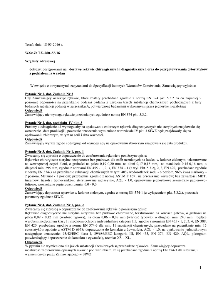 Toruń, dnia 18-05-2016 r. W.Sz.Z: TZ–280–55/16 W/g listy adresowej dotyczy: postępowania na dostawę rękawic chirurgicznych i diagnostycznych oraz do przygotowywania cytostatyków z podziałem na 6 zadań W związku z otrzymanymi zapytaniami do Specyfikacji Istotnych Warunków Zamówienia, Zamawiający wyjaśnia: Pytanie Nr 1, dot. Zadania Nr 3 Czy Zamawiający oczekuje rękawic, które zostały przebadane zgodnie z normą EN 374 pkt. 5.3.2 na co najmniej 2 poziomie odporności na przenikanie podczas badania z użyciem trzech substancji chemicznych pochodzących z listy badanych substancji podanej w załączniku A, potwierdzone badaniami wykonanymi przez jednostkę niezależną? Odpowiedź Zamawiający nie wymaga rękawic przebadanych zgodnie z normą EN 374 pkt. 5.3.2. Pytanie Nr 2, dot. rozdziału IV pkt. 3 Prosimy o odstąpienie od wymogu aby na opakowaniu zbiorczym rękawic diagnostycznych nie sterylnych znajdowało się oznaczenie „data produkcji”, pozostałe oznaczenia wymienione w rozdziale IV pkt. 3 SIWZ będą znajdowały się na opakowaniu zbiorczym, w tym nr serii i data ważności. Odpowiedź Zamawiający wyraża zgodę i odstępuje od wymogu aby na opakowaniu zbiorczym znajdowała się data produkcji. Pytanie Nr 3, dot. Zadania Nr 1, poz. 1 Zwracamy się z prośbą o dopuszczenie do zaoferowania rękawic o poniższym opisie: Rękawice chirurgiczne sterylne neoprenowe bez pudrowe, dla osób uczulonych na lateks, w kolorze zielonym, teksturowane na wewnętrznej części dłoni, o grubości na palcu 0,19-0,20 mm, na dłoni 0,17-0,18 mm, na mankiecie 0,15-0,16 mm, o długości min. 295 mm, zgodne z normami EN 455 - 1, 2, 3, EN 374 – 1 (z wył. Pkt. 5.3.2), 2, 3, EN 420, przebadane zgodnie z normą EN 374-3 na przenikanie substancji chemicznych w tym: 40% wodorotlenek sodu - 6 poziom, 96% kwas siarkowy 2 poziom, Metanol - 1 poziom; przebadane zgodnie z normą ASTM F 1671 na przenikanie wirusów; bez zawartości MBT, tiuramów, tiazoli i tiomoczników; sterylizowane radiacyjnie, AQL - 1,0, opakowanie jednostkowe zewnętrzne papierowofoliowe, wewnętrzne papierowe, rozmiar 6,0 - 9,0. Odpowiedź Zamawiający dopuszcza rękawice w kolorze zielonym, zgodne z normą EN-374-1 (z wyłączeniem pkt. 5.3.2.), pozostałe parametry zgodne z SIWZ. Pytanie Nr 4, dot. Zadania Nr 1, poz. 2 Zwracamy się z prośbą o dopuszczenie do zaoferowania rękawic o poniższym opisie: Rękawice diagnostyczne nie sterylne nitrylowe bez pudrowe chlorowane, teksturowane na końcach palców, o grubości na palcu 0,09 - 0,12 mm (wartość typowa), na dłoni 0,06 - 0,08 mm (wartość typowa); o długości min. 240 mm; będące wyrobem medycznym klasy I i środkiem ochrony indywidualnej kategorii III, zgodne z normami EN 455 - 1, 2, 3, 4, EN 388, EN 420, przebadane zgodnie z normą EN 374-3 dla min. 11 substancji chemicznych, przebadane na przenikanie min. 15 cytostatyków zgodnie z ASTM D 6978; dopuszczone do kontaktu z żywnością, AQL - 1,0; na opakowaniu jednostkowym następujące oznaczenie: 93/42/EEC klasa I, 89/686/EEC kategoria III, EN 455, EN 374, EN 420, AQL, piktogram potwierdzający dopuszczenie do kontaktu z żywnością, rozmiar XS – XL. Odpowiedź W pytaniu nie wymieniono dla jakich substancji chemicznych są przebadane rękawice. Zamawiający dopuszcza możliwość zaoferowania opisanych rękawic pod warunkiem, że są przebadane zgodnie z normą EN 374-3 dla substancji wymienionych przez Zamawiającego w SIWZ. 1 Pytanie Nr 5, dot. Zadania Nr 1, poz. 3 Zwracamy się z prośbą o dopuszczenie do zaoferowania rękawic o poniższym opisie: Rękawice chirurgiczne sterylne lateksowe pudrowane, w kolorze naturalnego lateksu, teksturowane na wewnętrznej części dłoni, o grubości na palcu 0,22-0,23 mm, na dłoni 0,20 mm, na mankiecie 0,19 mm, o długości min. 285 mm, będące wyrobem medycznym klasy I i środkiem ochrony indywidualnej kategorii III, zgodne z normami EN 455 - 1, 2, 3, 4; przebadane zgodnie z normą EN 374-3 na przenikanie min. 3 substancji chemicznych; bez zawartości MBT, tiuramów; poziom protein lateksowych < 60 ug/g, sterylizowane radiacyjnie, poziom AQL - 1,0; rozmiar rękawicy naniesiony bezpośrednio na rękawicy, opakowanie jednostkowe zewnętrzne papierowo-foliowe, wewnętrzne papierowe; na opakowaniu jednostkowym następujące oznaczenie: 93/42/EEC; 2007/42/EC klasa IIa, 89/686/EEC kategoria III, EN 455, EN 374, EN 420; rozmiar 6,0 - 9,0. Odpowiedź Zamawiający podtrzymuje wymogi zawarte w SIWZ. Pytanie Nr 6, dot. Zadania Nr 2, poz. 1 Zwracamy się z prośbą o dopuszczenie do zaoferowania rękawic o poniższym opisie: Rękawice diagnostyczne nitrylowe do badań, białe, grubość na palcu 0,11 +/-0,01 mm, długość min. 240 mm, z teksturą na palcach, AQL 1,0 (fabrycznie naniesiona informacja na opakowaniu), zgodność z normą EN 455, oznakowane jako wyrób medyczny Klasy I i środek ochrony indywidualnej Kategorii III z adekwatnym oznakowaniem na opakowaniu (norma EN 455, EN 374 – cz.2 i 3 z poziomami ochrony, EN 420). Badania na przenikalność wirusów zgodnie z normą ASTM F 1671 (fabryczne oznakowanie na opakowaniu). Rozmiary XS- XL. Odpowiedź Zamawiający podtrzymuje wymogi zawarte w SIWZ. Pytanie Nr 7, dot. Zadania Nr 2, poz. 2 Zwracamy się z prośbą o dopuszczenie do zaoferowania rękawic o poniższym opisie: Rękawice diagnostyczne nitrylowe do badań różowe, cienkie, grubość na palcach 0,10 – 0,13 mm, min. 242 mm, wytrzymałe – min. 6,4 N przed starzeniem i podczas okresu przechowywania – dane potwierdzone badaniem producenta, z teksturą na palcach, AQL 1,5 (fabrycznie naniesiona informacja na opakowaniu), zgodność z normą EN 455 potwierdzone raportem badań producenta, oznakowane jako wyrób medyczny Klasy I i środek ochrony indywidualnej Kategorii III z adekwatnym oznakowaniem na opakowaniu (norma EN 455, EN 374 – cz. 2 i 3 z poziomami ochrony, EN 420). Badania na przenikalność wirusów zgodnie z normą ASTM F 1671 (fab