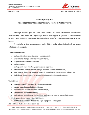 Fundacja MANUS Wybrzeże Wyspiańskiego 23-25, lok. 4.33-4.34 50 - 370 Wrocław OH /10 / 2014 Wrocław, 02 czerwca 2014 Oferta pracy dla Recepcjonista/Recepcjonistka w Hostelu Wakacyjnym Fundacja MANUS już od 1995 roku działa na rzecz studentów Politechniki Wrocławskiej. Od wielu lat organizuje Hostel Wakacyjny w jednym z akademików Uczelni. Jest to hostel kierowany do studentów i turystów, którzy odwiedzają Wrocław latem. W związku z tym poszukujemy osób, które będą odpowiedzialnych za pracę całodobowej recepcji. ZAKRES OBOWIĄZKÓW : obsługa klientów: zameldowanie i wymeldowanie, telefoniczna obsługa zainteresowanych ofertą, przyjmowanie rezerwacji on-line, obsługa maila, obsługiwanie kasy fiskalnej, sporządzanie raportów, informowanie o działalności Fundacji, dbanie o kontakt ze klientami, inne zadania dotyczące pracy na recepcji: uzupełnianie dokumentów, plików, itp. dodatkowe drobne zadania związane z funkcjonowaniem i promocją obiektu. WYMAGANIA: odpowiedzialność, sumienność i komunikatywność, kultura przy obsłudze każdego klienta, kontaktowość podczas rozmów telefonicznych, umiejętność pracy samodzielnej, umiejętność posługiwania się językiem angielskim w stopniu komunikatywnym, dyspozycyjność przez 4-6 dni w tygodniu. podstawowa wiedza o Wrocławiu, jego topografii i atrakcjach. Mile widziani studenci w wieku do 26 lat. www: www.manus.pl mail: [email protected] NIP: 898-10-11-437 REGON: 930490978 KRS: 0000100892 tel.: +48 71 320 23 74 fax: +48 71 734 53 41 Rac hunek bankow y : BZWBK 02 1090 2402 0000 0006 1000 9406 Fundacja MANUS Wybrzeże Wyspiańskiego 23-25, lok. 4.33-4.34 50 - 370 Wrocław OFERUJEMY: umowę zlecenie miłą i serdeczną atmosferę pracy materiały i wyposażenie niezbędne do pracy REKRUTACJA: CV prosimy nadsyłać na adres mailowy [email protected] . W tytule maila prosimy wpisać nr referencyjny: OH/10/2014 oraz imię i nazwisko Na aplikacje czekamy do 26 czerwca 2014 r. lub do momentu zatrudnienia odpowiedniej liczby osób. Zachęcamy do aplikowania! Prosimy o dołączenie klauzuli: „Wyrażam zgodę na przetwarzanie moich danych osobowych przez Fundację MANUS, zawartych w złożonych przeze mnie dokumentach, w tym na przetwarzanie ich w przyszłości dla celów związanych z procesem rekrutacji. Niniejszą zgodę składam dobrowolnie i oświadczam, że zostałem poinformowany o uprawnien iach przysługujących mi na podstawie ustawy z dnia 29 sierpnia 1997 r. o ochronie danych osobowych (Dz. U.02.101.926.j.t.). „ ZA STRZEG A M Y SOBIE PRAW O DO KONTA KTU Z W YBRA NYM I KA NDYDATA M I www: www.manus.pl mail: [email protected] NIP: 898-10-11-437 REGON: 930490978 KRS: 0000100892 tel.: +48 71 320 23 74 fax: +48 71 734 53 41 Rac hunek bankow y : BZWBK 02 1090 2402 0000 0006 1000 9406