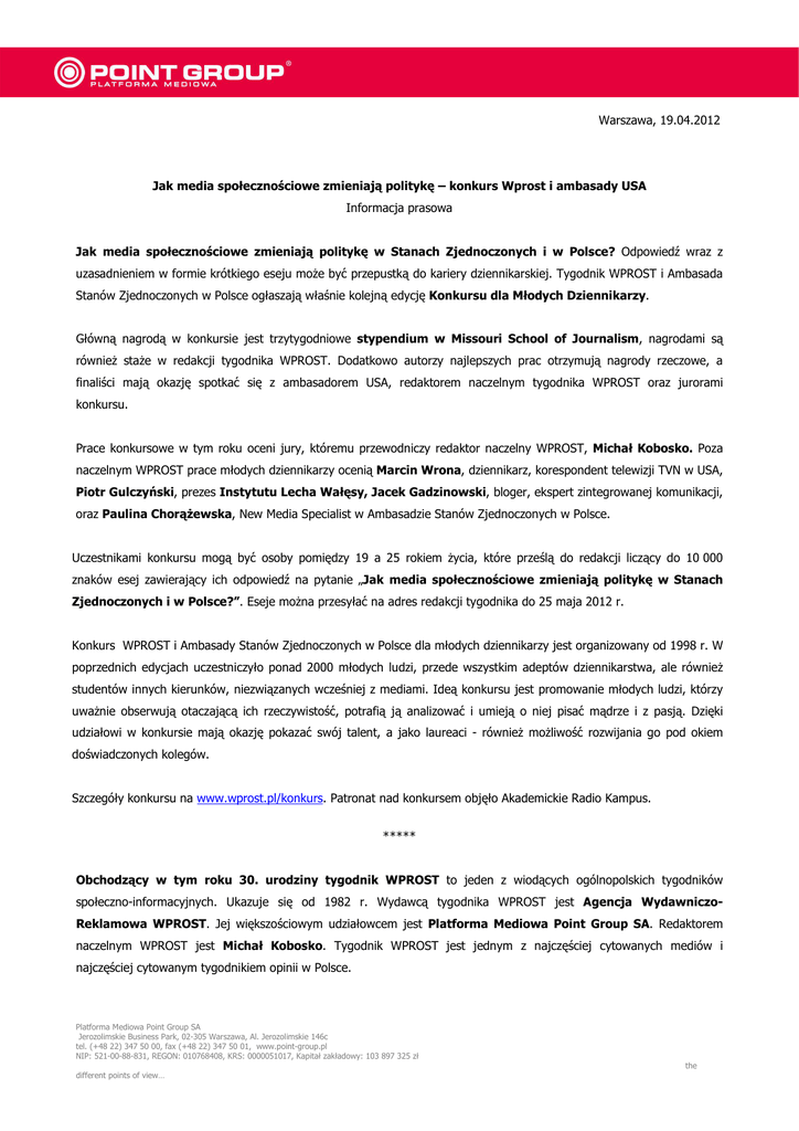 Warszawa, 19.04.2012 Jak media społecznościowe zmieniają politykę – konkurs Wprost i ambasady USA Informacja prasowa Jak media społecznościowe zmieniają politykę w Stanach Zjednoczonych i w Polsce? Odpowiedź wraz z uzasadnieniem w formie krótkiego eseju może być przepustką do kariery dziennikarskiej. Tygodnik WPROST i Ambasada Stanów Zjednoczonych w Polsce ogłaszają właśnie kolejną edycję Konkursu dla Młodych Dziennikarzy. Główną nagrodą w konkursie jest trzytygodniowe stypendium w Missouri School of Journalism, nagrodami są również staże w redakcji tygodnika WPROST. Dodatkowo autorzy najlepszych prac otrzymują nagrody rzeczowe, a finaliści mają okazję spotkać się z ambasadorem USA, redaktorem naczelnym tygodnika WPROST oraz jurorami konkursu. Prace konkursowe w tym roku oceni jury, któremu przewodniczy redaktor naczelny WPROST, Michał Kobosko. Poza naczelnym WPROST prace młodych dziennikarzy ocenią Marcin Wrona, dziennikarz, korespondent telewizji TVN w USA, Piotr Gulczyński, prezes Instytutu Lecha Wałęsy, Jacek Gadzinowski, bloger, ekspert zintegrowanej komunikacji, oraz Paulina Chorążewska, New Media Specialist w Ambasadzie Stanów Zjednoczonych w Polsce. Uczestnikami konkursu mogą być osoby pomiędzy 19 a 25 rokiem życia, które prześlą do redakcji liczący do 10 000 znaków esej zawierający ich odpowiedź na pytanie „Jak media społecznościowe zmieniają politykę w Stanach Zjednoczonych i w Polsce?”. Eseje można przesyłać na adres redakcji tygodnika do 25 maja 2012 r. Konkurs WPROST i Ambasady Stanów Zjednoczonych w Polsce dla młodych dziennikarzy jest organizowany od 1998 r. W poprzednich edycjach uczestniczyło ponad 2000 młodych ludzi, przede wszystkim adeptów dziennikarstwa, ale również studentów innych kierunków, niezwiązanych wcześniej z mediami. Ideą konkursu jest promowanie młodych ludzi, którzy uważnie obserwują otaczającą ich rzeczywistość, potrafią ją analizować i umieją o niej pisać mądrze i z pasją. Dzięki udziałowi w konkursie mają okazję pokazać swój talent, a jako laureaci - również możliwość rozwijania go pod okiem doświadczonych kolegów. Szczegóły konkursu na www.wprost.pl/konkurs. Patronat nad konkursem objęło Akademickie Radio Kampus. ***** Obchodzący w tym roku 30. urodziny tygodnik WPROST to jeden z wiodących ogólnopolskich tygodników społeczno-informacyjnych. Ukazuje się od 1982 r. Wydawcą tygodnika WPROST jest Agencja WydawniczoReklamowa WPROST. Jej większościowym udziałowcem jest Platforma Mediowa Point Group SA. Redaktorem naczelnym WPROST jest Michał Kobosko. Tygodnik WPROST jest jednym z najczęściej cytowanych mediów i najczęściej cytowanym tygodnikiem opinii w Polsce. Platforma Mediowa Point Group SA Jerozolimskie Business Park, 02-305 Warszawa, Al. Jerozolimskie 146c tel. (+48 22) 347 50 00, fax (+48 22) 347 50 01, www.point-group.pl NIP: 521-00-88-831, REGON: 010768408, KRS: 0000051017, Kapitał zakładowy: 103 897 325 zł the different points of view…