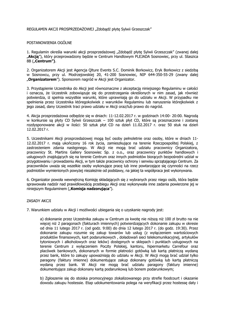 REGULAMIN AKCJI PROSPRZEDAŻOWEJ „Zdobądź płytę Sylwii Grzeszczak” POSTANOWIENIA OGÓLNE 1. Regulamin określa warunki akcji prosprzedażowej „Zdobądź płytę Sylwii Grzeszczak” (zwanej dalej „Akcją”), który przeprowadzony będzie w Centrum Handlowym PLEJADA Sosnowiec, przy ul. Staszica 8B („Centrum”). 2. Organizatorem Akcji jest Agencja Qlture Events S.C. Dominik Borkowicz, Eryk Borkowicz z siedzibą w Sosnowcu, przy ul. Modrzejowskiej 20, 41-200 Sosnowiec, NIP 644-350-55-29 (zwany dalej „Organizatorem”). Sponsorem nagród w Akcji jest Organizator. 3. Przystąpienie Uczestnika do Akcji jest równoznaczne z akceptacją niniejszego Regulaminu w całości i oznacza, że Uczestnik zobowiązuje się do przestrzegania określonych w nim zasad, jak również potwierdza, iż spełnia wszystkie warunki, które uprawniają go do udziału w Akcji. W przypadku nie spełnienia przez Uczestnika któregokolwiek z warunków Regulaminu lub naruszenia którejkolwiek z jego zasad, dany Uczestnik traci prawo udziału w Akcji oraz/lub prawo do nagród. 4. Akcja prosprzedażowa odbędzie się w dniach: 11-12.02.2017 r. w godzinach 14:00- 20:00. Nagrodą w konkursie są płyty CD Sylwii Grzeszczak – 100 sztuk płyt CD, które są przeznaczone i zostaną rozdysponowane akcji w ilości: 50 sztuk płyt CD na dzień 11.02.2017 r. oraz 50 stuk na dzień 12.02.2017 r. 5. Uczestnikami Akcji prosprzedażowej mogą być osoby pełnoletnie oraz osoby, które w dniach 1112.02.2017 r. mają ukończony 16 rok życia, zamieszkujące na terenie Rzeczpospolitej Polskiej, z zastrzeżeniem zdania następnego. W Akcji nie mogą brać udziału pracownicy Organizatora, pracownicy St. Martins Gallery Sosnowiec Sp. z o.o., oraz pracownicy punktów handlowych i usługowych znajdujących się na terenie Centrum oraz innych podmiotów biorących bezpośredni udział w przygotowaniu i prowadzeniu Akcji, w tym także pracownicy ochrony i serwisu sprzątającego Centrum. Za pracowników uważa się wszelkie osoby wykonujące pracę lub inne powtarzające się czynności na rzecz podmiotów wymienionych powyżej niezależnie od podstawy, na jakiej ta współpraca jest wykonywana. 6. Organizator powoła wewnętrzną Komisję składających się z wybranych przez niego osób, która będzie sprawowała nadzór nad prawidłowością przebiegu Akcji oraz wykonywała inne zadania powierzone jej w niniejszym Regulaminem („Komisja nadzorująca”). ZASADY AKCJI 7. Warunkiem udziału w Akcji i możliwości ubiegania się o uzyskanie nagrody jest: a) dokonanie przez Uczestnika zakupu w Centrum za kwotę nie niższą niż 100 zł brutto na nie więcej niż 2 paragonach (fakturach imiennych) potwierdzających dokonanie zakupu w okresie od dnia 11 lutego 2017 r. (od godz. 9:00) do dnia 12 lutego 2017 r. (do godz. 19:30). Przez dokonanie zakupu rozumie się zakup towarów lub usług (z wyłączeniem wartościowych produktów finansowych, kart podarunkowych , doładowań sieci telekomunikacyjnej, artykułów tytoniowych i alkoholowych oraz leków) dostępnych w sklepach i punktach usługowych na terenie Centrum z wyłączeniem Poczty Polskiej, kantoru, hipermarketu Carrefour oraz placówek bankowych, dokonanych w formie płatności gotówką lub kartą płatniczą wydaną przez bank, które to zakupy upoważniają do udziału w Akcji. W Akcji mogą brać udział tylko paragony (faktury imienne) dokumentujące zakup dokonany gotówką lub kartą płatniczą wydaną przez bank. W Akcji nie mogą brać udziału paragony (faktury imienne) dokumentujące zakup dokonany kartą podarunkową lub bonem podarunkowym; b) Zgłoszenie się do stoiska promocyjnego zlokalizowanego przy strefie foodcourt i okazanie dowodu zakupu hostessie. Etap udokumentowania polega na weryfikacji przez hostessę daty i godziny dokonania zakupów widniejących na paragonach oraz opieczętowaniu uprawnionych do udziału w Akcji paragonów. 8. Akcja prosprzedażowa składa się z 2 etapów: a) Etap 1 polega na dokonaniu zakupów na terenie Centrum Handlowego Plejada w okresie trwania Akcji – od dnia 11 lutego 2017 r. (od godz. 9:00) do dnia 12 lutego 2017 r. (do godz. 19:30) na kwotę minimum 100 zł brutto na maksymalnie dwóch paragonach. b) Etap 2 polega na zarejestrowaniu paragonu i udokumentowaniu zakupu u hostessy przy stoisku promocyjnym Akcji – zlokalizowanym przy strefie foodcourt. Podczas rejestracji Uczestnik musi wypełnić formularz rejestracyjny podając niezbędne dane osobowe (imię, nazwisko, adres zameldowania). 9. O zwycięstwie decyduje kolejność zgłoszeń. Liczba nagród wynosi 50 płyt CD Sylwii Grzeszczak na jeden dzień realizacji Akcji, czyli 50 płyt CD Sylwii Grzeszczak w Akcji promocyjnej realizowanej w dniu 11.02.2017 r. oraz 50 płyt CD Sylwii Grzeszczak w Akcji promocyjnej realizowanej w dniu 12.02.2017 r. Oznacza to, że w przypadku rozdysponowania puli nagród przewidzianej na każdy dzień realizacji, Akcja zostaje zakończona i nie przewidywane jest zwiększenie puli nagród. 10. Udział w Akcji może nastąpić jedynie na podstawie przedstawionych paragonów (faktur imiennych), jednokrotnie wykorzystanych. Oryginalne paragony (faktury imienne) zostaną opieczętowane przez pracownika Organizatora, a następnie oddane ich posiadaczom. Na podstawie tych paragonów Uczestnik Akcji może odebrać nagrodę. 11. Uczestnikowi przysługuje jednorazowe prawo do odebrania nagrody. Uczestnik może odebrać nagrodę w akcji promocyjnej tylko raz w dniu 11.02.2017 r. bądź 12.02.2017 r. Łącznie zostanie wyłonionych stu laureatów. NAGRODY 12. Nagrodami w Akcji promocyjnej są płyty CD Sylwii Grzeszczak (100 szt.) - po 50 sztuk na każdy dzień realizacji Akcji – o łącznej wartości 4.000 zł brutto. 13. Nagrody uzyskane w akcji nie podlegają opodatkowaniu należnym podatkiem dochodowym od osób fizycznych z tytułu uzyskanej nagrody zgodnie z Ustawą o podatku dochodowym od osób fizycznych z dnia 26 lipca 1991 r. 