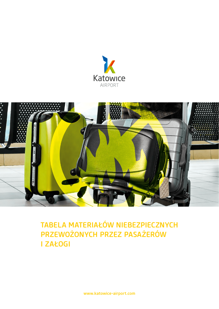 TABELA MATERIAŁÓW NIEBEZPIECZNYCH PRZEWOŻONYCH PRZEZ PASAŻERÓW I ZAŁOGI www.katowice-airport.com TOWARY NIEBEZPIECZNE NIE MOGĄ BYĆ PRZEWOŻONE PRZEZ PASAŻERÓW ORAZ ZAŁOGI Z WYJĄTKIEM PRZYPADKÓW OPISANYCH PONIŻEJ Wymagana jest zgoda linii lotniczych Dozwolony w lub jako bagaż odprawiany Dozwolony w lub jako bagaż podręczny Kapitan musi być poinformowany i lokalizacji towaru NIE TAK TAK NIE Napoje alkoholowe, pakowane pojedynczo ,w pojemnikach nie większych niż 5 L netto na osobę. Dopuszczalna zawartość alkoholu w stosunku do objętości to więcej niż 24% ale nie więcej niż 70 %. TAK TAK NIE NIE Amunicja (magazynki do broni) w stosownych opakowaniach (podklasa 1.4S, tylko UN 0012 lub UN 0014) w ilościach nie przekraczających 5 kg (11 lb) wagi brutto na osobę, na użytek tylko tej osoby. Dozwolone ilości przypadające na więcej niż jedną osobę nie mogą być łączone ani też pakowane w jednym lub kilku opakowaniach. TAK TAK TAK NIE Zestaw do ratownictwa lawinowego, przewożony w ilości jeden na osobę, zawierający skompresowany gaz podklasy 2.2. Może być także wyposażony w pirotechniczny mechanizm spustowy zawierający nie więcej niż 200 mg netto substancji Podklasy 1.4S. Wymagane jest, aby w/w zestaw był zapakowany do transportu w taki sposób, aby niemożliwa była jego aktywacja. Wszelkiego rodzaju poduszki powietrzne znajdujące się wewnątrz zestawu muszą posiadać spustowy zawór ciśnieniowy. NIE NIE TAK NIE Baterie zapasowe bądź luzem, zawierające litowo-metalowe lub litowo-jonowe ogniwa lub baterie do przenośnych urządzeń elektronicznych są dozwolone jedynie w bagażu podręcznym. Artykuły, które stanowią źródło energii np.: „power bank” są traktowane jako zapasowe baterie. Podczas podróży muszą być indywidualnie chronione/monitorowane pod względem możliwości zwarcia. TAK TAK NIE NIE Kuchenki kempingowe i zbiorniki z paliwem, które zawierały paliwo łatwopalne mogą być przewożone, tylko i wyłącznie w przypadku, gdy zbiornik został opróżniony (patrz: IATA DGR 2.3.2.5.). TAK TAK TAK NIE Urządzenia wykrywające skażenia chemiczne przewożone przez przedstawiciela Organizacji do spraw Zakazu Broni Chemicznej w podróży służbowej (patrz IATA DGR 2.3.4.4) ZABRONIONE Urządzenia obezwładniające, do których można zaliczyć m.in. rozpylacze gazu pieprzowego, zawierające substancje podrażniające lub obezwładniające są zakazane jako rzeczy posiadane przy sobie, w bagażu podręcznym i odprawionym. TAK TAK TAK NIE Suchy lód w ilości nie większej niż 2,5 kg (5 lb) na osobę, jeżeli został wykorzystany do pakownia towarów łatwo psujących się, niepodlegających tym przepisom, w bagażu podręcznym lub odprawianym pod warunkiem, że opakowanie umożliwia wydalanie dwutlenku węgla. Suchy lód będący w bagażu odprawionym musi posiadać oznaczenie „Dry ice” lub „Carbon dioxide, solid” wraz informacją o ilości netto suchego lodu lub oznaczeniem, że wewnątrz jest 2,5 kg lub mniej suchego lodu. NIE NIE TAK NIE E-papierosy (w tym e-cygara, e-fajki, inne osobiste parowniki) zawierające baterie muszą być indywidualnie zabezpieczone przed przypadkowym włączeniem. Broń elektrowstrząsowa (np.: paralizator elektryczny) zawierająca materiały niebezpieczne o właściwościach wybuchowych, skompresowane gazy, baterie litowe itp., jest zakazana jako rzeczy posiadane przy sobie, w bagażu podręcznym i odprawionym. ZABRONIONE NIE TAK TAK NIE Zespoły ogniw paliwowych i zapasowe kasety (naboje) paliwowe zasilające przenośne urządzenia elektroniczne (np. aparaty fotograficzne, telefony komórkowe, przenośne komputery i kamery) patrz: IATA DGR 2.3.5.10. TAK TAK TAK NIE Małe butle/naboje/wkłady z niepalnym gazem zawierające dwutlenek węgla lub inny gaz z podklasy 2.2 w dozwolonej ilości przypadającej do dwóch butli na pasażera (zainstalowane w kamizelce ratunkowej) Nie więcej niż jedno urządzenie na pasażera oraz do dwóch butli zapasowych, maksymalnie 4 butle o pojemności do 50 mL wodnej objętości dla innych urządzeń (patrz IATA DGR 2.3.4.2). NIE TAK TAK NIE Butle z niepalnym, nietoksycznym gazem, wykorzystywane do pracy sztucznych kończyn. Także, zapasowe butle podobne rozmiarem, jeżeli deklarowana liczba jest wymagana w trakcie podróży. NIE TAK TAK NIE Lokówki zawierające węglowodór, maksymalnie jedna sztuka na pasażera lub członka załogi, pod warunkiem, że osłona zabezpieczająca jest stabilnie założona na elemencie grzewczym. Lokówki tego typu nie mogą być używane na pokładzie samolotu. Naboje gazowe do lokówek nie są dozwolone w bagażu odprawionym lub podręcznym. TAK TAK TAK NIE Urządzenia wytwarzające wysoką temperaturę,w skład których wchodzą m.in. latarki podwodne i kolby lutownicze (patrz: IATA DGR 2.3.4.6). NIE TAK TAK NIE Izolowane opakowania zawierające ciekły azot w pełni absorbowalny przez porowaty materiał wykorzystywany jako czynnik chłodzący przewożonych materiałów bezpiecznych. NIE TAK NIE NIE Silniki spalinowe lub silniki na ogniwa paliwowe można przewozić pod warunkiem spełnienia wymagań przepisu specjalnego A70 IATA DGR (patrz: IATA DGR 2.3.5.15). NIE TAK TAK NIE Lampy energooszczędne do użytku prywatnego lub domowego zapakowane w fabryczne opakowania. TAK TAK NIE NIE Baterie Litowe: Sprzęt ratunkowy zawierający baterie litowe (patrz IATA DGR 2.3.2.6). n/a – nie dotyczy www.katowice-airport.com Wymagana jest zgoda linii lotniczych Dozwolony w lub jako bagaż odprawiany Dozwolony w lub jako bagaż podręczny Kapitan musi być poinformowany i lokalizacji towaru NIE TAK TAK NIE Baterie Litowe: Przenośne urządzenia elektroniczne powszechnego użytku, zawierające litowo-metalowe lub litowo-jonowe ogniwa lub baterie, w tym urządzenia medyczne takie jak przenośne koncentratory tlenu POC oraz elektronika użytkowa taka jak aparaty fotograficzne, telefony komórkowe, komputery przenośne, tablety, et