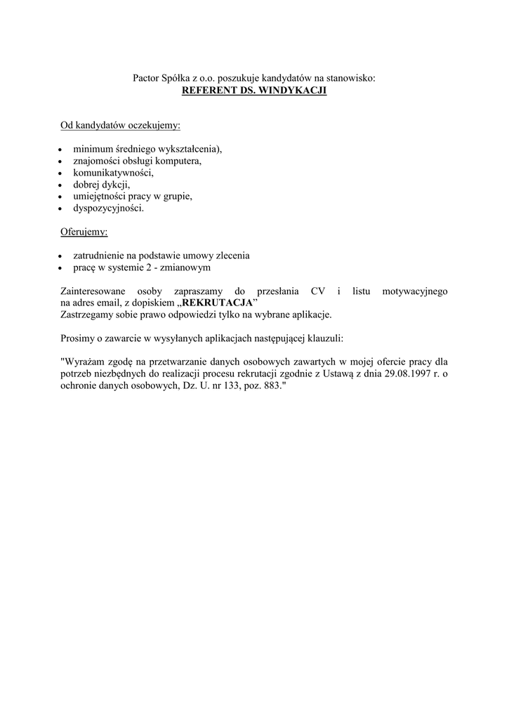 Pactor Spółka z o.o. poszukuje kandydatów na stanowisko: REFERENT DS. WINDYKACJI Od kandydatów oczekujemy: minimum średniego wykształcenia), znajomości obsługi komputera, komunikatywności, dobrej dykcji, umiejętności pracy w grupie, dyspozycyjności. Oferujemy: zatrudnienie na podstawie umowy zlecenia pracę w systemie 2 - zmianowym Zainteresowane osoby zapraszamy do przesłania CV i na adres email, z dopiskiem „REKRUTACJA” Zastrzegamy sobie prawo odpowiedzi tylko na wybrane aplikacje. listu motywacyjnego Prosimy o zawarcie w wysyłanych aplikacjach następującej klauzuli: "Wyrażam zgodę na przetwarzanie danych osobowych zawartych w mojej ofercie pracy dla potrzeb niezbędnych do realizacji procesu rekrutacji zgodnie z Ustawą z dnia 29.08.1997 r. o ochronie danych osobowych, Dz. U. nr 133, poz. 883."