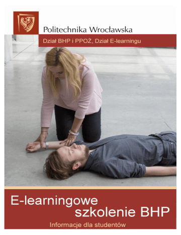 Ogólne szkolenie BHP Czy mnie to dotyczy? Obowiązkiem szkolenia BHP są objęci wszyscy nowoprzyjęci studenci, za wyjątkiem tych, którzy w ramach dotychczasowego kształcenia w Politechnice Wrocławskiej odbyli szkolenie BHP w formie e-learningu. Szczegółowe informacje o harmonogramie i realizacji szkolenia znajdziesz pod adresem: szkoleniebhp.pwr.edu.pl Jak mam się przygotować? 1. Poznaj obowiązujący Cię termin szkolenia Otwórz stronę szkoleniebhp.pwr.edu.pl Znajdź termin szkolenia dla Twojego wydziału W tym terminie jesteś zobowiązany zapoznać się z materiałem szkoleniowym kursu i rozwiązać testy modułowe jako formę potwierdzenia opanowania materiału. 2. Zaloguj się do ePortalu PWr Szkolenie BHP w formie kształcenia na odległość (e-learning) prowadzone będzie na platformie e-learningowej ePortal PWr. Zaloguj się do eportal.pwr.edu.pl (począwszy od 01.10.2016) używając nazwy użytkownika i hasła takiego jak do Twojego konta w Jednolitym Systemie Obsługi Studentów (JSOS). Odpowiedni komunikat na platformie pokieruje Cię do właściwego kursu. Miłej nauki. 3. Zdobądź certyfikat ukończenia szkolenia BHP Materiał szkoleniowy kursu podzielony jest na trzy moduły: Bezpieczeństwo środowiska pracy /nauki Ochrona przeciwpożarowa Pierwsza pomoc Warunkiem ukończenia szkolenia jest Warunkiem ukończenia szkolenia jest zapoznanie się z materiałem szkolezapoznanie się z materiałem szkoleniowym oraz uzyskanie min. 70% niowym oraz uzyskanie min. 70% poprawnych odpowiedzi z każdego testu poprawnych odpowiedzi z każdego testu modułowego. Testy modułowe będą modułowego. otwarte przez 7 dni we wskazanym terminie. Po ukończeniu szkolenia wygeneruj certyfikat - zachowaj go (zapisz na dysku/wydrukuj). Certyfikat zostanie odnotowany w systemie JSOS w puli Twoich osiągnięć. Co zrobić, gdy … nie możesz korzystać z e-learningowej formy szkolenia skontaktuj się z dziekanatem w ciągu 7 dni od początku semestru napotkasz na problemy podczas pracy z ePortalem PWr opisz je kierując e-mail na adres [email protected]