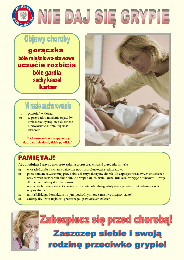 pozostań w domu w przypadku nasilenia objawów, zwłaszcza wystąpienia duszności, niezwłocznie skontaktuj się z lekarzem Zachorowania na grypę mogą doprowadzić do ciężkich powikłań! Aby zmniejszyć ryzyko zachorowania na grypę oraz chronić przed nią innych: w czasie kaszlu i kichania zakrywaj nos i usta chusteczką jednorazową poza domem zawsze miej przy sobie żel antybakteryjny do rąk lub zapas jednorazowych chusteczek nasyconych roztworem alkoholu, w przypadku ich braku kichaj lub kaszl w zgięcie łokciowe—Twoje dłonie nie zostaną skażone wirusem w środkach transportu zbiorowego unikaj niepotrzebnego dotykania powierzchni i elementów ich wyposażenia unikaj bliskiego kontaktu z innymi podróżnymi oraz masowych zgromadzeń zadbaj, aby Twoi najbliżsi przestrzegali powyższych zaleceń
