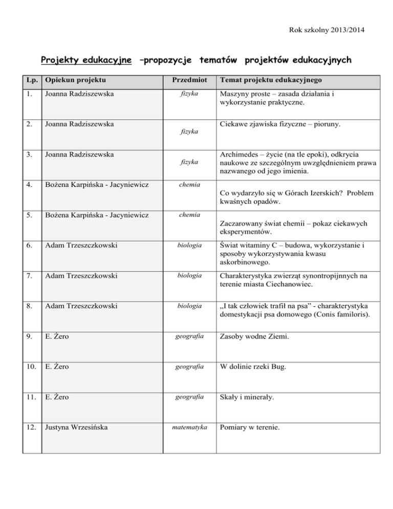 Rok szkolny 2013/2014 Projekty edukacyjne –propozycje tematów projektów edukacyjnych Lp. Opiekun projektu 1. Joanna Radziszewska 2. Joanna Radziszewska Przedmiot fizyka Temat projektu edukacyjnego Maszyny proste – zasada działania i wykorzystanie praktyczne. Ciekawe zjawiska fizyczne – pioruny. fizyka 3. Joanna Radziszewska fizyka 4. Bożena Karpińska - Jacyniewicz Archimedes – życie (na tle epoki), odkrycia naukowe ze szczególnym uwzględnieniem prawa nazwanego od jego imienia. chemia Co wydarzyło się w Górach Izerskich? Problem kwaśnych opadów. 5. Bożena Karpińska - Jacyniewicz chemia Zaczarowany świat chemii – pokaz ciekawych eksperymentów. 6. Adam Trzeszczkowski biologia Świat witaminy C – budowa, wykorzystanie i sposoby wykorzystywania kwasu askorbinowego. 7. Adam Trzeszczkowski biologia Charakterystyka zwierząt synontropijnnych na terenie miasta Ciechanowiec. 8. Adam Trzeszczkowski biologia „I tak człowiek trafił na psa” - charakterystyka domestykacji psa domowego (Conis familoris). 9. E. Żero geografia Zasoby wodne Ziemi. 10. E. Żero geografia W dolinie rzeki Bug. 11. E. Żero geografia Skały i minerały. 12. Justyna Wrzesińska matematyka Pomiary w terenie. 13. Justyna Wrzesińska matematyka Wielokąty foremne w przyrodzie. 14. Bernadeta Karczewska matematyka Słynni polscy matematycy. 15. Bernadeta Karczewska matematyka Wielościany foremne w życiu codziennym. 16. Katarzyna Prolesko język polski Z wizją czy bez wizji. 17. Katarzyna Prolesko język polski Syberia wierszem uczniowskim. 18. Urszula Sawicka język polski „Dom rodzinny widać, choc go nie ma”. 19. Urszula Sawicka język polski Pomysł na życie. 20. Mariola Włodarczyk język polski „Dobrze widzi się tylko sercem” - wartość przyjaźni 21. Mariola Włodarczyk język polski Być człowiekiem ... 22. Jolanta Drewnowska - Koziarska historia Kim byli moi przodkowie? 23. Jolanta Drewnowska - Koziarska historia Podlasie – historia regionu (ziemia i ludzie). 24. Bogumiła Rusiniak historia Sylwetki ludzi zasłużonych dla Ciechanowca. 25. Bogumiła Rusiniak WOS 26. Bogumiła Filipczuk język angielski Z czego słyną Anglicy. 27. Bogumiła Filipczuk język angielski Święta i tradycje w USA. Samorząd terytorialny i jego zadania. 28. Dorota Żywicka biblioteka Mistrz Jan zaprasza na biesiadę pod lipą. 29. Dorota Żywicka biblioteka Ciekawi ludzie i znane osoby odwiedzające szkołę. 30. Halina Ponichtera świetlica Jak mądrze odczytać reklamę? 31. Halina Ponichtera świetlica Coca -cola, Sprite, Red Bull pić czy nie pić? 32. Ewa Tymińska świetlica Sklepik moich marzeń. 33. Ewa Tymińska świetlica Zwyczaje i tradycje świąt Bożego Narodzenia w Polsce. 34. Ewa Wincenciak język francuski „Polka królową Francji”, czyli zasłużeni Polacy we Francji i Francuzi w Polsce. 35. Ewa Wincenciak język francuski Paris, paris .. - co on ma takiego w sobie? 36. Ewa Polak –Niemyjska język angielski Ulubione potrawy Brytyjczyków. 37. Ewa Polak –Niemyjska język angielski Brytyjski a amerykański angielski. 38. Alina Zaręba informatyka Młodzież w sieci – uzależnienia od gier komputerowych i Internetu. 39. Alina Zaręba informatyka Redagujemy gazetkę szkolną. 40. Marta Kuźmińska pedagog „Od A do Z” - abecadło Janusza Korczaka 41. Marta Kuźmińska pedagog „Każdy inny – wszyscy równi” - rzecz o tolerancji. 42. Małgorzata Zaremba EDB Zanim przyjedzie lekarz. 43. Małgorzata Zaremba 44. Małgorzata Bekier wychowanie fizyczne Zaburzenia stanu zdrowia i rozwoju związane z nieprawidłowym odżywianiem. 45. Cezary Koziarski wychowanie fizyczne Czy potrzebny jest trener w treningu LA? 46. Cezary Koziarski wychowanie fizyczne Historia polskiej lekkoatletyki 47. Anna Kowalewska religia Miłość do świata stworzonego. 48. Anna Kowalewska religia Sanktuaria maryjne na Podlasiu. 49. Daniel Kujawski wychowanie fizyczne Historia powstania igrzysk olimpijskich. 50. Daniel Kujawski wychowanie fizyczne Sylwetki znanych polskich sportowców. zajęcia techniczne Wynalazki, które zmieniły świat.