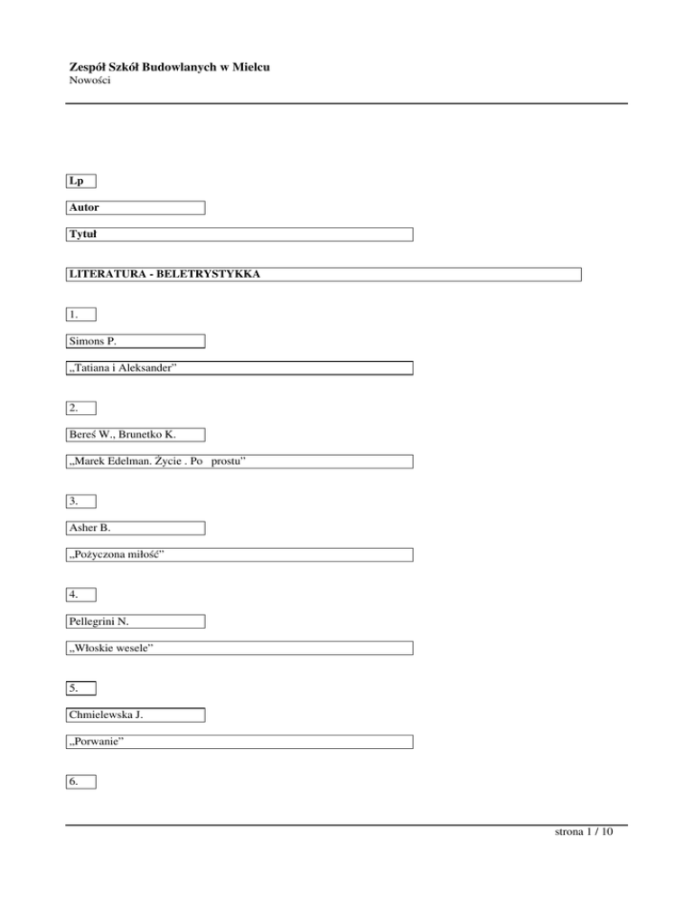 Zespół Szkół Budowlanych w Mielcu Nowości Lp Autor Tytuł LITERATURA - BELETRYSTYKKA 1. Simons P. „Tatiana i Aleksander” 2. Bereś W., Brunetko K. „Marek Edelman. Życie . Po prostu” 3. Asher B. „Pożyczona miłość” 4. Pellegrini N. „Włoskie wesele” 5. Chmielewska J. „Porwanie” 6. strona 1 / 10 Zespół Szkół Budowlanych w Mielcu Nowości Rudnicka O. „Zacisze 13” 7. Rudnicka O. „Czy ten rudy pies to kot?” 8. Hoffman C. „Żegnaj Afryko” 9. Hoffman C. „Moja afrykańska miłość” 10. Hoffman C. „Biała masajka” 11. Giffin E „Coś niebieskiego” 12. Giffin E. „Dziecioodporna” 13. Saillo O strona 2 / 10 Zespół Szkół Budowlanych w Mielcu Nowości „Księżyc we łzach” 14. Ayaan Hirsi Ali „Niewierna” 15. Pascal – Gillespie J. „Kiedyś byłam księżną” 16. Pascal – Gillespie J. „Ponieważ byłam księżną” 17. Picoult J. „Bez mojej zgody” 18. Roberts Nora „Noc na bagnach Luizjany” 19. James S. „Pamiętniki JAne Austin” 20. Roberts Nora „W samo południe” strona 3 / 10 Zespół Szkół Budowlanych w Mielcu Nowości 21. Sting Larson „Mężczyźni, którzy nienawidzą kobiet” 22. Sting Larson „Dziewczyna, która igrała z ogniem” 23. Sting Larson „Zamek z piasku, który runął” WYDAWNICTWA ZAWODOWE 1. „Prawo budowlane – przepisy techniczno – budowlane” 2. „Prawo budowlane – ustawy, przepisy wykonawcze, komentarz” 3. Tauszyński K. „Budownictwo z technologią cz. 1” 4. Mirski J. , Z., Łącki K. strona 4 / 10 Zespół Szkół Budowlanych w Mielcu Nowości „Budownictwo z technologią cz. 2” 5. Szymański E. „Materiały budowlane cz. 2” 6. Popek M., Wapińska B. „Podstawy budownictwa” PODRĘCZNIKI 1. Słoma J. „Przysposobienie obronne – zakres podstawowy – podręcznik dla LO, LP, T, ZSZ” 2. Adamczyk G., Breitkopf B. „Przysposobienie obronne – podręcznik dla szkół ponadpodstawowych” 3. Śnieżek H. „Przysposobienie obronne – zagrożenia czasu pokoju, pierwsza pomoc – szkoły ponadgimnazjalne cz. 1 podręcznik” strona 5 / 10 Zespół Szkół Budowlanych w Mielcu Nowości Kiedy Tatiana ucieka z wyniszczonego wojną Leningradu, by zacząć nowe życie w Ameryce, ma osiemnaście lat i jest oczekującą dziecka wdową. Jednak duchy przeszłości nie dają jej spokoju. Obsesyjnie dręczy ją przeczucie, że mąż, major Armii Czerwonej Aleksander Biełow, żyje i potrzebuje pomocy... Tymczasem, w oddalonym o tysiące mil Związku Radzieckim, Aleksander cudem unika egzekucji i zostaje mianowany dowódcą batalionu karnego. Chociaż rekruci mają nikłe szanse na przeżycie, Aleksander postanawia przeprowadzić swoich ludzi przez zrujnowaną wojną Europę. Przedziera się na Zachód w rozpaczliwej próbie ucieczki przed bezwzględną stalinowską machiną śmierci... P ierwsza tak obszerna i pełna biografia Marka Edelmana - wielkiego autorytetu moralnego, ostatniego żyjącego przywódcy powstania w getcie warszawskim, wybitnego działacza politycznego i społecznego, opozycjonisty, z wykształcenia lekarza kardiologa - napisana przez znanych dziennikarzy we współpracy z bohaterem książki. Marek Edelman, współzałożyciel KOR i działacz podziemnej "Solidarności", od ponad sześćdziesięciu lat mieszka w Łodzi. W 1998 roku otrzymał najwyższe polskie odznaczenie - Order Orła Białego. Do książki dołączona jest płyta DVD, z fragmentami rozmów strona 6 / 10 Zespół Szkół Budowlanych w Mielcu Nowości Zgodziłabyś się udawać żonę byłego chłopaka? Gwen się zgodziła, a jej mąż nawet ją do tego zachęcił. Z wielką tremą wkroczyła na nową drogę życia. Wkrótce dowiedziała się, czyją żonę tak naprawdę udawała… Bridget Asher – literacki pseudonim amerykańskiej pisarki Julianny Baggott. Oprócz powieści obyczajowych wydała także książki dla dzieci oraz trzy tomiki poezji. Pożyczona miłość to jej druga po bestsellerowych Kwiatach od Artiego powieść, która ukazała się w Polsce. Siostra Piety Martinelli wkrótce wyjdzie za mąż, a Pieta, która jest znaną stylistką ślubnych sukien, otrzymała zadanie przygotowania stroju dla panny młodej. Młoda kobieta nie może się jednak skupić na projekcie. Czemu jej matka jest ostatnio taka smutna? I czy mężczyzna, którego zawsze podziwiała i skrycie kochała zamierza rzeczywiście ożenić się z inną kobietą? Zajmując się suknią siostry, Pieta odkrywa tajemnice, które odmieniły jej rodzinę i które stoją na drodze do jej własnego szczęścia... Wyobr aź sobie, że na strychu starego domostwa odnaleziono nieznane pamiętniki Jane Austen. Wyobraź sobie, że ich pożółkłe stronice s krywają historię związku, który zmienił życie pisarki i dał początek jej twórczości. Oto opowieść ujawniająca sekrety autorki ubóstwianej przez miliony kobiet. Historia, która pozwala zajrzeć do serca i strona 7 / 10 Zespół Szkół Budowlanych w Mielcu Nowości umysłu Jane Au sten i dostrzec, jak wiele sytuacji i ludzi z prawdziwego życia opisała w swych słynnych powieściach. A przede wszystkim odkrywa pra wdę o tajemniczym dżentelmenie – największej, choć niespełnionej miłości tej utalentowanej autorki. Ich romans stał się inspiracją d o napisania Dumy i uprzedzenia oraz Rozważnej i romantycznej. Urzekająca, chwytająca za serce powieść o miłości i poświęceniu, o prawdziwej pasji i namiętności, z których rodzi się niezapomniana literatura. Wielbiciele Jane Austen pokochają tę książkę. Powieść obyczajowa z wątkiem sensacyjnym. Pani porucznik Phoebe MacNamara - jedna z najlepszych negocjatorek policyjnych nie tylko w Savannah i zarazem samotna matka - nie boi się nikogo i niczego. Odważna i wrażliwa, obawia się tylko miłości i dlatego trzyma mężczyzn na dystans. Tak też postępuje z Duncanem, właścicielem baru, który jednak nie zamierza dać za wygraną. Gdy Phoebe staje się obiektem 