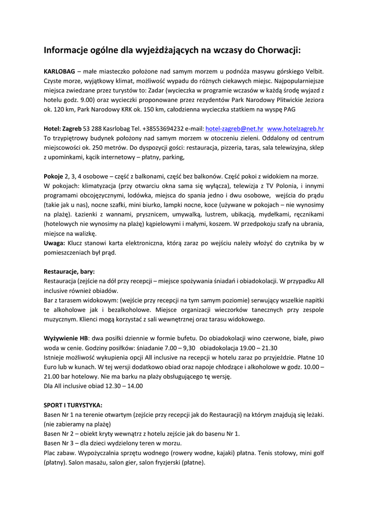 Informacje ogólne dla wyjeżdżających na wczasy do Chorwacji: KARLOBAG – małe miasteczko położone nad samym morzem u podnóża masywu górskiego Velbit. Czyste morze, wyjątkowy klimat, możliwość wypadu do różnych ciekawych miejsc. Najpopularniejsze miejsca zwiedzane przez turystów to: Zadar (wycieczka w programie wczasów w każdą środę wyjazd z hotelu godz. 9.00) oraz wycieczki proponowane przez rezydentów Park Narodowy Plitwickie Jeziora ok. 120 km, Park Narodowy KRK ok. 150 km, całodzienna wycieczka statkiem na wyspę PAG Hotel: Zagreb 53 288 Kasrlobag Tel. +38553694232 e-mail: [email protected] www.hotelzagreb.hr To trzypiętrowy budynek położony nad samym morzem w otoczeniu zieleni. Oddalony od centrum miejscowości ok. 250 metrów. Do dyspozycji gości: restauracja, pizzeria, taras, sala telewizyjna, sklep z upominkami, kącik internetowy – płatny, parking, Pokoje 2, 3, 4 osobowe – część z balkonami, część bez balkonów. Część pokoi z widokiem na morze. W pokojach: klimatyzacja (przy otwarciu okna sama się wyłącza), telewizja z TV Polonia, i innymi programami obcojęzycznymi, lodówka, miejsca do spania jedno i dwu osobowe, wejścia do prądu (takie jak u nas), nocne szafki, mini biurko, lampki nocne, koce (używane w pokojach – nie wynosimy na plażę). Łazienki z wannami, prysznicem, umywalką, lustrem, ubikacją, mydełkami, ręcznikami (hotelowych nie wynosimy na plażę) kąpielowymi i małymi, koszem. W przedpokoju szafy na ubrania, miejsce na walizkę. Uwaga: Klucz stanowi karta elektroniczna, którą zaraz po wejściu należy włożyć do czytnika by w pomieszczeniach był prąd. Restauracje, bary: Restauracja (zejście na dół przy recepcji – miejsce spożywania śniadań i obiadokolacji. W przypadku All inclusive również obiadów. Bar z tarasem widokowym: (wejście przy recepcji na tym samym poziomie) serwujący wszelkie napitki te alkoholowe jak i bezalkoholowe. Miejsce organizacji wieczorków tanecznych przy zespole muzycznym. Klienci mogą korzystać z sali wewnętrznej oraz tarasu widokowego. Wyżywienie HB: dwa posiłki dziennie w formie bufetu. Do obiadokolacji wino czerwone, białe, piwo woda w cenie. Godziny posiłków: śniadanie 7.00 – 9,30 obiadokolacja 19.00 – 21.30 Istnieje możliwość wykupienia opcji All inclusive na recepcji w hotelu zaraz po przyjeździe. Płatne 10 Euro lub w kunach. W tej wersji dodatkowo obiad oraz napoje chłodzące i alkoholowe w godz. 10.00 – 21.00 bar hotelowy. Nie ma barku na plaży obsługującego tę wersję. Dla All inclusive obiad 12.30 – 14.00 SPORT I TURYSTYKA: Basen Nr 1 na terenie otwartym (zejście przy recepcji jak do Restauracji) na którym znajdują się leżaki. (nie zabieramy na plażę) Basen Nr 2 – obiekt kryty wewnątrz z hotelu zejście jak do basenu Nr 1. Basen Nr 3 – dla dzieci wydzielony teren w morzu. Plac zabaw. Wypożyczalnia sprzętu wodnego (rowery wodne, kajaki) płatna. Tenis stołowy, mini golf (płatny). Salon masażu, salon gier, salon fryzjerski (płatne). Plaża betonowo kamienista (jak niemal wszystkie w Chorwacji). Znajduje się przy budynku hotelowym. Dojścia do plaży wyznaczone w zależności w której części mieszkamy. Uwagi praktyczne: 1. Wyjeżdżając musimy mieć dowód osobisty lub paszport. Dzieci również muszą mieć taki dokument. 2. Zabieramy ze sobą: kremy do opalania 30 lub 50 (tam bardzo drogie), nakrycia głowy, klapki na basen, obuwie do morza, karimatę lub materac lub leżak składany na plażę, ręczniki plażowe. 3. Drobne pieniądze na toalety w Czechach, Austrii, Słowenii, Chorwacji ok. 0,5 E 4. Wymianę robimy w Polskich kantorach lub w Banku w Karlobagu odległym ok. 400m. Przy wymianie musimy mieć dokument. Na recepcji w hotelu przy wymianie z Euro na kuna pobierana jest prowizja. 5. Do restauracji hotelowej na posiłki chodzimy bez jakichkolwiek torebek, reklamówek i nie w stroju kąpielowym. Przy szwedzkim stole nie wynosimy poza restaurację ani jedzenia ani picia. 6. Pokoje sprzątane codziennie, chyba że nie życzymy sobie tego. Ręczniki do wymiany zostawiamy na podłodze w łazience. 7. Osoby chore na choroby przewlekłe powinny się na nie ubezpieczyć, gdyż standardowe ubezpieczenie nie obejmuje takowych świadczeń i leczenie na nie może być bardzo drogie. 8. W przypadku konsultacji lekarskiej potrzebę zgłaszamy do rezydenta i on dalej informuje o spotkaniu z lekarzem. W razie wypadku najszybciej informujemy recepcję lub rezydenta. 9. Po wypadku związanym z alkoholem koszty leczenia pokrywa poszkodowany. 10. Nie wychodzimy na spacery w góry bo jest niebezpiecznie (różnego rodzaju gady i płazy) 11. Kafejki, barki, restauracje ok. 250 metrów od hotelu z cenami takimi samymi jak u nas i tam bezpłatnie możemy korzystać z Internetu. 12. Sklepy: Artykuły spożywcze, wody, napoje, soki, słodycze (ceny jak u nas) w sklepie obok hotelu przy stacji benzynowej oraz w Konzumie oddalonym ok. 200m. 13. Kościół znajduje się w centrum miejscowości. Godziny mszy św. Na informacjach kościelnych. Uwaga: Wszelkie szkody w pokojach na obiektach oraz miejscach pobytu spowodowane przez wczasowiczów naszej grupy pokrywa uczestnik.