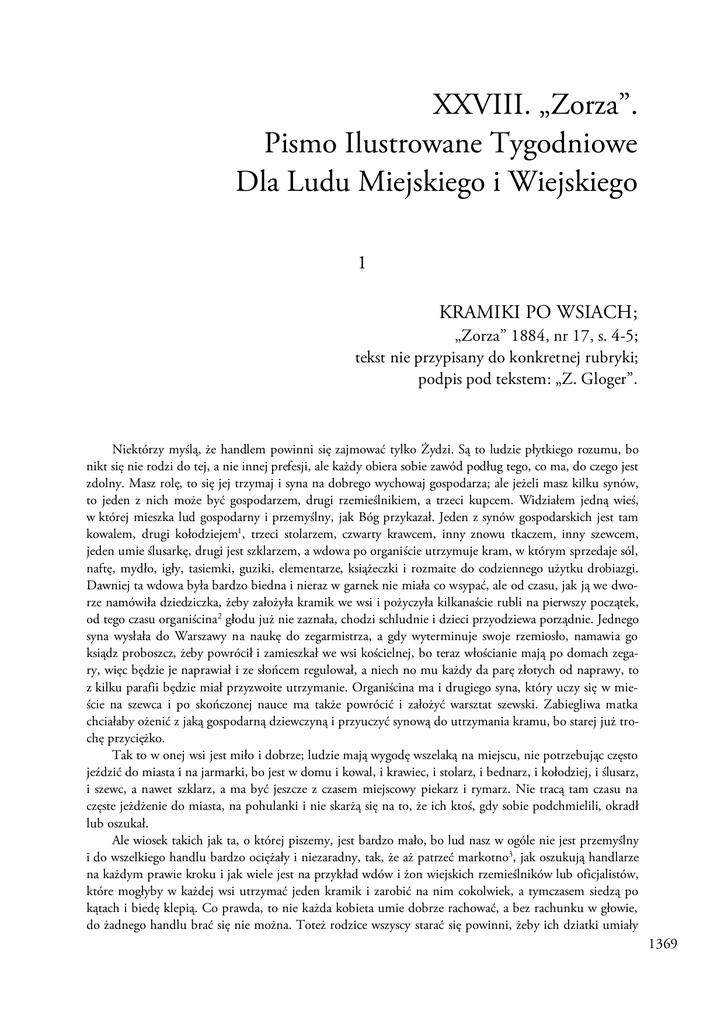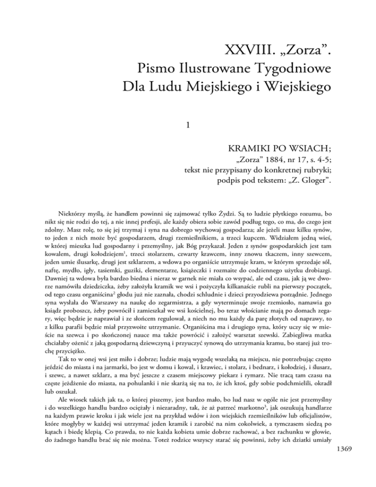 XXVIII. „Zorza”. Pismo Ilustrowane Tygodniowe Dla Ludu Miejskiego i Wiejskiego 1 KRAMIKI PO WSIACH; „Zorza” 1884, nr 17, s. 4-5; tekst nie przypisany do konkretnej rubryki; podpis pod tekstem: „Z. Gloger”. Niektórzy myślą, że handlem powinni się zajmować tylko Żydzi. Są to ludzie płytkiego rozumu, bo nikt się nie rodzi do tej, a nie innej prefesji, ale każdy obiera sobie zawód podług tego, co ma, do czego jest zdolny. Masz rolę, to się jej trzymaj i syna na dobrego wychowaj gospodarza; ale jeżeli masz kilku synów, to jeden z nich może być gospodarzem, drugi rzemieślnikiem, a trzeci kupcem. Widziałem jedną wieś, w której mieszka lud gospodarny i przemyślny, jak Bóg przykazał. Jeden z synów gospodarskich jest tam kowalem, drugi kołodziejem1, trzeci stolarzem, czwarty krawcem, inny znowu tkaczem, inny szewcem, jeden umie ślusarkę, drugi jest szklarzem, a wdowa po organiście utrzymuje kram, w którym sprzedaje sól, naftę, mydło, igły, tasiemki, guziki, elementarze, książeczki i rozmaite do codziennego użytku drobiazgi. Dawniej ta wdowa była bardzo biedna i nieraz w garnek nie miała co wsypać, ale od czasu, jak ją we dworze namówiła dziedziczka, żeby założyła kramik we wsi i pożyczyła kilkanaście rubli na pierwszy początek, od tego czasu organiścina 2 głodu już nie zaznała, chodzi schludnie i dzieci przyodziewa porządnie. Jednego syna wysłała do Warszawy na naukę do zegarmistrza, a gdy wyterminuje swoje rzemiosło, namawia go ksiądz proboszcz, żeby powrócił i zamieszkał we wsi kościelnej, bo teraz włościanie mają po domach zegary, więc będzie je naprawiał i ze słońcem regulował, a niech no mu każdy da parę złotych od naprawy, to z kilku parafii będzie miał przyzwoite utrzymanie. Organiścina ma i drugiego syna, który uczy się w mieście na szewca i po skończonej nauce ma także powrócić i założyć warsztat szewski. Zabiegliwa matka chciałaby ożenić z jaką gospodarną dziewczyną i przyuczyć synową do utrzymania kramu, bo starej już trochę przyciężko. Tak to w onej wsi jest miło i dobrze; ludzie mają wygodę wszelaką na miejscu, nie potrzebując często jeździć do miasta i na jarmarki, bo jest w domu i kowal, i krawiec, i stolarz, i bednarz, i kołodziej, i ślusarz, i szewc, a nawet szklarz, a ma być jeszcze z czasem miejscowy piekarz i rymarz. Nie tracą tam czasu na częste jeżdżenie do miasta, na pohulanki i nie skarżą się na to, że ich ktoś, gdy sobie podchmielili, okradł lub oszukał. Ale wiosek takich jak ta, o której piszemy, jest bardzo mało, bo lud nasz w ogóle nie jest przemyślny i do wszelkiego handlu bardzo ociężały i niezaradny, tak, że aż patrzeć markotno3, jak oszukują handlarze na każdym prawie kroku i jak wiele jest na przykład wdów i żon wiejskich rzemieślników lub oficjalistów, które mogłyby w każdej wsi utrzymać jeden kramik i zarobić na nim cokolwiek, a tymczasem siedzą po kątach i biedę klepią. Co prawda, to nie każda kobieta umie dobrze rachować, a bez rachunku w głowie, do żadnego handlu brać się nie można. Toteż rodzice wszyscy starać się powinni, żeby ich dziatki umiały 1369 Kramiki po wsiach czytać, pisać i liczyć. U Żydów w każdym domu uczą się dzieci czytać i pisać; każdy coś ma, choćby najmniejszy kramik, choć po żydowsku umie napisać do składu towarów, czego mu potrzeba, w jakiej ilości i gatunku, w jakiej cenie i jaką drogą towar ma być przesłany? Każdy kramarz musi doskonale wyliczyć, po czemu4 co ma sprzedawać, żeby miał należyty zarobek, ile czego i w jakiej porze podług potrzeby sprowadzić, żeby się nie zepsuło i nie zabrakło, komu kredytować, a komu nie. Wszystko to nie są rzeczy tak trudne, tylko wymagają zabiegliwości i zdrowego rozsądku w głowie. W kraju naszym żony oficjalistów i rzemieślników po wisach zajmują się domowym gospodarstwem i dziećmi; ale nie każda stara się i potrafi zarobić, żeby stale przyjść z pewną choćby niewielką pomocą mężowi w opędzaniu domowych wydatków. Wszystko więc liczy się na zarobek, pracę lub pensję męża. Tam żona niezamożnego urzędnika i rzemieślnika nie tylko, że zwykle sługi jak u nas nie chowa, ale jeszcze wynajdzie sobie jakiś choć niewielki, ale stały zarobek, którym przychodzi w pomoc swemu mężowi, lub oszczędza grosz skrzętnie na złą godzinę. Wiele takich kobiet posiada tam drobne sklepiki po wsiach i miasteczkach, często w mieszkaniu swoim mając tylko oddzielną szafę na kramik przeznaczoną. Dobre i roztropne żony, niezamożne wdowy niech naśladują dobry przykład. 1 Kołodziej – rzemieślnik, dawniej zwany również stelmachem, zajmujący się wyrobem części do drewnianych wozów, sań – głównie kół. 2 Organiścina – żona organisty. 3 Markotny – świadczący o niezadowoleniu; będący wyrazem przygnębienia; smutny. 4 „Po czemu” – po ile. 2 CZCIJ OJCA TWEGO I MATKĘ TWOJĄ! „Zorza” 1886, nr 4, s. 2-3; podpis pod tekstem: „Zygmunt Gloger”. Nic gorszego w pożyciu rodziny jak złe obchodzenie się ze starymi rodzicami i dziadkami, a jednak tę zakamieniałość 1 serca widzimy wśród ludu naszego u bardzo wielu dzieci, którzy nie pomną na to, że „jako ty rodzice swoje, tak cię uczczą dziatki twoje”2. Tak Bóg zrządził, że każdy człowiek, przepracowawszy swój wiek i wychowawszy potomstwo, sam potrzebuje odpoczynku i spokoju, a wtedy uczciwe dzieci i krewni otoczyć go powinni opieką i szacunkiem, który siwemu włosowi należy się. Nikczemni synowie i zatwardziałe córki, które nie czują wyrzutów sumienia albo nie mają o tym dobrego pojęcia, jak to potrzeba obchodzić się z rodzicami, wyprawiają ich na żebraninę, każą im ciężko pracować u obcych ludzi i w domu, nieraz o chłodzie i głodzie, i nie pamiętają o ciepłym dla nich przyodziewku3 i kącie podczas zimy. Co gorsza, są takie wyrodki rodu ludzki