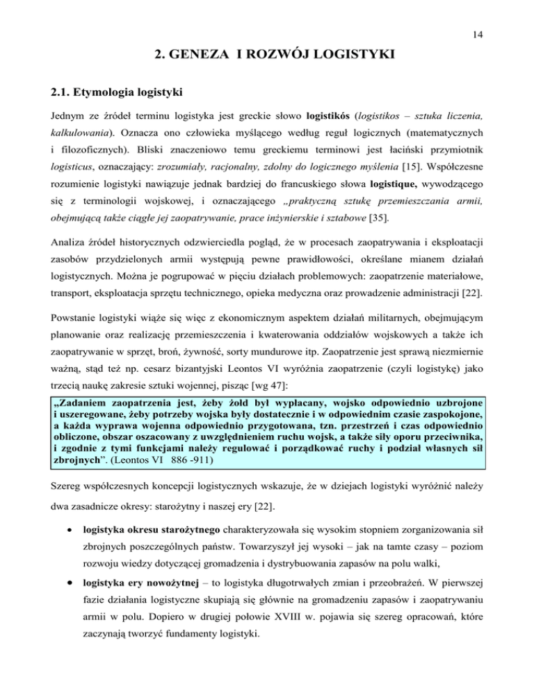 14 2. GENEZA I ROZWÓJ LOGISTYKI 2.1. Etymologia logistyki Jednym ze źródeł terminu logistyka jest greckie słowo logistikós (logistikos – sztuka liczenia, kalkulowania). Oznacza ono człowieka myślącego według reguł logicznych (matematycznych i filozoficznych). Bliski znaczeniowo temu greckiemu terminowi jest łaciński przymiotnik logisticus, oznaczający: zrozumiały, racjonalny, zdolny do logicznego myślenia [15]. Współczesne rozumienie logistyki nawiązuje jednak bardziej do francuskiego słowa logistique, wywodzącego się z terminologii wojskowej, i oznaczającego „praktyczną sztukę przemieszczania armii, obejmującą takŜe ciągłe jej zaopatrywanie, prace inŜynierskie i sztabowe [35]. Analiza źródeł historycznych odzwierciedla pogląd, Ŝe w procesach zaopatrywania i eksploatacji zasobów przydzielonych armii występują pewne prawidłowości, określane mianem działań logistycznych. MoŜna je pogrupować w pięciu działach problemowych: zaopatrzenie materiałowe, transport, eksploatacja sprzętu technicznego, opieka medyczna oraz prowadzenie administracji [22]. Powstanie logistyki wiąŜe się więc z ekonomicznym aspektem działań militarnych, obejmującym planowanie oraz realizację przemieszczenia i kwaterowania oddziałów wojskowych a takŜe ich zaopatrywanie w sprzęt, broń, Ŝywność, sorty mundurowe itp. Zaopatrzenie jest sprawą niezmiernie waŜną, stąd teŜ np. cesarz bizantyjski Leontos VI wyróŜnia zaopatrzenie (czyli logistykę) jako trzecią naukę zakresie sztuki wojennej, pisząc [wg 47]: „Zadaniem zaopatrzenia jest, Ŝeby Ŝołd był wypłacany, wojsko odpowiednio uzbrojone i uszeregowane, Ŝeby potrzeby wojska były dostatecznie i w odpowiednim czasie zaspokojone, a kaŜda wyprawa wojenna odpowiednio przygotowana, tzn. przestrzeń i czas odpowiednio obliczone, obszar oszacowany z uwzględnieniem ruchu wojsk, a takŜe siły oporu przeciwnika, i zgodnie z tymi funkcjami naleŜy regulować i porządkować ruchy i podział własnych sił zbrojnych”. (Leontos VI 886 -911) Szereg współczesnych koncepcji logistycznych wskazuje, Ŝe w dziejach logistyki wyróŜnić naleŜy dwa zasadnicze okresy: staroŜytny i naszej ery [22]. • logistyka okresu staroŜytnego charakteryzowała się wysokim stopniem zorganizowania sił zbrojnych poszczególnych państw. Towarzyszył jej wysoki – jak na tamte czasy – poziom rozwoju wiedzy dotyczącej gromadzenia i dystrybuowania zapasów na polu walki, • logistyka ery nowoŜytnej – to logistyka długotrwałych zmian i przeobraŜeń. W pierwszej fazie działania logistyczne skupiają się głównie na gromadzeniu zapasów i zaopatrywaniu armii w polu. Dopiero w drugiej połowie XVIII w. pojawia się szereg opracowań, które zaczynają tworzyć fundamenty logistyki. 15 2.2. Wojskowy rodowód logistyki Wielu uznaje Aleksandra Macedońskiego za pierwszego logistyka. Prawdopodobnie to on był pierwszą osobą, która stworzyła efektywny system logistyczny zaopatrujący wojsko. W jego kadrze oficerskiej byli teŜ kwatermistrze nadzorujący pracą tzw. pociągu bagaŜowego. Był on zorganizowany tak, Ŝe do kaŜdego kawalerzysty był przypisany jeden niewolnik na koniu, który z kolei prowadził konia jucznego z zaopatrzeniem, oraz jeden niewolnik pieszy z koniem jucznym dla kaŜdego piechura. Rzymianie problem transportu zaopatrzenia rozwiązali trochę inaczej. KaŜdy maszerujący Ŝołnierz został obarczony takim cięŜarem, jaki był w stanie unieść. W ten sposób zredukowano tabory i zwiększono samowystarczalność Ŝołnierza. Nie było to jednak łatwe, bo [47]: „Oprócz tarczy, zbroi, miecza i innego uzbrojenia, kaŜdy miał nieść dwa pale do budowy swojej części opalisadowanego obozu, w którym spędzał kaŜdą noc, swoją część namiotu ze skóry, który dzielił z dziewięcioma innymi legionistami, skórzany worek z dwutygodniową porcją zboŜa, butelkę wody, saperkę lub topór oraz wiadro do budowy okopu wokół obozu. Ponadto, kaŜdy legion prowadził tabor złoŜony z około 520 zwierząt, które ciągnęły pale pod namioty, bagaŜe oficerów, cięŜkie narzędzia i inne wyposaŜenie oraz zapasy Ŝywności”. Przyjmuje się po raz pierwszy terminu logistyka uŜył w 1836 roku szwajcarski generał Henri Jomini, w swojej ksiąŜce, zatytułowanej „Zarys sztuki wojennej”. W jednym z rozdziałów opisywał on czynności kwaterunku, transportu i zaopatrzenia jako elementy wchodzące w skład strategii wojennej. Wtedy to logistyka pojawiła się jako koncepcja sztuki wojennej [105]. W historii logistyki wojskowej jedną z najmniej udanych operacji logistycznych wykonał Napoleon Bonaparte podczas przygotowań do inwazji na Rosję w 1812 roku. Napoleon sądził, Ŝe Rosjanie wydadzą mu bitwę niedaleko od granicy (którą łatwo wygra!) więc jego armia została zaopatrzona jedynie na 20 dni. Wojska rosyjskie przemieszczały się jednak w głąb kraju, w wyniku czego armia Napoleona oddalała się od swoich magazynów. Sytuację pogarszały ciągłe ataki partyzanckie Rosjan. Taktyka „spalonej ziemi” powodowała, Ŝe po drodze nie było Ŝywności. Ponadto Ŝołnierzy dopadła surowa zima i oczekiwane zwycięstwo przerodziło się w klęskę [Wikipedia]. Niewystarczające zaopatrzenie w: Ŝywność, broń, umundurowanie zapoczątkowały rozkład armii i w efekcie setki Ŝołnierzy chorowało lub z wyczerpania pozostało z tyłu. Zawiniła logistyka! Efektem tego było to, Ŝe z 600 tys. Ŝołnierzy Napoleona do kraju powróciło mniej niŜ 40 tys., a ich odwrót był drogą przez mękę – rys. 2. Rys. 2. Odwrót wojsk Napoleona spod Moskwy (wg Wikipedii) 16 2.3. Cywilny rodowód logistyki Z historii rozwoju logistyki wojskowej wynika, Ŝe kształtowała ją głównie: praktyka i rozsądek podpowiadający sposób osiągnięcia celu. Z dziedziny militarnej termin „logistyka” przeszedł do literatury z zakresu zarządzania. Przejęcie nastąpiło na drodze pod