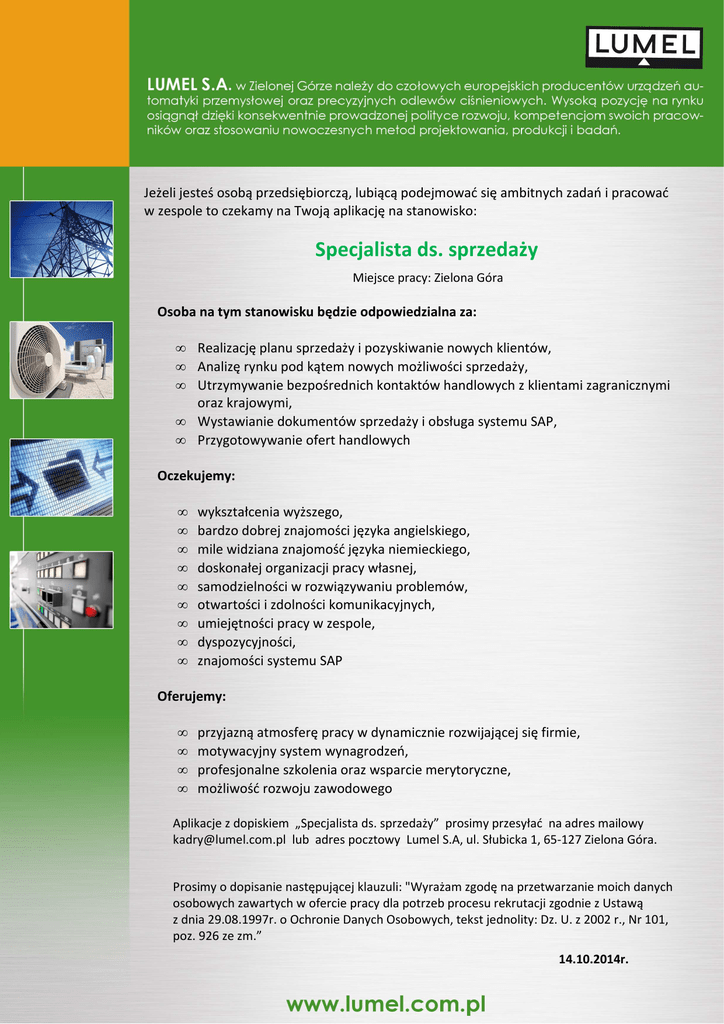 Jeżeli jesteś osobą przedsiębiorczą, lubiącą podejmować się ambitnych zadań i pracować w zespole to czekamy na Twoją aplikację na stanowisko: Specjalista ds. sprzedaży Miejsce pracy: Zielona Góra Osoba na tym stanowisku będzie odpowiedzialna za: • • • • • Realizację planu sprzedaży i pozyskiwanie nowych klientów, Analizę rynku pod kątem nowych możliwości sprzedaży, Utrzymywanie bezpośrednich kontaktów handlowych z klientami zagranicznymi oraz krajowymi, Wystawianie dokumentów sprzedaży i obsługa systemu SAP, Przygotowywanie ofert handlowych Oczekujemy: • • • • • • • • • wykształcenia wyższego, bardzo dobrej znajomości języka angielskiego, mile widziana znajomość języka niemieckiego, doskonałej organizacji pracy własnej, samodzielności w rozwiązywaniu problemów, otwartości i zdolności komunikacyjnych, umiejętności pracy w zespole, dyspozycyjności, znajomości systemu SAP Oferujemy: • • • • przyjazną atmosferę pracy w dynamicznie rozwijającej się firmie, motywacyjny system wynagrodzeń, profesjonalne szkolenia oraz wsparcie merytoryczne, możliwość rozwoju zawodowego Aplikacje z dopiskiem „Specjalista ds. sprzedaży” prosimy przesyłać na adres mailowy [email protected] lub adres pocztowy Lumel S.A, ul. Słubicka 1, 65-127 Zielona Góra. Prosimy o dopisanie następującej klauzuli: "Wyrażam zgodę na przetwarzanie moich danych osobowych zawartych w ofercie pracy dla potrzeb procesu rekrutacji zgodnie z Ustawą z dnia 29.08.1997r. o Ochronie Danych Osobowych, tekst jednolity: Dz. U. z 2002 r., Nr 101, poz. 926 ze zm.” 14.10.2014r.