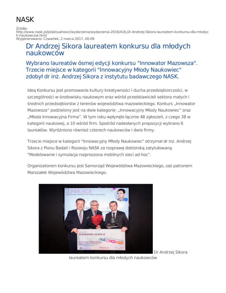 NASK Źródło: http://www.nask.pl/pl/aktualnosci/wydarzenia/wydarzenia-2016/416,Dr-Andrzej-Sikora-laureatem-konkursu-dla-mlodyc h-naukowcow.html Wygenerowano: Czwartek, 2 marca 2017, 00:09 Dr Andrzej Sikora laureatem konkursu dla młodych naukowców Wybrano laureatów ósmej edycji konkursu "Innowator Mazowsza". Trzecie miejsce w kategorii "Innowacyjny Młody Naukowiec" zdobył dr inż. Andrzej Sikora z instytutu badawczego NASK. Ideą Konkursu jest promowanie kultury kreatywności i ducha przedsiębiorczości, w szczególności w środowisku naukowym oraz wśród przedstawicieli sektora małych i średnich przedsiębiorstw z terenów województwa mazowieckiego. Konkurs „Innowator Mazowsza” podzielony jest na dwie kategorie: „Innowacyjny Młody Naukowiec” oraz „Młoda Innowacyjna Firma”. W tym roku wpłynęło łącznie 48 zgłoszeń, z czego 38 w kategorii naukowej, a 10 wśród firm. Spośród nadesłanych propozycji wybrano 6 laureatów. Wyróżniono również czterech naukowców i dwie firmy. Trzecie miejsce w kategorii "Innowacyjny Młody Naukowiec" otrzymał dr inż. Andrzej Sikora z Pionu Badań i Rozwoju NASK za rozprawę doktorską zatytułowaną "Modelowanie i symulacja rozproszona mobilnych sieci ad-hoc". Organizatorem konkursu jest Samorząd Województwa Mazowieckiego, zaś patronem Marszałek Województwa Mazowieckiego. Dr Andrzej Sikora laureatem konkursu dla młodych naukowców