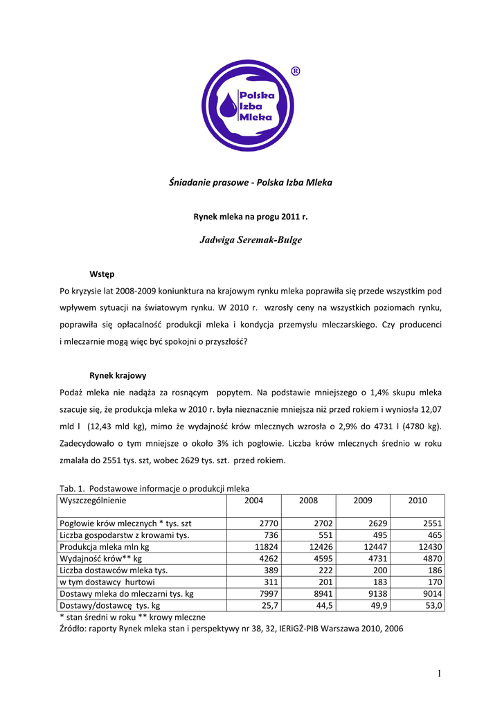 Śniadanie prasowe - Polska Izba Mleka Rynek mleka na progu 2011 r. Jadwiga Seremak-Bulge Wstęp Po kryzysie lat 2008-2009 koniunktura na krajowym rynku mleka poprawiła się przede wszystkim pod wpływem sytuacji na światowym rynku. W 2010 r. wzrosły ceny na wszystkich poziomach rynku, poprawiła się opłacalnośd produkcji mleka i kondycja przemysłu mleczarskiego. Czy producenci i mleczarnie mogą więc byd spokojni o przyszłośd? Rynek krajowy Podaż mleka nie nadąża za rosnącym popytem. Na podstawie mniejszego o 1,4% skupu mleka szacuje się, że produkcja mleka w 2010 r. była nieznacznie mniejsza niż przed rokiem i wyniosła 12,07 mld l (12,43 mld kg), mimo że wydajnośd krów mlecznych wzrosła o 2,9% do 4731 l (4780 kg). Zadecydowało o tym mniejsze o około 3% ich pogłowie. Liczba krów mlecznych średnio w roku zmalała do 2551 tys. szt, wobec 2629 tys. szt. przed rokiem. Tab. 1. Podstawowe informacje o produkcji mleka Wyszczególnienie 2004 2008 2009 Pogłowie krów mlecznych * tys. szt 2770 2702 2629 Liczba gospodarstw z krowami tys. 736 551 495 Produkcja mleka mln kg 11824 12426 12447 Wydajnośd krów** kg 4262 4595 4731 Liczba dostawców mleka tys. 389 222 200 w tym dostawcy hurtowi 311 201 183 Dostawy mleka do mleczarni tys. kg 7997 8941 9138 Dostawy/dostawcę tys. kg 25,7 44,5 49,9 * stan średni w roku ** krowy mleczne Źródło: raporty Rynek mleka stan i perspektywy nr 38, 32, IERiGŻ-PIB Warszawa 2010, 2006 2010 2551 465 12430 4870 186 170 9014 53,0 1 Utrzymujące się od połowy 2008 r. do połowy 2010 r. spadkowe tendencje cen skupu spowodowały, że stopa redukcji pogłowia krów mlecznych w 2010 r. przekraczała wyraźnie 2% ( 2,6% w pierwszym i 2,2%.w drugim półroczu). Jeszcze szybciej ubywało gospodarstw utrzymujących krowy oraz dostawców mleka do mleczarni. Ich liczba zmalała o około 7%. Warto dodad, że w 2010 r. po raz pierwszy w historii liczba najmniejszych gospodarstw utrzymujących krowy (do 9 krów) zmniejszyła się aż o 1/3. Zmalała także liczba gospodarstw utrzymujących 10-29 krów. (o około 0,5%). Wyraźnie wzrosła natomiast liczba gospodarstw utrzymujących 30-99 krów (o około 3%) oraz utrzymujących więcej niż 200 krów (o 56%) kosztem gospodarstw utrzymujących 100199 krów. Wskazuje to, że spadek opłacalności produkcji mleka w latach 2008-2009 przyspieszył proces koncentracji produkcji mleka. Kooczy się początkowy etap procesu koncentracji chowu bydła mlecznego, który w ciągu 6 lat doprowadził do podwojenia skali produkcji statystycznego dostawcy mleka do mleczarni. W 2010 r. dostarczył on ponad .53 tys. kg mleka i posiadał stado liczące ponad 10 krów. Polskie gospodarstwa nastawione na produkcję mleka stosują więc strategię obrony poziomu osiąganych dochodów przede wszystkim poprzez wzrost skali produkcji. Strategia ta z sukcesem została wcześniej wypróbowana w krajach posiadających nowoczesne wysoko rozwinięte mleczarstwo. Mali producenci z produkcji mleka rezygnują, znajdując inne źródła dochodu. Redukcji krów mlecznych od kilku lat towarzyszy szybki wzrost liczby krów pozo-stałych, wśród których coraz większą częśd stanowią tzw. krowy mamki - wykorzystywane przede wszystkim do odchowu cieląt. Ich pogłowie w 2010 r. zostało zwiększone o prawie 27% do 106 tys. szt. średnio w roku, i w porównaniu z 2004 rokiem było 2,5 raza większe. Potwierdza to postępującą restrukturyzację chowu bydła w Polsce i świadczy o rosnącym zainteresowaniu produkcją bydła mięsnego. Rosnącej koncentracji produkcji mleka towarzyszy wzrost jego towarowości. W latach 2009 – 2010 tylko 20% mleka zużyto w gospodarstwach. Na sprzedaż przeznaczono 80% wyprodukowanego mleka, z czego około 73% skupił przemysł mleczarski. 6-7% mleka trafiło bezpośrednio do sprzedaży na lokalnych rynkach. Przed akcesją do przemysłu mleczarskiego trafiało 60% wyprodukowanego w kraju mleka. Tab. 2. Podstawowe informacje o przetwórstwie mleka Wyszczególnienie Liczba mleczarni Liczba zatrudnionych tys. Wartośd sprzedaży mln zł Przerób mleka/mleczarnię mln. Kg Zatrudnienie/mleczarnię osób Wartośd sprzedaży/mleczarnię mln zł 2004 265 41,4 17191 30,2 156 64,9 2008 224 35,8 20894 39,9 160 93,3 2009 214 35,6 20888 42,7 166 97,6 2010** 214 35,6 23987 42,1 166 112,1 2 Wartośd sprzedaży/zatrudnionego tys. zł 415 584 Wielkośd przerobu/zatrudnionego tys. kg 195 250 * zatrudniających co najmniej 9 osób ** szacunek na podstawie wyników I półrocza Źródło: niepublikowane dane GUS 587 257 671 253 Proces koncentracji w przetwórstwie mleka przebiega wolniej niż w jego produkcji, mimo tego że postępująca liberalizacja i reforma WPR prowadząca do likwidacji kwot rodzi nowe wyzwania. Wprawdzie w latach 2004 – 2010 liczba mleczarni zmalała o 20%, ale polskie mleczarstwo należy do najbardziej rozdrobnionych w UE i mało efektywnych. Dla porównania w Niemczech podobna liczba mleczarni przerabia trzy razy tyle mleka , przy niższym o 18% zatrudnieniu. Wprawdzie 5 największych mleczarni (Mlekpol, Mlekovita, Polmlek, Lacpol, Danone) ma ponad 40% udział w rynku mleka, ale wartośd ich sprzedaży waha się zaledwie od 360 do 500 mln euro rocznie na przedsiębiorstwo. Największe przedsiębiorstwa zajmujące się przetwórstwem mleka w UE-15 są 1020 razy większe. Poważnym problemem polskiego mleczarstwa jest także nadmiar mocy produkcyjnych, które obecnie są znacznie większe niż były na początku lat 90., kiedy szacowano je na 12,5 mld l. Intensywne inwestowanie zwłaszcza w modernizację linii technologicznych nie połączone z niezbędną restrukturyzacją doprowadziło do znacznego zwiększenia potencjału produkcyjnego, który szacowany jest obecnie nawet na ponad 15 mld l. Jego wykorzystanie w zależności od rodzaju linii technologicznych wynosi od 50 do 70%. Musi to skutkowad wysokimi kosztami majątkowymi. Kolejnym problemem są rozbudowane kanały dystrybucji i wysokie koszt