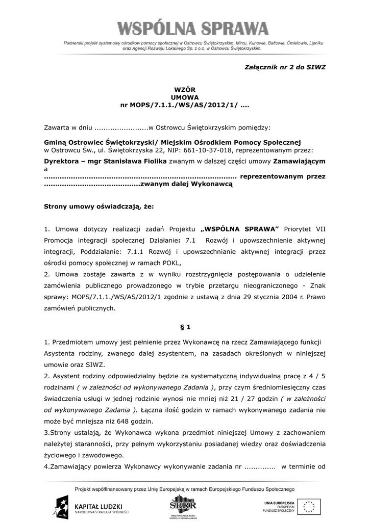 Załącznik nr 2 do SIWZ WZÓR UMOWA nr MOPS/7.1.1./WS/AS/2012/1/ .... Zawarta w dniu ........................w Ostrowcu Świętokrzyskim pomiędzy: Gminą Ostrowiec Świętokrzyski/ Miejskim Ośrodkiem Pomocy Społecznej w Ostrowcu Św., ul. Świętokrzyska 22, NIP: 661-10-37-018, reprezentowanym przez: Dyrektora – mgr Stanisława Fiolika zwanym w dalszej części umowy Zamawiającym a ...................................................................................... reprezentowanym przez ...........................................zwanym dalej Wykonawcą Strony umowy oświadczają, że: 1. Umowa dotyczy realizacji zadań Projektu „WSPÓLNA SPRAWA” Priorytet VII Promocja integracji społecznej Działanie: 7.1 Rozwój i upowszechnienie aktywnej integracji, Poddziałanie: 7.1.1 Rozwój i upowszechnianie aktywnej integracji przez ośrodki pomocy społecznej w ramach POKL, 2. Umowa zostaje zawarta z w wyniku rozstrzygnięcia postępowania o udzielenie zamówienia publicznego prowadzonego w trybie przetargu nieograniczonego - Znak sprawy: MOPS/7.1.1./WS/AS/2012/1 zgodnie z ustawą z dnia 29 stycznia 2004 r. Prawo zamówień publicznych. §1 1. Przedmiotem umowy jest pełnienie przez Wykonawcę na rzecz Zamawiającego funkcji Asystenta rodziny, zwanego dalej asystentem, na zasadach określonych w niniejszej umowie oraz SIWZ. 2. Asystent rodziny odpowiedzialny będzie za systematyczną indywidualną pracę z 4 / 5 rodzinami ( w zależności od wykonywanego Zadania ), przy czym średniomiesięczny czas świadczenia usługi w jednej rodzinie wynosi nie mniej niż 21 / 27 godzin ( w zależności od wykonywanego Zadania ). Łączna ilość godzin w ramach wykonywanego zadania nie może być mniejsza niż 648 godzin. 3.Strony ustalają, że Wykonawca wykona przedmiot niniejszej Umowy z zachowaniem należytej staranności, przy pełnym wykorzystaniu posiadanej wiedzy oraz doświadczenia życiowego i zawodowego. 4.Zamawiający powierza Wykonawcy wykonywanie zadania nr .............. w terminie od 1 maja 2012r. do 31 października 2012r. 5. Wykonawca będzie realizował zamówienie na terenie miasta Ostrowiec Świętokrzyski w miejscu zamieszkania rodzin objętych usługą oraz w innych miejscach związanych ze świadczeniem usługi asystenta rodziny. 6. Wizyty Wykonawcy u rodzin objętych wsparciem mogą odbywać sie wyłącznie w godzinach pomiędzy 7.00 a 20.00. §2 1.W ramach świadczenia usługi Wykonawca - Asystent rodzinny będzie zobowiązany do współpracy i osobistego kontaktu z ........ rodzinami, w tym w szczególności do: a) udzielania pomocy rodzinom w poprawie ich sytuacji życiowej, w tym w zdobywaniu umiejętności prawidłowego prowadzenia gospodarstwa domowego; b) udzielania pomocy rodzinom w rozwiązywaniu problemów socjalnych; c) udzielania pomocy rodzinom w rozwiązywaniu problemów psychologicznych; d) udzielania pomocy rodzinom w rozwiązywaniu problemów wychowawczych z dziećmi; e) wspierania aktywności społecznej rodzin; f) motywowania członków rodzin do podnoszenia kwalifikacji zawodowych; g) udzielania pomocy w poszukiwaniu, podejmowaniu i utrzymywaniu pracy zarobkowej; h) motywowania do udziału w zajęciach grupowych dla rodziców, mających na celu kształtowania prawidłowych wzorców rodzicielskich i umiejętności psychospołecznych; i) udzielanie wsparcia dzieciom, w szczególności poprzez udział w zajęciach psychoedukacyjnych; j) podejmowania działań interwencyjnych i zaradczych w sytuacji zagrożenia bezpieczeństwa dzieci i rodzin; k) prowadzenia indywidualnych konsultacji wychowawczych dla rodziców i dzieci; l) sporządzania, na wniosek sądu, opinii o rodzinie i jej członkach; m) współpracy z jednostkami administracji rządowej i samorządowej, właściwymi organizacjami pozarządowymi oraz innymi podmiotami i osobami specjalizującymi się w działaniach na rzecz dziecka i rodziny; n ) współpracy z zespołem interdyscyplinarnym lub grupą roboczą, o których mowa w art. 9a ustawy z dnia 29 lipca 2005 r. o przeciwdziałaniu przemocy w rodzinie (Dz. U. Nr 180, poz. 1493, z 2009 r. Nr 206, poz. 1589 oraz z 2010 r. Nr 28, poz. 146 i Nr 125, poz. 842), lub innymi podmiotami, których pomoc asystent rodziny przy wykonywaniu swoich zadań uzna za niezbędną. 2. Celem prawidłowego wykonywania usługi Wykonawca jest zobowiązany do prowadzenia dokumentacji dotyczącej pracy z rodziną tj. a) opracowania w konsultacji z pracownikiem socjalnym planu pracy z każdą z rodzin objętych wsparciem i przekazania go Zamawiającemu w terminie 10 dni od daty podpisania umowy – wg wzoru stanowiącego zał. Nr 1 do umowy; b) sporządzania miesięcznej karty opisu wykonywanych czynności z każdą z rodzin objętych wsparciem i przekazywania jej Zamawiającemu w terminie 5 dni po zakończeniu każdego miesiąca świadczenia usługi - wg wzoru stanowiącego zał. Nr 2 do umowy; c) sporządzania w każdym miesiącu karty czasu pracy asystenta potwierdzanej przez pełnoletniego członka rodziny objętej wsparciem – wg wzoru stanowiącego zał. Nr 4 do umowy, d) sporządzania okresowej oceny z wykonania planu pracy z rodziną (dla każdej rodziny oddzielnie) i przekazywania jej Zamawiającemu w terminie 10 dni po zakończeniu każdego kwartału świadczenia usługi - wg wzoru stanowiącego zał. Nr 3 do umowy; e) wprowadzania do systemu POMOST danych niezbędnych do sporządzenia sprawozdania, o którym mowa w art. 176 pkt 6 ustawy o wspieraniu rodziny i pieczy zastępczej f) uczestniczenia w spotkaniu informacyjnym niezwłocznie po podpisaniu umowy w terminie wskazanym przez Zamawiającego, w celu przekazania listy rodzin wytypowanych do współpracy ze szczegółowymi danymi teleadresowymi oraz listą pracowników socjalnych ze szczegółowymi danymi teleadresowymi, g) ścisłej współpracy z pracownikami socjalnymi w zakresie szczegółowo wskazanym w zakresie: - zapoznania się z sytuacją wytypowanych do współpracy rodzin na wstępie realizacji