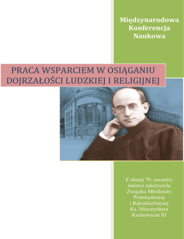 Międzynarodowa Konferencja Naukowa PRACA WSPARCIEM W OSIĄGANIU DOJRZAŁOŚCI LUDZKIEJ I RELIGIJNEJ Z okazji 70. rocznicy śmierci założyciela Związku Młodzieży Przemysłowej i Rękodzielniczej Ks. Mieczysława Kuznowicza SJ ORGANIZATORZY *** Budynek Związku wybudowany z inicjatywy Ks. M. Kuznowicza SJ *** MIEJSCE Akademia Ignatianum w Krakowie TERMIN 9-10 kwietnia 2015 r. PATRONAT HONOROWY PPA ATTR RO ON NA ATT H HO ON NO OR RO OW WY Y *** K KO OM MIITTEETT N NA AU UK KO OW WY Y *** PPR RZZEEW WO OD DN NIIC CZZĄ ĄC CY YK KO ON NFFEER REEN NC CJJII *** 1 • PRACA I TOŻSAMOŚĆ OSOBY W WYMIARZE NATURALNYM I RELIGIJNYM (wychowanie przez pracę; wychowanie do pracy; praca i autorealizacja; stawanie się dorosłym przez pracę; praca w procesie resocjalizacji i readaptacji społecznej; etos pracy). 2 • WIELOKULTUROWY WYMIAR PRACY (filozofia pracy; kultura i antropologia u podstaw wartości pracy ludzkiej; pedagogika pracy – historia i teraźniejszość; środowiska wychowawcze). 3 • UDZIAŁ INSTYTUCJI W AKTYWIZOWANIU OBYWATELI (praca i społeczeństwo obywatelskie; rynek edukacyjny a rynek pracy; szkoła wychowuje do pracy; praca społeczna – czas wolny – ekonomia – etyka). 4 • BRAK PRACY – ZAGROŻENIEM ROZWOJU OSOBY (przyczyny i konsekwencje; praca jako wyraz indywidualizmu prawdziwego i fałszywego; praca jako przywilej; emigracja – poszukiwanie pracy). K KO OM MIITTEETT O OR RG GA AN NIIZZA AC CY YJJN NY Y *** W WA AŻŻN NEE TTEER RM MIIN NY Y // W WA AR RU UN NK KII ZZG GŁŁO OSSZZEEN NIIA A // K KO ON NTTA AK KTT *** *** *** ---< SERDECZNIE ZAPRASZAMY >---
