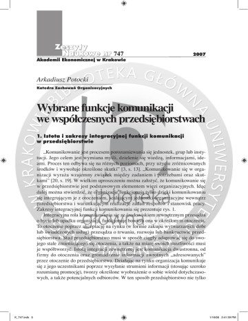 Zeszyty Naukowe nr 747 Akademii Ekonomicznej w Krakowie 2007 Arkadiusz Potocki Katedra Zachowań Organizacyjnych Wybrane funkcje komunikacji we współczesnych przedsiębiorstwach 1. Istota i zakresy integracyjnej funkcji komunikacji w przedsiębiorstwie „Komunikowanie jest procesem porozumiewania się jednostek, grup lub instytucji. Jego celem jest wymiana myśli, dzielenie się wiedzą, informacjami, ideami. Proces ten odbywa się na różnych poziomach, przy użyciu zróżnicowanych środków i wywołuje określone skutki” [3, s. 13]. „Komunikowanie się w organizacji wyraża wzajemny związek między zadaniem i potrzebami oraz skutkami” [20, s. 19]. W wielkim uproszczeniu można założyć, że komunikowanie się w przedsiębiorstwie jest podstawowym elementem więzi organizacyjnych. Idąc dalej można stwierdzić, że organizacje funkcjonują tylko dzięki komunikowaniu się integrującym je z otoczeniem, scalającym jednostki organizacyjne wewnątrz przedsiębiorstwa i warunkującym realizacje zadań zespołów i stanowisk pracy. Zakresy integracyjnej funkcji komunikowania się prezentuje rys. 1. Integracyjna rola komunikowania się ze środowiskiem zewnętrznym przesądza o bycie lub upadku organizacji, funkcjonuje bowiem ona w określonym otoczeniu. To otoczenie poprzez akceptację na rynku (w formie zakupu wytwarzanych dóbr lub świadczonych usług) przesądza o trwaniu, rozwoju lub bankructwie przedsiębiorstwa. Stąd przedsiębiorstwo musi w sposób ciągły adaptować się do swojego stale zmieniającego się otoczenia, a także na miarę swoich możliwości musi je współtworzyć. Istotą integracji zewnętrznej jest komunikacja dwustronna, od firmy do otoczenia oraz gromadzenie informacji zwrotnych „adresowanych” przez otoczenie do przedsiębiorstwa. Działając na rynku organizacja komunikuje się z jego uczestnikami poprzez wysyłanie strumieni informacji (stosując szeroko rozumianą promocję), tworzy określone wyobrażenie o sobie wśród dotychczasowych, a także potencjalnych odbiorców. W ten sposób przedsiębiorstwo nie tylko K_747.indb 5 1/16/08 2:41:39 PM Arkadiusz Potocki zaznacza swoje istnienie na rynku, ale i podejmuje walkę konkurencyjną. Z drugiej strony komunikowanie się z otoczeniem ma za zadanie dostarczenie organizacji informacji o preferencjach i zachowaniach konsumentów, o zachowaniach konkurentów, ich wyrobach i usługach itd. OTOCZENIE ZEWNĘTRZNE DALSZE BLIŻSZE Integracja zewnętrzna Integracja wewnętrzna (operacyjna, procesowa) Integracja intelektualna Integracja emocjonalna Rys. 1. Wymiary integracyjnej funkcji komunikowania się w przedsiębiorstwie Źródło: opracowanie własne. Zatem warunkiem integracyjnej funkcji komunikacji w organizacji jest strategia komunikacji, której celem jest m.in. dostarczenie pracownikom wizji instytucji, tkwiącej swymi korzeniami w istniejącym potencjale i zdolnościach pracowników, oraz dziedzictwie kulturowym przedsiębiorstwa. Właśnie wizja powinna w zakresie integracji zewnętrznej, procesowej, intelektualnej i emocjonalnej pełnić rolę czynnika uzasadniającego i wywołującego procesy komunikowania się, których efektem będą zmiany w funkcjonowaniu poszczególnych jednostek i całej organizacji. Skuteczna wizja powinna: – przedstawić w jasny i wyraźny sposób obraz organizacji w przyszłości, – być atrakcyjna zarówno dla klientów, udziałowców, jak i dla pracowników, – być możliwa do zrealizowania, – być sformułowana w sposób pozwalający przedstawić ją szybko, prosto i zrozumiale, K_747.indb 6 1/16/08 2:41:40 PM Wybrane funkcje komunikacji… – być elastyczna, aby rozwijać inicjatywę jednostek i zachować swą aktualność, – koncentrować się na kluczowych zagadnieniach, które są istotne dla przyszłości (por. [9, s. 211–212]). 2. Zewnętrzna integracyjna funkcja komunikacji w przedsiębiorstwie Integracyjna funkcja komunikacji zewnętrznej zdaniem Z. Mikołajczyk [12, s. 235–236] ma następujące postacie: operacyjną, strategiczną, uczestniczącą, obserwującą oraz upowszechniającą. Komunikacja zewnętrzna operacyjna polega na bezpośrednich kontaktach zawodowych z otoczeniem, np. z klientami, dostawcami, władzami administracyjnymi, konkurentami. Pracownicy organizacji, działając w jej imieniu, prezentują jej obraz i uzyskują potrzebne informacje dla działalności bieżącej. Komunikacja zewnętrzna uczestnicząca to taka, w której członkowie danej organizacji są czynnie włączeni w tworzenie sieci powiązań z otoczeniem, np. przez wybór do władz administracyjnych miasta lub regionu, udział w organizacjach związkowych, zrzeszeniach przedsiębiorstw (np. Izby Przemysłowo-Handlowe). Takie kontakty niekoniecznie muszą wpływać na bieżącą sytuację przedsiębiorstwa, ale mogą być pomocne w sytuacjach trudnych lub wydarzeniach znaczących dla przedsiębiorstwa w przyszłości. Zadaniem komunikacji zewnętrznej obserwującej jest wychwytywanie danych strategicznych z otoczenia. Dane te dotyczą działań konkurencji, oznak zmian w technice, zmian na rynku pracy itp. Zadania tego typu wymagają prowadzenia badań i analiz, które będą następnie podstawą do podejmowania decyzji strategicznych. Komunikowanie zewnętrzne upowszechniające obejmuje działania, których celem jest informowanie otoczenia o możliwościach, propozycjach i usługach przedsiębiorstwa. Dotyczy szeroko rozumianej promocji, a w szczególności reklam w środkach masowego przekazu, działalnośći łączącej upowszechnianie wiedzy o organizacji z działalnością społeczną, popularnonaukową (public relations), np.: – sponsorowanie wydarzeń kulturalnych i sportowych, – mecenat nad instytucjami społecznymi, kulturalnymi i humanitarnymi, – udział w wystawach, konferencjach naukowych, targach, – publikowanie artykułów w periodykach itd. Biorąc pod uwagę, częstotliwość, wagę i zasięg komunikacji zewnętrznej, można w