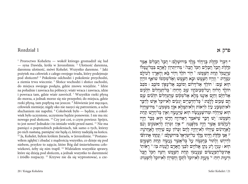 VIII: ??? Wola (Racon) Rozdział 1 Proroctwo Koheleta — wokół którego gromadził się lud — syna Dawida, króla w Jerozolimie. 2 Ulotność daremna, daremna ulotność, mówi Kohelet. Wszystko daremne. 3 Jaki pożytek ma człowiek z całego swojego trudu, który podejmuje pod słońcem? 4 Pokolenie odchodzi i pokolenie przychodzi, a ziemia trwa wiecznie. 5 Słońce wschodzi i słońce zachodzi, do miejsca swojego podąża, gdzie znowu wzejdzie. 6 Idzie na południe i zawraca ku północy; wiatr wraca i zawraca, idzie i powraca tam, gdzie wiatr zawrócił. 7 Wszystkie rzeki płyną do morza, a jednak morze się nie przepełni; do miejsca, gdzie rzeki płyną, tam popłyną raz jeszcze. 8 Mówienie jest męczące, człowiek niemieje; nigdy oko nie nasyci się patrzeniem, a ucho słuchaniem nie napełni. 9 Cokolwiek było — będzie, a cokolwiek było uczynione, uczynione będzie ponownie. I nie ma nic nowego pod słońcem. 10 Czy jest coś, o czym powiesz: Spójrz, to jest nowe! Jednakże i to istniało wieki przed nami. 11 Nie ma pamięci o poprzednich pokoleniach, tak samo o tych, którzy po nich nastaną, pamiętać nie będą ci, którzy nadejdą na końcu. 12 Ja, Kohelet, byłem królem Jisraela, w Jerozolimie. 13 Postanowiłem zgłębić i zbadać z mądrością wszystko, co dzieje się pod niebem, przykre to zajęcie, które Bóg dał śmiertelnemu człowiekowi, żeby się nim trapił. 14 Widziałem wszystkie sprawy, które się dzieją pod słońcem, a jednak wszystko to daremność i źródło rozpaczy. 15 Krzywe nie da się wyprostować, a cze- 20 / Księga Koheleta Pieśń duszy 1 Kabała Sefer Kohelet / 21 VIII: ??? Wola (Racon) go nie ma, tego nie policzysz. 16 Przekonywałem sam siebie tymi słowami: Oto ja ogromną posiadłem mądrość, większą niż wszyscy, którzy władali w Jerozolimie przede mną, a mój umysł doświadczył wiele mądrości i wiedzy. 17 Postanowiłem oszacować mądrość i wiedzę, szaleństwo i głupotę. I poznałem, że również to jest utrapieniem ducha. 18 Bo w wielkiej mądrości wiele cierpienia, a ten, kto pomnaża wiedzę, pomnaża ból. Rozdział 2 I wtedy powiedziałem sobie: Chodź, sprawdź, co warta jest radość i doświadcz przyjemności. Ale to też okazało się daremnością. 2 O śmiechu powiedziałem: To szaleństwo! A o radości: Cóż ona daje? 3 Postanowiłem pobudzić moje ciało winem — umysł mój jednak kierując mądrością — żeby trzymać się głupstwa, aż rozpoznam, co jest najlepsze dla ludzi, żeby to czynili pod niebem podczas nielicznych dni ich życia 4 Uczyniłem wspaniałe rzeczy — zbudowałem dla siebie domy, zasadziłem winnice. 5 Założyłem dla siebie ogrody i sady i umieściłem w nich drzewa wydające wszelkiego rodzaju owoce. 6 Urządziłem sadzawki, dla nawadniania z nich gaju wzrastających drzew. 7 Nabyłem niewolników i służące, miałem też niewolników urodzonych w domu, a również stad bydła i owiec więcej niż wszyscy, którzy byli przede mną w Jerozolimie. 8 Nagromadziłem sobie również srebra i złota, i skarbów królewskich, i krain. Zapewniłem sobie śpiewaków i śpiewaczki, powozy i rydwany, i każdą ludzką rozkosz. 9 Stałem się potężny i zebrałem więcej bogactwa niż ktokolwiek przede mną w Jerozolimie. A mądrość moja nadal pozostała ze mną. 10 Nie odmówiłem swoim oczom niczego z tego, czego zapragnęły, ani nie powstrzymywałem się od żadnej przyjemności, lecz cieszyłem się z całego mojego trudu. I była to nagroda za cały mój trud. 11 Ale gdy ogarnąłem 22 / Księga Koheleta Pieśń duszy 1 Kabała Sefer Kohelet / 23 VIII: ??? Wola (Racon) myślą wszystkie dzieła, których dokonałem własnymi rękami, i wysiłek, który podjąłem czyniąc je — oto wszystko daremność i źródło rozpaczy. I nic nie przynosi pożytku pod słońcem. 12 Wtedy skierowałem moje myśli ku mądrości, szaleństwu i głupocie — bo co może uczynić człowiek, który nastanie po królu nad to, co już było uczynione? 13 I spostrzegłem, że z mądrości większy pożytek niż z głupoty, tak jak ze światła większy pożytek niż z ciemności. 14 Mądry ma oczy w swojej głowie, a głupi chodzi w ciemności, jednak pojąłem, że los jeden czeka wszystkich. 15 Więc pomyślałem sobie, że los głupca tak samo mnie czeka, po cóż więc usiłowałem być mądry? Odpowiedziałem sobie, że to też daremność. 16 Bo mądry razem z głupim nie będzie pamiętany na zawsze, bo gdy miną dni, które dopiero mają nadejść, obaj będą zapomniani. Czyż mądry nie umiera tak samo jak głupi? 17 Dlatego znienawidziłem życie. Byłem zasmucony wszystkim tym, co się dzieje pod słońcem, bo to wszystko daremność i źródło rozpaczy. 18 Znienawidziłem nawet owoce mojego trudu, który podjąłem pod słońcem, bo muszę je pozostawić człowiekowi, który nastanie po mnie. 19 Kto wie, czy będzie on mądry, czy głupi, a będzie władał owocami mojego trudu i mojej mądrości pod słońcem. To też daremność. 20 Zacząłem więc wątpić o wszystkich owocach mojego trudu pod słońcem. 21 Bo bywa że niejeden człowiek trudzi się z mądrością, umiejętnie i roztropnie, a oddaje swój udział temu, który się nie trudził. To też daremność i wielka niesprawiedliwość. 22 Bo co ma człowiek z całego swego trudu i mozołu, które podejmuje pod słońcem? 23 Całe jego życie jest przepełnione bólem i niepokojem, a nawet nocą jego umysł nie zaznaje spokoju. To też daremność. 24 Czy nie jest dobrze dla człowieka jeść i pić, i cieszyć się ze swojego trudu? Pojąłem, że to też pochodzi z mocy Boga. 25 Bo kto ma jeść i kto ma się cieszyć, jeżeli nie ja? 26 On udzielił mądrości, wiedzy i radości człowiekowi, który mu się podoba. Lecz grzesznikowi wszczepił popęd zbierania i gromadzenia, żeby przekazał to potem temu, który się Bogu podoba. To też daremność i źródło rozpaczy. 24 / Księga Koheleta Pieśń du