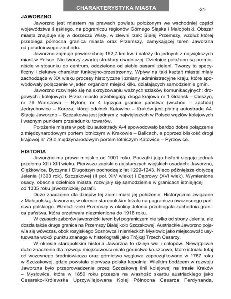 JAWORZNO CHARAKTERYSTYKA MIASTA -21- Jaworzno jest miastem na prawach powiatu położonym we wschodniej części województwa śląskiego, na pograniczu regionów Górnego Śląska i Małopolski. Obszar miasta znajduje się w dorzeczu Wisły, w zlewni rzek: Białej Przemszy, wzdłuż której przebiega północna granica miasta oraz Przemszy, zamykającej teren Jaworzna od południowego-zachodu. Jaworzno zajmuje powierzchnię 152,7 km kw. i należy do jednych z największych miast w Polsce. Nie tworzy zwartej struktury osadniczej. Dzielnice położone są promieniście w stosunku do centrum, oddzielone od siebie pasami zieleni. Tworzy to specyficzny i ciekawy charakter funkcyjno-przestrzenny. Wpływ na taki kształt miasta miały zachodzące w XX wieku procesy historyczne i zmiany administracyjne kraju, które spowodowały połączenie w jeden organizm miejski kilku działających samodzielnie gmin. Jaworzno rozwinęło się na skrzyżowaniu ważnych szlaków komunikacyjnych: drogowych i kolejowych. Przez miasto przebiegają: droga krajowa nr 1 Gdańsk – Cieszyn, nr 79 Warszawa – Bytom, nr 4 łącząca granice państwa (wschód – zachód) Jędrychowice – Korcza, której odcinek Katowice – Kraków jest płatną autostradą A4. Stacja Jaworzno – Szczakowa jest jednym z największych w Polsce węzłów kolejowych i ważnym punktem przeładunku towarów. Położenie miasta w pobliżu autostrady A-4 spowodowało bardzo dobre połączenie z międzynarodowym portem lotniczym w Krakowie – Balicach, a poprzez bliskość drogi krajowej nr 79 z międzynarodowym portem lotniczym Katowice – Pyrzowice. HISTORIA Jaworzno ma prawa miejskie od 1901 roku. Początki jego historii sięgają jednak przełomu XII i XIII wieku. Pierwsze zapiski o najstarszych wiejskich osadach: Jaworzno, Ciężkowice, Byczyna i Długoszyn pochodzą z lat 1229-1243. Nieco późniejsze dotyczą Jelenia (1303 rok), Szczakowej (II poł. XIV wieku) i Dąbrowy (XVI wiek). Wymienione osady, obecnie dzielnice miasta, rozwijały się samodzielnie w granicach istniejącej od 1335 roku jaworznickiej parafii. Duże znaczenie dla dziejów tej ziemi miało jej położenie. Historycznie związane z Małopolską, Jaworzno, w okresie staropolskim leżało na pograniczu ówczesnego państwa polskiego. Wzdłuż rzeki Przemszy w okolicy Jelenia przebiegała zachodnia granica państwa, która przetrwała niezmieniona do 1918 roku. W czasach zaborów jaworznicki teren był pograniczem nie tylko od strony Jelenia, ale doszła także druga granica na Przemszy Białej koło Szczakowej. Austriackie Jaworzno pojawia się wówczas, obok rosyjskiego Sosnowca i niemieckich Mysłowic jako miejscowość usytuowana wokół punktu znanego w historiografii jako Trójkąt Trzech Cesarzy. W okresie staropolskim historia Jaworzna to dzieje wsi i chłopów. Niewątpliwie duże znaczenie dla rozwoju miejscowości miało górnictwo kruszcowe, które istniało tutaj od wczesnego średniowiecza oraz górnictwo węglowe zapoczątkowane w 1767 roku w Szczakowej, gdzie powstała pierwsza polska kopalnia. Wielkim bodźcem w rozwoju Jaworzna było przeprowadzenie przez Szczakową linii kolejowej na trasie Kraków – Mysłowice, która w 1850 roku przeszła na własność skarbu austriackiego jako Cesarsko-Królewska Uprzywilejowana Kolej Północna Cesarza Ferdynanda, -22- a następnie została włączona w ogólnokrajową sieć kolejową Austrii. Dzięki temu Szczakowa uzyskała status ważnego połączenia kolejowego. Uruchomienie kopalń węgla i hut cynkowych sprowadziło do jaworznickiej okolicy osiedleńców z różnych stron. Większość przybyła zza pobliskiej granicy na Przemszy, czyli z Pruskiego Śląska, ale również z Czech, Węgier. Żyła tu również silnie reprezentowana społeczność żydowska. Do dzisiaj pozostał ślad jej obecności w postaci okazałego kirkutu – cmentarza. Liczba mieszkańców rosła systematycznie w miarę rozwoju tutejszych zakładów przemysłowych i rzemieślniczych. Współczesne miasto Jaworzno jest efektem kolejnych reform administracyjnych przeprowadzonych po 1945 roku, kiedy to w pierwotny obręb miasta włączano systematycznie pomniejsze gminy i miasteczka. Obecnie Jaworzno, pod względem powierzchni należy do największych miast w Polsce i zamieszkiwane jest przez blisko stutysięczną ludność. ŚRODOWISKO PRZYRODNICZE MIASTA Jaworzno położone jest na terenie Wyżyny Śląskiej i pod względem powierzchni należy do największych miast w Polsce. Regiony geomorfologiczne, w obrębie których leży Jaworzno to Kotlina Biskupiego Boru (w uproszczeniu Dolina Koziego Brodu) na północnym wschodzie, Kotlina Mysłowicka na zachodzie, Zrębowe Pagóry Imielińskie w okolicach Jelenia, Rów Chrzanowski na południu w okolicach Dębu oraz Niecka Wilkoszyńska z częścią centralną i południowo – wschodnią miasta. Cechą charakterystyczną jest usytuowanie miasta w widłach rzeki Białej Przemszy i Przemszy. Najwyżej położonym punktem jest Góra Przygoń (354,7 m npm), najniżej miejsce w dolinie Przemszy (230 m npm). Wielowiekowa działalność przemysłowa związana z występowaniem na terenie Jaworzna złóż węgla kamiennego, ród cynku i ołowiu, piasku, wapienia i dolomitu ukształtowała w znaczący sposób krajobraz miasta. Wśród pagórów, garbów, nadrzecznych równin, którymi charakteryzuje się krajobraz Jaworzna pojawiły się wyrobiska po eksploatacji surowców mineralnych, hałdy odpadów pogórniczych i elektrownianych, miejscami w związku z działalnością górniczą zjawiska związane z osiadaniem gruntów. Dziś odkrywki po eksploatacji ród metali, wapienia i dolomitu stały się siedliskami niezwykle cennej roślinności. W zalanych zapadliskach pogórniczych powstały niezwykle bogate biotopy, które zasiedliły rośliny i zwierzęta dotychczas niespotykane na tych terenach. Wyeksploatowane wyrobiska popiaskowe są na bieżąco zalesiane. Ze składowiskami odpadów pogó
