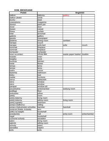 DOM, MIESZKANIE Polski balkon balkon (teatr) biurko czasopismo donica drzwi dywan firana fotel galeria gazeta jadalnia kanapa kanapa kominek kominek komputer kosz na smieci krzesło książka kuchnia kwiat lampa lampa lustro łazienka łóżko meble obrus okno okno parapet poczekalnia podłoga poduszka pokój pokój dzienny pokój dzienny pokój sypialny poręcz (balkonu) poręcz (balustrada) schodów poręcza (fotela, krzesła) półka na książki przedpokój regał ruchome schody salon salonik schody serwetka sofa Angielski balcony circle desk magazine plant pot door carpet curtain armchair gallery newspaper dining room couch sofa bed fireplace fireplace computer refuse bin chair book kitchen flower lamp lamp mirror bathroom bed furniture tablecloth window window window-sill antechamber floor pillow room living room sitting room bedroom railing banister arm bookshelf hall bookshelf escalator living room sitting room stairs napkin sofa gallery canteen sofa couch waste paper basket dustbin waityng room living room handrail ante-room antechamber sofa spiżarnia stołówka stół sufit szafa na książki, biblioteka szafa na ubrania szafka szafka łazienkowa z lustrem szafka nocna szafka wisząca ściana tapeta telewizor toaleta wanna wanna (tech) wazon wentylator zegar ścienny żyrandol sofa pantry canteen table ceiling bookcase wardrobe cupboard mirrored bathroom cabinet bedside table wall cupboard wall wallpaper TV toilet bath tank vase fan wall-clock chandelier sofa bed larder couch bookshelf cabinet televisor bathtub television set litter bin garbage can TV set television receiver