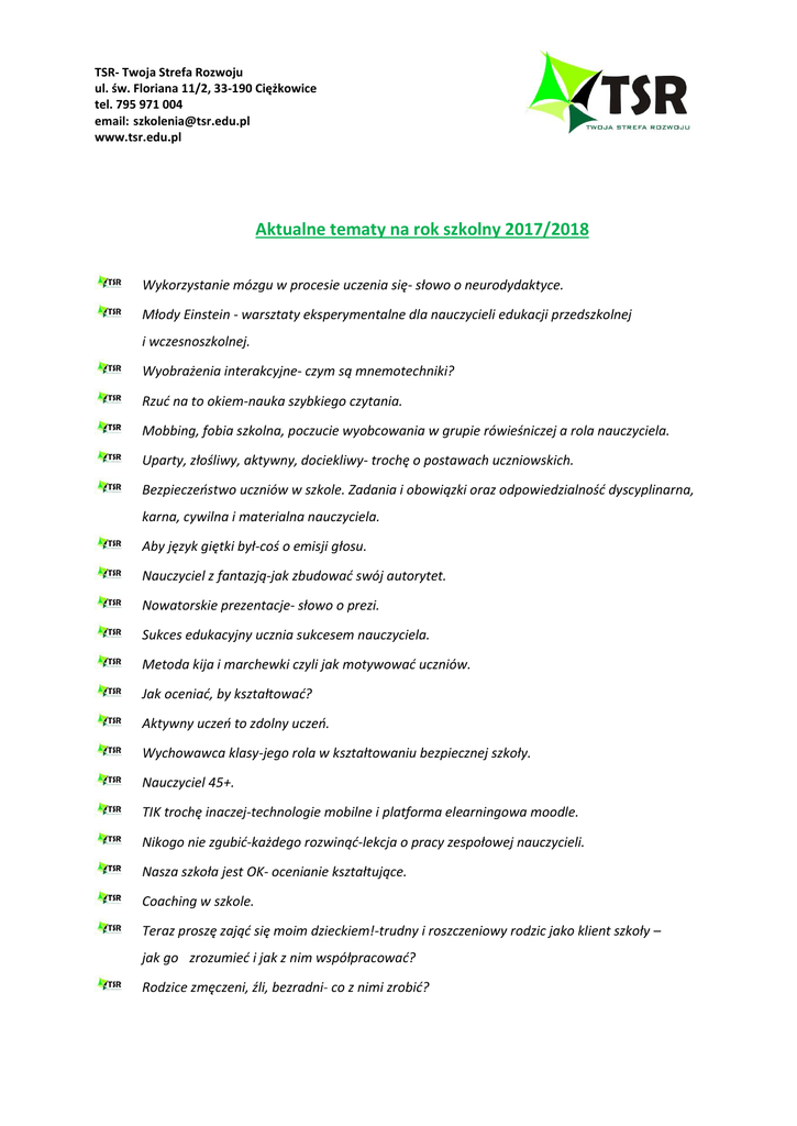 TSR- Twoja Strefa Rozwoju ul. św. Floriana 11/2, 33-190 Ciężkowice tel. 795 971 004 email: [email protected] www.tsr.edu.pl Aktualne tematy na rok szkolny 2017/2018 Wykorzystanie mózgu w procesie uczenia się- słowo o neurodydaktyce. Młody Einstein - warsztaty eksperymentalne dla nauczycieli edukacji przedszkolnej i wczesnoszkolnej. Wyobrażenia interakcyjne- czym są mnemotechniki? Rzuć na to okiem-nauka szybkiego czytania. Mobbing, fobia szkolna, poczucie wyobcowania w grupie rówieśniczej a rola nauczyciela. Uparty, złośliwy, aktywny, dociekliwy- trochę o postawach uczniowskich. Bezpieczeństwo uczniów w szkole. Zadania i obowiązki oraz odpowiedzialność dyscyplinarna, karna, cywilna i materialna nauczyciela. Aby język giętki był-coś o emisji głosu. Nauczyciel z fantazją-jak zbudować swój autorytet. Nowatorskie prezentacje- słowo o prezi. Sukces edukacyjny ucznia sukcesem nauczyciela. Metoda kija i marchewki czyli jak motywować uczniów. Jak oceniać, by kształtować? Aktywny uczeń to zdolny uczeń. Wychowawca klasy-jego rola w kształtowaniu bezpiecznej szkoły. Nauczyciel 45+. TIK trochę inaczej-technologie mobilne i platforma elearningowa moodle. Nikogo nie zgubić-każdego rozwinąć-lekcja o pracy zespołowej nauczycieli. Nasza szkoła jest OK- ocenianie kształtujące. Coaching w szkole. Teraz proszę zająć się moim dzieckiem!-trudny i roszczeniowy rodzic jako klient szkoły – jak go zrozumieć i jak z nim współpracować? Rodzice zmęczeni, źli, bezradni- co z nimi zrobić? TSR- Twoja Strefa Rozwoju ul. św. Floriana 11/2, 33-190 Ciężkowice tel. 795 971 004 email: [email protected] www.tsr.edu.pl Wywiadówka inaczej czyli jak przygotować i przeprowadzić skuteczne spotkanie z rodzicamiprelekcje dla rodziców. Rodzice partnerami szkoły. Oświatowa papierologia, czyli o dokumentacji szkolnej w świetle nowych przepisów. Sponsoring w szkole-gdzie szukać wsparcia. Mediacje, negocjacje, czyli jak wywalczyć najlepsze warunki dla własnej szkoły? Jak zostać menedżerem własnej szkoły? Kadry i płace w oświacie. Jak Cię widzą-tak Cię piszą, czyli trochę o wizerunku szkoły. Jak rozmawiać i zarządzać w oświacie? Zamówienia publiczne- czym są i jakie niosą korzyści? Kontrola zarządcza w szkole. Misja szkoły-jak stworzyć dobrą koncepcję placówki? Po co nam nowa tablica? –efektywne wykorzystanie wyposażenia i warunków lokalowych szkoły. Zarządzanie szkołą/placówką - relacje dyrektora szkoły i organu prowadzącego: obszary współpracy i podział kompetencji . Logiczne myślnie w treningu twórczości. Trening kreatywności. Programowanie w szkole Ochrona danych osobowych oraz podstawy prawne ich przetwarzania. EWD (Edukacyjna Wartość Dodana) jako miary efektywności pracy szkoły Prawa i obowiązki nauczycieli i szkoły wobec agresji uczniów Przepisy prawa wsparciem dla procesu zarządzania w przedszkolu, szkole, placówce. Prawne i emocjonalne konsekwencje decyzji dyrektora związane ze zmianami organizacyjnymi w szkołach i placówkach oświatowych . Zadania dyrektora, rad pedagogicznych i organów prowadzących wynikające z ostatnich zmian w prawie oświatowym . Przemoc z użyciem mediów elektronicznych- czym właściwie jest cyberprzemoc. Alkohol, narkomania, używki. TSR- Twoja Strefa Rozwoju ul. św. Floriana 11/2, 33-190 Ciężkowice tel. 795 971 004 email: [email protected] www.tsr.edu.pl Przeciwdziałanie przemocy w rodzinie. Złość u dzieci – jak sobie z nią radzić. Współczesna młodzież wobec zagrożeń cywilizacyjnych. Zastosowanie technik behawioralnych w pracy z uczniem o zaburzonym zachowaniu Świadoma komunikacja w szkole - jak się komunikować, by osiągać cele Współpraca nauczycieli w prowadzeniu procesów edukacyjnych. Zgrany zespół- jak go stworzyć? Ocenianie kształtujące. Wspieranie pracy wychowawców klas. Wywiadówka inaczej czyli jak przygotować i przeprowadzić skuteczne spotkanie z rodzicamiprelekcje dla rodziców. TIK i programowanie. Słowo o prezi. Kompetencje kluczowe uczniów. Jak nauczyć się przedsiębiorczości. Doskonalenie komunikacji interpersonalnej dla nauczycieli . Jak radzić sobie z agresywnymi zachowaniami uczniów? Ocenianie kształtujące – wspieranie ucznia w procesie uczenia się . Efektywne zarządzanie czasem na lekcji . Budowanie motywacji, zaangażowania i pozytywnych relacji w szkole. Trening twórczości – metody kreatywne zwiększające efektywność uczenia . Dobra i efektywna lekcja – techniki i metody wspierające proces uczenia się . Trudne sytuacje w szkole – wykorzystanie procedury mediacji rówieśniczych (szkolnych). Metody aktywizujące i motywujące do nauki ucznia zdolnego. Narzędzia coachingowe wspierające proces uczenia i wychowania w szkole. Planowanie i organizowanie ewaluacji wewnętrznej. Znaczenie ewaluacji wewnętrznej i zewnętrznej w procesie rozwoju szkoły. Innowacja pedagogiczna jako narzędzie zmiany i postępu w szkole. Mediacje rówieśnicze jako wsparcie pracy wychowawców. TSR- Twoja Strefa Rozwoju ul. św. Floriana 11/2, 33-190 Ciężkowice tel. 795 971 004 email: [email protected] www.tsr.edu.pl Program Mediacji Rówieśniczych – Szkolnych. Zapobieganie przemocy i agresji w szkole - z wykorzystaniem Programu Mediacji Rówieśniczych-Szkolnych. Jak pomóc uczniowi osiągnąć sukces edukacyjny? Ocenianie kształtujące Techniki uczenia się i metody motywujące do nauki Uczeń – aktywny uczestnik procesu uczenia się Oferta edukacyjna drogą do właściwej realizacji podstawy programowej Wspieranie pracy wychowawców klas – bezpieczna szkoła Postawy uczniowskie. Jak je kształtować? Budowa koncepcji pracy szkoły Praca z uczniem młodszym Praca z uczniem o specjalnych potrzebach edukacyjnych Wykorzystanie TIK na zajęciach edukacyjnych – bezpieczny Internet Projekt edukacyjny w szkole Rodzice partnerami szkoły Nauczyciel 45+ Efektywna organizacja pracy zespołów nauczycielskich Współ