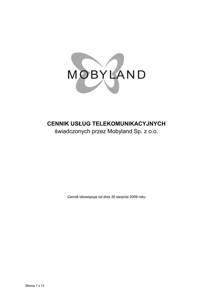 CENNIK USŁUG TELEKOMUNIKACYJNYCH świadczonych przez Mobyland Sp. z o.o. Cennik obowiązuje od dnia 30 sierpnia 2009 roku Strona 1 z 11 ROZDZIAŁ I - Aktywacja usług telefonicznych Poz. 1 Opis Aktywacja w sieci Mobyland Rodzaj opłaty / Jednostka Opłata netto (PLN) Podatek VAT (%) Opłata brutto (PLN) Opłata jednorazowa 213,11 22% 260,00 ROZDZIAŁ II - Opłaty za usługi telefoniczne Poz. Opis Rodzaj opłaty / Jednostka Opłata netto (PLN) Podatek VAT(%) Opłata brutto (PLN) 1 Miesięczna Opłata abonamentowa za korzystanie z usług telekomunikacyjnych w sieci Mobyland pln / 1 miesiąc 81,97 22% 100,00 pln /1 minuta 0,49 22% 0,60 pln /1 SMS 0,16 22% 0,20 2 3 4 5 6 7 8 9 Minuta połączenia głosowego do krajowych operatorów komórkowych oraz do krajowych operatorów stacjonarnych [1] Wychodzący SMS standardowy do krajowych operatorów komórkowych Przychodzący SMS standardowy od krajowych operatorów komórkowych Wychodzący SMS do sieci stacjonarnych Przychodzący SMS od sieci stacjonarnych MMS wychodzący do krajowych operatorów komórkowych MMS przychodzący od krajowych operatorów komórkowych Transmisja danych za 100 kB danych bezpłatny na terenie Polski pln / 1 SMS 0,98 22% 1,20 bezpłatny na terenie Polski pln / 1 MMS 0,34 22% 0,42 bezpłatny na terenie Polski pln / 100 kB 0,11 22% 0,13 Przypis do powyższej tabeli: 1. Opłaty pobierane po wykorzystaniu minut wchodzących w skład Opłaty abonamentowej "Mobyland 100". Liczba minut w ramach Opłaty abonamentowej "Mobyland 100" Poz. Opis Liczba minut 1 Liczba minut na połączenia do krajowych operatorów komórkowych i stacjonarnych, zawarta w Opłacie abonamentowej 167 Przypisy do powyższych tabel: 1. 2. 3. 4. 5. 6. 7. 8. Pakiet minut w Opłacie abonamentowej może byd wykorzystany tylko na połączenia głosowe. Pakiet minut w Abonamencie nie jest wymienny na inne usługi. Połączenia w Abonamencie nie obejmują połączeo z numerem 0~39. Cena połączeo z numerem 0~39 wynosi 0,18 zł netto (0,22 zł brutto). Wszystkie połączenia rozliczane są sekundowo, przy czym Dostawca Usług pobiera opłatę z góry za pierwsze 60 sekund połączenia niezależnie od jego trwania. Połączenia międzynarodowe, w tym do Unii Europejskiej i do USA rozliczane są zgodnie z Rozdziałem III "Połączenia międzynarodowe" niniejszego Cennika. Dostawca Usług zastrzega sobie możliwośd ograniczania połączeo międzynarodowych wychodzących do niektórych krajów Dostawca Usług zastrzega sobie możliwośd ograniczania połączeo innych niż międzynarodowe z przyczyn niezależnych od Dostawcy Usług. Opłata abonamentowa za usługi telefoniczne obejmuje elementy wskazane w Umowie i Cenniku, tj.: gotowośd Dostawcy usług do świadczenia usług oraz uprawnienie Abonenta do korzystania z usług, kompleksową obsługę Abonentów przez Biuro obsługi Klienta (call-center), w tym: obsługę serwisową, usługę prezentacji lub blokady prezentacji numeru abonenta wywołującego, usługę połączeo oczekujących. Dodatkowo Opłata abonamentowa może obejmowad zgodnie z niniejszym Cennikiem usługę połączeo konferencyjnych, limity minut lub transferowanych danych lub inne elementy określone w Cenniku. SMS to wiadomośd, zawierająca nie więcej niż 160 znaków alfanumerycznych kodowanych na 7 bitach lub nie więcej niż 140 bajtów danych w postaci binarnej. W przypadku jednorazowego przesłania wiadomości, zawierającej więcej niż 160 znaków alfanumerycznych lub więcej niż 140 bajtów danych w postaci binarnej, tekst lub dane są dzielone na odpowiednią liczbę SMS-ów, Strona 2 z 11 z których każdy obciążany jest opłatą indywidualnie, zgodnie z Cennikiem. W przypadku przesyłania wiadomości, zawierającej polskie znaki (np.: ą, ę, ł), długośd wiadomości wynosi maksymalnie 70 znaków alfanumerycznych. 9. Opłata za komunikat MMS o maksymalnej wielkości 300kB, wysyłany na terytorium Rzeczpospolitej Polskiej do wszystkich krajowych sieci komórkowych lub na adresy poczty elektronicznej, dotyczy każdych rozpoczętych 100kb w ramach jednego MMS-a wysłanego do jednego adresata. Za wysłanie wiadomości MMS jednocześnie do kilku adresatów, opłata zostanie naliczona tak, jak za wysłanie wiadomości MMS do każdego z adresatów osobno. Ważnośd wiadomości MMS wynosi 48 godzin. Jeżeli MMS nie zostanie dostarczony do odbiorcy w tym czasie, zostaje automatycznie usunięty z systemu. Opłata jest naliczana bez względu na to, czy MMS zostanie dostarczony do adresata (odnosi się do wszystkich typów MMS). 10. W przypadku połączeo nie wyszczególnionych w niniejszym cenniku, kierowanych do sieci Innego Dostawcy Usług, Dostawca Usług naliczy opłatę zgodnie z cennikiem obowiązującym u danego Dostawcy Usług ROZDZIAŁ III - Połączenia międzynarodowe Poz. 1 2 3 4 5 6 7 8 9 10 Opis Rodzaj opłaty / Jednostka Opłata netto (PLN) Podatek VAT (%) Opłata brutto (PLN) 1 minuta 1 minuta 1 minuta 1 minuta 1 minuta 1 minuta 1 minuta 1 minuta 1 minuta 1 minuta 0,99 1,29 1,49 1,99 2,19 2,49 2,99 3,49 14,99 0,99 22% 22% 22% 22% 22% 22% 22% 22% 22% 22% 1,21 1,57 1,82 2,43 2,67 3,04 3,65 4,26 18,29 1,21 Połączenia do strefy 1 Połączenia do strefy 2 Połączenia do strefy 3 Połączenia do strefy 4 Połączenia do strefy 5 Połączenia do strefy 6 Połączenia do strefy 7 Połączenia do strefy 8 Połączenia do strefy 9 Połączenia do UE i USA Uwagi i objaśnienia: 1. 2. Opłaty za połączenia międzynarodowe wymienione w tabeli rozliczane są za każdą rozpoczętą 1 minutę połączenia. Wykaz paostw przynależnych do poszczególnych stref określa Załącznik nr 1 do niniejszego Cennika. ROZDZIAŁ IV - Połączenia do usług telekomunikacyjnych 0~70x Połączenia z numerami: Poz. 1 2 3 4 5 6 7 8 9 10 11 12 13 14 15 16 17 18 19 20 21 22 23 0~703 1, 0~700 1, 0~708 1, 0~701 1 0~703 2, 0~700 2, 0~708 2, 0~701 2 0~703 3, 0~700 3, 0~708 3, 0~701 3 0~703 4, 0~700 4, 0~708 4, 0~701 4 0~703 5, 0~700 5, 0~708 5, 0~701 5 
