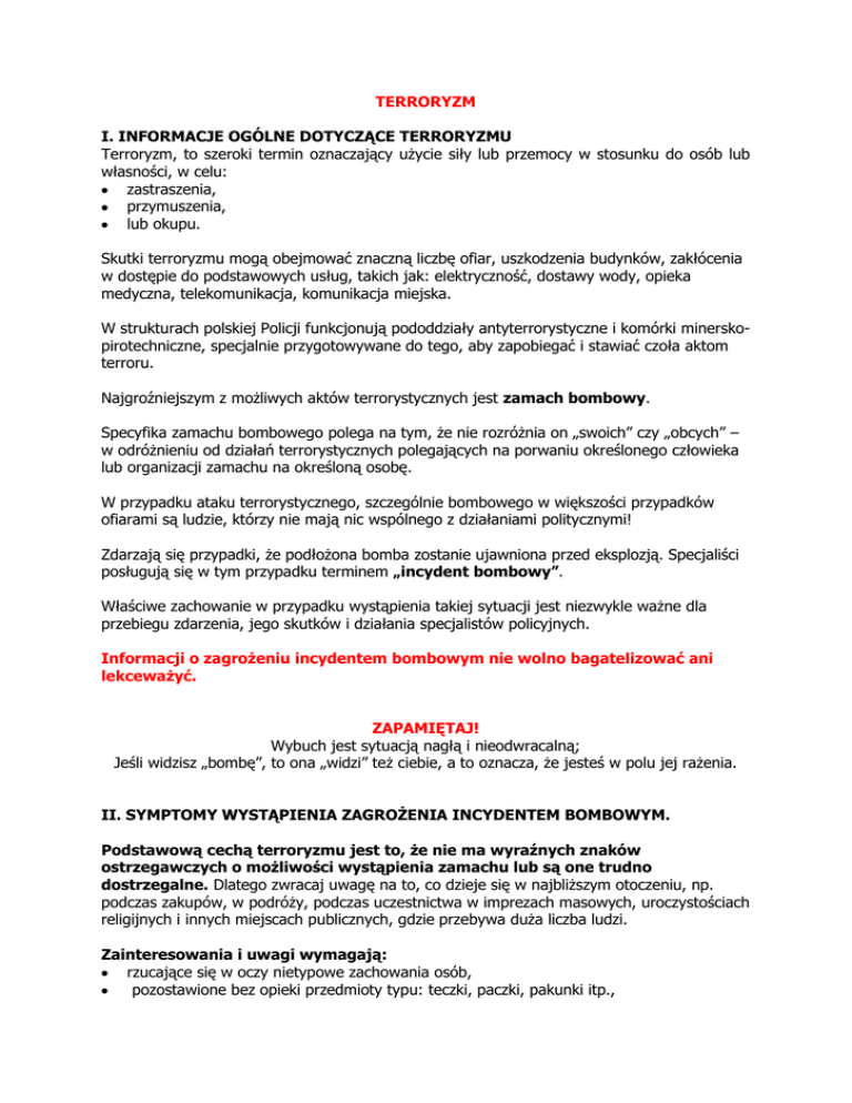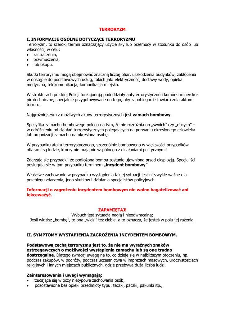 TERRORYZM I. INFORMACJE OGÓLNE DOTYCZĄCE TERRORYZMU Terroryzm, to szeroki termin oznaczający użycie siły lub przemocy w stosunku do osób lub własności, w celu: zastraszenia, przymuszenia, lub okupu. Skutki terroryzmu mogą obejmować znaczną liczbę ofiar, uszkodzenia budynków, zakłócenia w dostępie do podstawowych usług, takich jak: elektryczność, dostawy wody, opieka medyczna, telekomunikacja, komunikacja miejska. W strukturach polskiej Policji funkcjonują pododdziały antyterrorystyczne i komórki minerskopirotechniczne, specjalnie przygotowywane do tego, aby zapobiegać i stawiać czoła aktom terroru. Najgroźniejszym z możliwych aktów terrorystycznych jest zamach bombowy. Specyfika zamachu bombowego polega na tym, że nie rozróżnia on „swoich” czy „obcych” – w odróżnieniu od działań terrorystycznych polegających na porwaniu określonego człowieka lub organizacji zamachu na określoną osobę. W przypadku ataku terrorystycznego, szczególnie bombowego w większości przypadków ofiarami są ludzie, którzy nie mają nic wspólnego z działaniami politycznymi! Zdarzają się przypadki, że podłożona bomba zostanie ujawniona przed eksplozją. Specjaliści posługują się w tym przypadku terminem „incydent bombowy”. Właściwe zachowanie w przypadku wystąpienia takiej sytuacji jest niezwykle ważne dla przebiegu zdarzenia, jego skutków i działania specjalistów policyjnych. Informacji o zagrożeniu incydentem bombowym nie wolno bagatelizować ani lekceważyć. ZAPAMIĘTAJ! Wybuch jest sytuacją nagłą i nieodwracalną; Jeśli widzisz „bombę”, to ona „widzi” też ciebie, a to oznacza, że jesteś w polu jej rażenia. II. SYMPTOMY WYSTĄPIENIA ZAGROŻENIA INCYDENTEM BOMBOWYM. Podstawową cechą terroryzmu jest to, że nie ma wyraźnych znaków ostrzegawczych o możliwości wystąpienia zamachu lub są one trudno dostrzegalne. Dlatego zwracaj uwagę na to, co dzieje się w najbliższym otoczeniu, np. podczas zakupów, w podróży, podczas uczestnictwa w imprezach masowych, uroczystościach religijnych i innych miejscach publicznych, gdzie przebywa duża liczba ludzi. Zainteresowania i uwagi wymagają: rzucające się w oczy nietypowe zachowania osób, pozostawione bez opieki przedmioty typu: teczki, paczki, pakunki itp., osoby ubrane nietypowo do występującej pory roku, samochody, a w szczególności furgonetki pozostawione w nietypowych miejscach tj. w pobliżu kościołów, synagog, meczetów lub miejsc organizowania imprez masowych, zawodów sportowych i zgromadzeń. Należy jednak pamiętać, że terrorysta nie zawsze musi wyróżniać się z tłumu szczególnym wyglądem. O swoich spostrzeżeniach poinformuj: służby odpowiedzialne za bezpieczeństwo obiektu, Straż Miejską lub Policję (telefony alarmowe – patrz punkt IV). III. JAK POSTĘPOWAĆ W SYTUACJACH ZAGROŻENIA INCYDENTEM BOMBOWYM Oto kilka rad, przygotowanych przez ekspertów z Biura Operacji Antyterrorystycznych Komendy Głównej Policji. Możesz przygotować się na wypadek powstania tego typu zagrożenia w miejscach użyteczności publicznej: Pomyśl, którędy w pośpiechu można się ewakuować z budynku, metra, sklepu lub innych zatłoczonych miejsc. Zapamiętaj, gdzie znajdują się klatki schodowe i wyjścia ewakuacyjne, a przede wszystkim tzw. drogi ewakuacyjne. Zwróć uwagę na ciężkie lub łatwo tłukące się przedmioty, które mogą być przesunięte, zrzucone lub zniszczone podczas wybuchu. Zapamiętaj elementy z najbliższego otoczenia. Pamiętaj o tym, aby nie przyjmować od obcych osób żadnych pakunków, nie pozostawiać własnego bagażu bez opieki. Jeżeli jesteś osobą, która dowiedziała się o podłożeniu ładunku wybuchowego lub ujawniła przedmiot niewiadomego pochodzenia, co do którego istnieje podejrzenie, że może on stanowić zagrożenie dla osób i mienia, powinieneś natychmiast ten fakt zgłosić: służbom odpowiedzialnym za bezpieczeństwo na tym terenie - w najbliższej jednostce Policji lub Straży Miejskiej, władzom administracyjnym. Informacji takiej nie należy rozpowszechniać, gdyż jej przekazanie osobom trzecim, może doprowadzić do paniki i w konsekwencji utrudnić przeprowadzenie sprawnej ewakuacji osób z zagrożonego miejsca. Zawiadamiając Policję staraj się podać następujące informacje: rodzaj zagrożenia i źródło informacji o zagrożeniu (informacja telefoniczna, ujawniony podejrzany przedmiot), treść rozmowy z osobą przekazującą informację o podłożeniu ładunku wybuchowego, numer telefonu, na który przekazano informację o zagrożeniu oraz dokładny czas jej przyjęcia, opis miejsca i wygląd ujawnionego przedmiotu. Ogłoszenie alarmu bombowego zagrożenia ,,bombowego” oraz procedury postępowania w czasie 1. Do czasu przybycia Policji należy w miarę istniejących możliwości zabezpieczyć zagrożone miejsce, zachowując elementarne środki bezpieczeństwa, bez narażania siebie i innych osób na niebezpieczeństwo. 2. Po przybyciu Policji na miejsce incydentu bombowego, przejmuje ona dalsze kierowanie akcją. 3. Należy bezwzględnie wykonywać polecenia policjantów. 4. Przy braku informacji o konkretnym miejscu podłożenia „bomby” użytkownicy pomieszczeń powinni sprawdzić swoje miejsce pracy i jego bezpośrednie otoczenie celem odnalezienia przedmiotów nieznanego pochodzenia. 5. Podejrzanych przedmiotów NIE WOLNO DOTYKAĆ! O ich lokalizacji należy powiadomić administratora obiektu. 6. Pomieszczenia ogólnodostępne (korytarze, klatki schodowe, windy, toalety, piwnice, strychy) oraz najbliższe otoczenie zewnętrzne obiektu sprawdzają i przeszukują osoby wyznaczone lub służby odpowiedzialne za bezpieczeństwo w danej instytucji. 7. Po ogłoszeniu ewakuacji należy zachować spokój i opanowanie, pozwoli to sprawnie i bezpiecznie opuścić zagrożony rejon. 8. Po ogłoszeniu ewakuacji w miejscu twojej pracy należy je opuścić, zabierając rzeczy osobiste (toreb