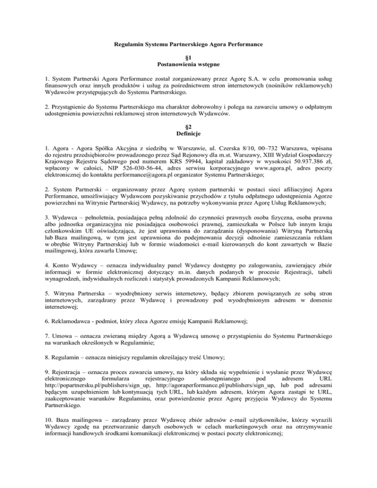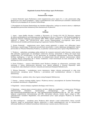 Regulamin Systemu Partnerskiego Agora Performance §1