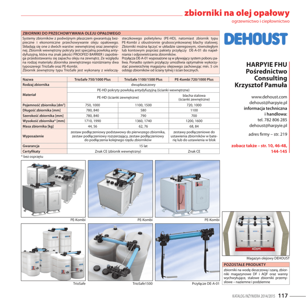 zbiorniki na olej opałowy ogrzewnictwo i ciepłownictwo ZBIORNIKI DO PRZECHOWYWANIA OLEJU OPAŁOWEGO Systemy zbiorników z podwójnym płaszczem gwarantują bezpieczne i ekonomiczne przechowywanie oleju opałowego. Składają się one z dwóch warstw: wewnętrznej oraz zewnętrznej. Zbiornik wewnętrzny pokryty jest specjalną powłoką antydyfuzyjną, która ma znak jakości PROOFED BARRIER i zapobiega przedostawaniu się zapachu oleju na zewnątrz. Ze względu na rodzaj materiału zbiornika zewnętrznego rozróżniamy dwa typoszeregi: TrioSafe oraz PE-Kombi. Zbiornik zewnętrzny typu TrioSafe jest wykonany z wielocząNazwa Rodzaj zbiornika Materiał Pojemność zbiornika [dm3] Długość zbiornika [mm] Szerokość zbiornika [mm] Wysokość zbiornika* [mm] Masa zbiornika [kg] Wyposażenie steczkowego polietylenu (PE-HD), natomiast zbiornik typu PE-Kombi z obustronnie gruboocynkowanej blachy stalowej. Zbiorniki można łączyć w układzie szeregowym, równoległym lub kontowym poprzez pakiety przyłączy DE-A-01 do napełniania i odpowietrzania zbiorników. Przyłącza DE-A-01 wyposażone są w pływający system poboru paliwa. Ponadto system przyłączy umożliwia optymalnie wykorzystać powierzchnię magazynu olejowego zachowując min. 5 cm odstęp zbiorników od ściany tylnej i ścian bocznych. TrioSafe 750/1000 Plus TrioSafe 1100/1500 Plus PE-Kombi 720/1000 Plus dwupłaszczowy PE-HD pokryty powłoką antydyfuzyjną (ścianki wewnętrzne) blacha stalowa PE-HD (ścianki zewnętrzne) (ścianki zewnętrzne) 750, 1000 1100, 1500 720, 1000 780, 840 580 1100 780, 840 790 700 1710, 1990 1360, 1740 1200, 1600 44, 56 62, 76 68, 84 zestaw podłączeniowy podstawowy do pierwszego zbiornika, zestaw podłączeniowy rozszerzający, zestaw podłączeniowy do podłączenia kolejnego rzędu zbiorników Gwarancja Certyfikaty * bez osprzętu 15 lat Znak CE (zbionik wewnętrzny) PE-Kombi PE-Kombi zestawy podłączeniowe do ustawienia zbiorników w baterię lub do ustawienia w blok HARPYIE FHU Pośrednictwo Consulting Krzysztof Pamuła www.dehoust.com [email protected] informacja techniczna i handlowa: tel. 782 806 285 [email protected] adres firmy – str. 219 zobacz także – str. 10, 46-48, 144-145 Znak CE PE-Kombi Magazyn olejowy DEHOUST Pozostałe Produkty TrioSafe TrioSafe1500 Przyłącze DE-A-01 zbiorniki na wodę deszczową i szarą, zbiorniki magazynowe DF i AQF oraz wanny wychwytujące, stalowe zbiorniki przemysłowe – naziemne i podziemne Katalog Inżyniera 2014/2015 117