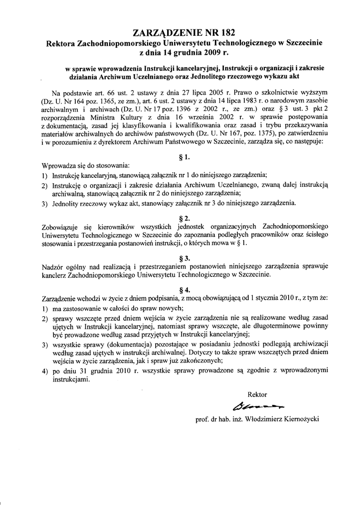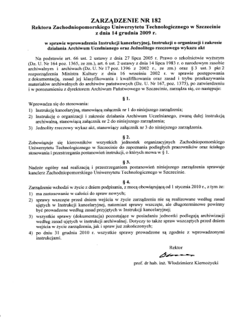 Zarządzenie nr 182 Rektora ZUT z dnia 14 grudnia 2009 r., w