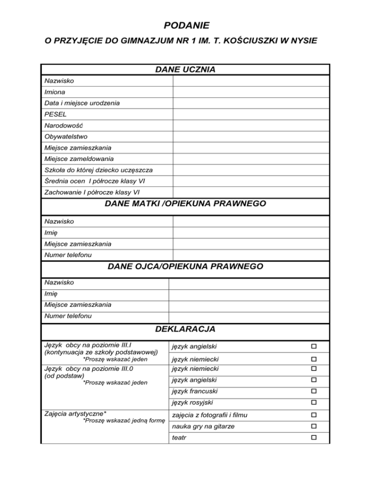 PODANIE O PRZYJĘCIE DO GIMNAZJUM NR 1 IM. T. KOŚCIUSZKI W NYSIE DANE UCZNIA Nazwisko Imiona Data i miejsce urodzenia PESEL Narodowość Obywatelstwo Miejsce zamieszkania Miejsce zameldowania Szkoła do której dziecko uczęszcza Średnia ocen I półrocze klasy VI Zachowanie I półrocze klasy VI DANE MATKI /OPIEKUNA PRAWNEGO Nazwisko Imię Miejsce zamieszkania Numer telefonu DANE OJCA/OPIEKUNA PRAWNEGO Nazwisko Imię Miejsce zamieszkania Numer telefonu DEKLARACJA Język obcy na poziomie III.I (kontynuacja ze szkoły podstawowej) *Proszę wskazać jeden Język obcy na poziomie III.0 (od podstaw) *Proszę wskazać jeden język angielski język niemiecki język niemiecki język angielski język francuski język rosyjski Zajęcia artystyczne* *Proszę wskazać jedną formę zajęcia z fotografii i filmu nauka gry na gitarze teatr Preferowana klasa* *Proszę wskazać jedną Oferta zajęć pozalekcyjnych (dla chętnych) * Proszę wpisać przedmiot Nauka religii/etyki Wychowanie do życia w rodzinie Świetlica Zgoda na wykorzystanie wizerunku dziecka matematyczna językowa artystyczna z elementami architektury integracyjna sportowa** ogólna robotyka zespół wokalno – instrumentalny teatr szkolny taniec architektura(planowanie przestrzenne) koła przedmiotowe *………………………………... zdw *…………………………………………………. sks …………………………………………………… (dyscyplina sportowa) TAK NIE TAK NIE TAK NIE TAK NIE (w publikacjach papierowych, elektronicznych w tym internetowych związanych z życiem szkoły) ** Przy wyborze klasy sportowej proszę o dołączenie do podania zaświadczenia lekarskiego o braku przeciwwskazań zdrowotnych do klasy sportowej. INFORMACJA Na podstawie art. 24 ust. 1 ustawy o ochronie danych osobowych z dnia 29 sierpnia 1997 r. (tekst jednolity: Dz.U. 2002 r. NR 101 poz. 926) przyjmuje do wiadomości, że • • • • • Administratorem danych jest dyrektor Gimnazjum nr 1 z siedzibą przy ulicy Chodowieckiego 7, 48 – 300 Nysa, Dane kontaktowe będą przetwarzane wyłącznie w celu szybkiego kontaktu z rodzicem lub prawnym opiekunem dziecka w nagłych okolicznościach; dane dotyczące wizerunku dziecka będą wykorzystywane wyłącznie w publikacjach papierowych i elektronicznych, w tym internetowych związanych z życiem szkoły, Dane nie będą udostępniane podmiotom innym niż upoważnione na podstawie przepisów prawa, Przysługuje mi prawo dostępu do treści danych oraz ich poprawiania, Dane podaję dobrowolnie, jednocześnie wyrażając zgodę na ich przetwarzanie zgodnie z celem podanym powyżej. ……………………………………………………… data i podpis rodzica lub prawnego opiekuna