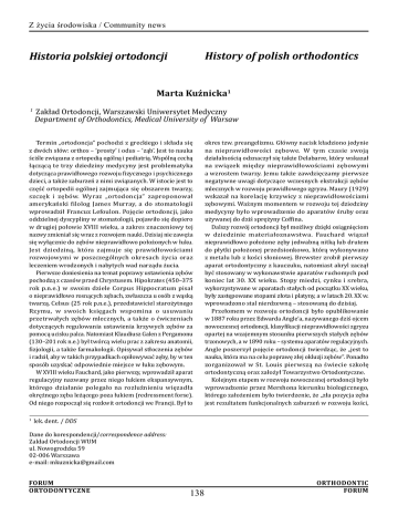 Z życia środowiska / Community news History of polish orthodontics Historia polskiej ortodoncji Marta Kuźnicka1 1 Zakład Ortodoncji, Warszawski Uniwersytet Medyczny Department of Orthodontics, Medical University of Warsaw Termin „ortodoncja” pochodzi z greckiego i składa się z dwóch słów: orthos – ‘prosty’ i odus – ‘ząb’. Jest to nauka ściśle związana z ortopedią ogólną i pediatrią. Wspólną cechą łączącą te trzy dziedziny medycyny jest problematyka dotycząca prawidłowego rozwoju fizycznego i psychicznego dzieci, a także zaburzeń z nimi związanych. W istocie jest to część ortopedii ogólnej zajmująca się obszarem twarzy, szczęk i zębów. Wyraz „ortodoncja” zaproponował amerykański filolog James Murray, a do stomatologii wprowadził Francuz Lefoulon. Pojęcie ortodoncji, jako oddzielnej dyscypliny w stomatologii, pojawiło się dopiero w drugiej połowie XVIII wieku, a zakres znaczeniowy tej nazwy zmieniał się wraz z rozwojem nauki. Dzisiaj nie zawęża się wyłącznie do zębów nieprawidłowo położonych w łuku. Jest dziedziną, która zajmuje się prawidłowościami rozwojowymi w poszczególnych okresach życia oraz leczeniem wrodzonych i nabytych wad narządu żucia. Pierwsze doniesienia na temat poprawy ustawienia zębów pochodzą z czasów przed Chrystusem. Hipokrates (450–375 rok p.n.e.) w swoim dziele Corpus Hippocratum pisał o nieprawidłowo rosnących zębach, zwłaszcza u osób z wąską twarzą. Celsus (25 rok p.n.e.), przedstawiciel starożytnego Rzymu, w swoich księgach wspomina o usuwaniu przetrwałych zębów mlecznych, a także o ćwiczeniach dotyczących regulowania ustawienia krzywych zębów za pomocą ucisku palca. Natomiast Klaudiusz Galen z Pergamonu (130–201 rok n.e.) był twórcą wielu prac z zakresu anatomii, fizjologii, a także farmakologii. Opisywał stłoczenia zębów i radził, aby w takich przypadkach opiłowywać zęby, by w ten sposób uzyskać odpowiednie miejsce w łuku zębowym. W XVIII wieku Fauchard, jako pierwszy, wprowadził aparat regulacyjny nazwany przez niego łukiem ekspansywnym, którego działanie polegało na rozluźnieniu więzadła okrężnego zęba leżącego poza łukiem (redressment forse). Od niego rozpoczął się rozkwit ortodoncji we Francji. Był to 1 lek. dent. / DDS Dane do korespondencji/correspondence address: Zakład Ortodoncji WUM ul. Nowogrodzka 59 02-006 Warszawa e-mail: [email protected] okres tzw. preangelizmu. Główny nacisk kładziono jedynie na nieprawidłowości zębowe. W tym czasie swoją działalnością odznaczył się także Delabarre, który wskazał na związek między nieprawidłowościami zębowymi a wzrostem twarzy. Jemu także zawdzięczamy pierwsze negatywne uwagi dotyczące wczesnych ekstrakcji zębów mlecznych w rozwoju prawidłowego zgryzu. Maury (1929) wskazał na korelację krzywicy z nieprawidłowościami zębowymi. Ważnym momentem w rozwoju tej dziedziny medycyny było wprowadzenie do aparatów śruby oraz używanej do dziś sprężyny Coffina. Dalszy rozwój ortodoncji był możliwy dzięki osiągnięciom w dziedzinie materiałoznawstwa. Fauchard wiązał nieprawidłowo położone zęby jedwabną nitką lub drutem do płytki położonej przedsionkowo, którą wykonywano z metalu lub z kości słoniowej. Brewster zrobił pierwszy aparat ortodontyczny z kauczuku, natomiast akryl zaczął być stosowany w wykonawstwie aparatów ruchomych pod koniec lat 30. XX wieku. Stopy miedzi, cynku i srebra, wykorzystywane w aparatach stałych od początku XX wieku, były zastępowane stopami złota i platyny, a w latach 20. XX w. wprowadzono stal nierdzewną – stosowaną do dzisiaj. Przełomem w rozwoju ortodoncji było opublikowanie w 1887 roku przez Edwarda Angle’a, nazywanego dziś ojcem nowoczesnej ortodoncji, klasyfikacji nieprawidłowości zgryzu opartej na wzajemnym stosunku pierwszych stałych zębów trzonowych, a w 1890 roku – systemu aparatów regulacyjnych. Angle poszerzył pojęcie ortodoncji twierdząc, że „jest to nauka, która ma na celu poprawę złej okluzji zębów”. Ponadto zorganizował w St. Louis pierwszą na świecie szkołę ortodontyczną oraz założył Towarzystwo Ortodontyczne. Kolejnym etapem w rozwoju nowoczesnej ortodoncji było wprowadzenie przez Mershona kierunku biologicznego, którego założeniem było twierdzenie, że „zła pozycja zęba jest rezultatem funkcjonalnych zaburzeń w rozwoju kości, ForumOrthodontic Ortodontyczneforum 138 Z życia środowiska / Community news wszystkich mających w tym udział tkanek, plus dziedziczności. Mechanizm wzrostu stanowi siłę napędową, która powoduje, że ząb zmienia swoją pozycję, natomiast aparat jest tylko środkiem pomocniczym wywołującym bodźce wzrostowe”. Natomiast Andresen w 1927 roku skonstruował aktywator, kładąc podwaliny ortodoncji czynnościowej. Polskie wzmianki na temat ortodoncji po raz pierwszy pojawiają się w wydanej w 1860 roku w Wilnie broszurce Maurycego Jackowskiego pt. "O odkryciach i postępie w dziedzinie dentystyki", a także w pracy "Rys ortodoncji nowoczesnej podług systemu Angle’a" Wincentego Zawidzkiego (konstruktora pierwszego symetroskopu), którą opublikowano w Kronice Dentystycznej. Profesor Uniwersytetu Wileńskiego Jakub Szymkiewicz w swojej rozprawie chirurgicznej (Nauka chirurgii teoretycznej i praktycznej, Wilno 1806 r.) napisał o wadach zgryzu. Rozdział pt. "Wady w porządkowaniu zębów" jest uznawany za początek polskiej ortodoncji. W klinicznej ortodoncji nie można pominąć postaci Prof. Antoniego Cieszyńskiego, dziekana Wydziału Lekarskiego Uniwersytetu Jana Kazimierza we Lwowie. Jego autorstwa jest pierwszy atlas diagnostyczny zdjęć rentgenowskich uzębienia. Światową sławę zapewniło mu wprowadzenie do rentgenodiagnostyki prawa izometrii. Był także autorem licznych publikacji dotyczących statyki kośćca czaszki i dynamiki narządu żucia. Wynalazł wiele przyrządów