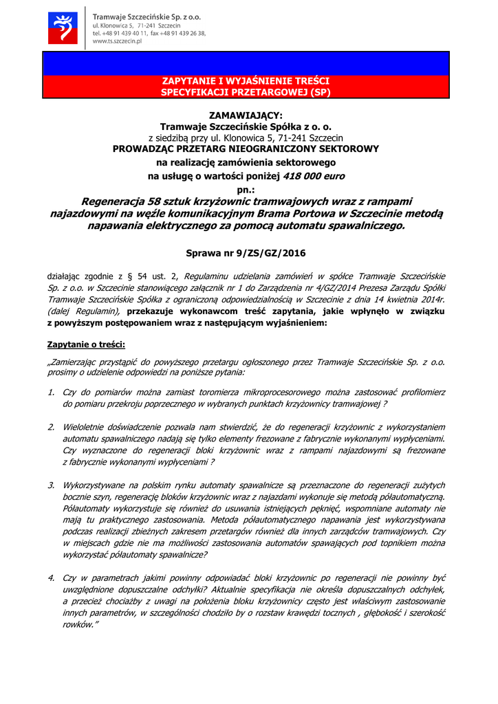 ZAPYTANIE I WYJAŚNIENIE TREŚCI SPECYFIKACJI PRZETARGOWEJ (SP) ZAMAWIAJĄCY: Tramwaje Szczecińskie Spółka z o. o. z siedzibą przy ul. Klonowica 5, 71-241 Szczecin PROWADZĄC PRZETARG NIEOGRANICZONY SEKTOROWY na realizację zamówienia sektorowego na usługę o wartości poniżej 418 000 euro pn.: Regeneracja 58 sztuk krzyżownic tramwajowych wraz z rampami najazdowymi na węźle komunikacyjnym Brama Portowa w Szczecinie metodą napawania elektrycznego za pomocą automatu spawalniczego. Sprawa nr 9/ZS/GZ/2016 działając zgodnie z § 54 ust. 2, Regulaminu udzielania zamówień w spółce Tramwaje Szczecińskie Sp. z o.o. w Szczecinie stanowiącego załącznik nr 1 do Zarządzenia nr 4/GZ/2014 Prezesa Zarządu Spółki Tramwaje Szczecińskie Spółka z ograniczoną odpowiedzialnością w Szczecinie z dnia 14 kwietnia 2014r. (dalej Regulamin), przekazuje wykonawcom treść zapytania, jakie wpłynęło w związku z powyższym postępowaniem wraz z następującym wyjaśnieniem: Zapytanie o treści: „Zamierzając przystąpić do powyższego przetargu ogłoszonego przez Tramwaje Szczecińskie Sp. z o.o. prosimy o udzielenie odpowiedzi na poniższe pytania: 1. Czy do pomiarów można zamiast toromierza mikroprocesorowego można zastosować profilomierz do pomiaru przekroju poprzecznego w wybranych punktach krzyżownicy tramwajowej ? 2. Wieloletnie doświadczenie pozwala nam stwierdzić, że do regeneracji krzyżownic z wykorzystaniem automatu spawalniczego nadają się tylko elementy frezowane z fabrycznie wykonanymi wypłyceniami. Czy wyznaczone do regeneracji bloki krzyżownic wraz z rampami najazdowymi są frezowane z fabrycznie wykonanymi wypłyceniami ? 3. Wykorzystywane na polskim rynku automaty spawalnicze są przeznaczone do regeneracji zużytych bocznie szyn, regenerację bloków krzyżownic wraz z najazdami wykonuje się metodą półautomatyczną. Półautomaty wykorzystuje się również do usuwania istniejących pęknięć, wspomniane automaty nie mają tu praktycznego zastosowania. Metoda półautomatycznego napawania jest wykorzystywana podczas realizacji zbieżnych zakresem przetargów również dla innych zarządców tramwajowych. Czy w miejscach gdzie nie ma możliwości zastosowania automatów spawających pod topnikiem można wykorzystać półautomaty spawalnicze? 4. Czy w parametrach jakimi powinny odpowiadać bloki krzyżownic po regeneracji nie powinny być uwzględnione dopuszczalne odchyłki? Aktualnie specyfikacja nie określa dopuszczalnych odchyłek, a przecież chociażby z uwagi na położenia bloku krzyżownicy często jest właściwym zastosowanie innych parametrów, w szczególności chodziło by o rozstaw krawędzi tocznych , głębokość i szerokość rowków.” Odpowiedź zamawiającego na zapytanie: Ad 1. Zamawiający nie wyraża zgody na wykonanie pomiaru innym urządzeniem pomiarowym niż wskazany przez zamawiającego we wzorze umowy (zał. nr 8 do SP). Ad 2. Rowki wyznaczonych do regeneracji krzyżownic są wypłycone poprzez frezowanie. Ad 3. W miejscach newralgicznych, gdzie nie będzie fizycznej możliwości zastosowania automatów spawalniczych, dopuszcza się zastosowanie półautomatów każdorazowo za zgodą zamawiającego. Wszystkie krzyżownice w węzłach rozjazdowych, wykonane z szyn pełnogłówkowych o profilu 105CI (D180/105), profilu szynowego (krzyżownicowego) 310 CI (BL 180/260), norma PN-EN 14811+A1:2010, wykonanych ze stali: R200, R220, R260, R290 GHT (HSM-M), ST 90 PA, można spawać półautomatami spawalniczymi drutem rdzeniowym o właściwościach lepszych od materiału rodzimego. Ad 4. Zamawiający dopuszcza odchyłki zgodnie z obowiązującymi przepisami. W przypadku pierwotnego wymiaru rozstawu krawędzi tocznych innego niż 1435 (np. poszerzenie na łukach) prace należy prowadzić z uwzględnieniem pierwotnej wartości. PREZES ZARZĄDU Krystian Wawrzyniak