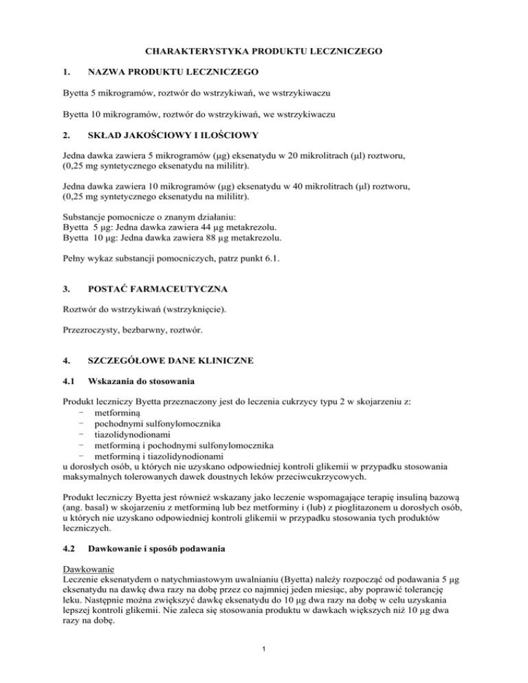 CHARAKTERYSTYKA PRODUKTU LECZNICZEGO 1. NAZWA PRODUKTU LECZNICZEGO Byetta 5 mikrogramów, roztwór do wstrzykiwań, we wstrzykiwaczu Byetta 10 mikrogramów, roztwór do wstrzykiwań, we wstrzykiwaczu 2. SKŁAD JAKOŚCIOWY I ILOŚCIOWY Jedna dawka zawiera 5 mikrogramów (μg) eksenatydu w 20 mikrolitrach (μl) roztworu, (0,25 mg syntetycznego eksenatydu na mililitr). Jedna dawka zawiera 10 mikrogramów (μg) eksenatydu w 40 mikrolitrach (μl) roztworu, (0,25 mg syntetycznego eksenatydu na mililitr). Substancje pomocnicze o znanym działaniu: Byetta 5 μg: Jedna dawka zawiera 44 µg metakrezolu. Byetta 10 μg: Jedna dawka zawiera 88 µg metakrezolu. Pełny wykaz substancji pomocniczych, patrz punkt 6.1. 3. POSTAĆ FARMACEUTYCZNA Roztwór do wstrzykiwań (wstrzyknięcie). Przezroczysty, bezbarwny, roztwór. 4. SZCZEGÓŁOWE DANE KLINICZNE 4.1 Wskazania do stosowania Produkt leczniczy Byetta przeznaczony jest do leczenia cukrzycy typu 2 w skojarzeniu z: - metforminą - pochodnymi sulfonylomocznika - tiazolidynodionami - metforminą i pochodnymi sulfonylomocznika - metforminą i tiazolidynodionami u dorosłych osób, u których nie uzyskano odpowiedniej kontroli glikemii w przypadku stosowania maksymalnych tolerowanych dawek doustnych leków przeciwcukrzycowych. Produkt leczniczy Byetta jest również wskazany jako leczenie wspomagające terapię insuliną bazową (ang. basal) w skojarzeniu z metforminą lub bez metforminy i (lub) z pioglitazonem u dorosłych osób, u których nie uzyskano odpowiedniej kontroli glikemii w przypadku stosowania tych produktów leczniczych. 4.2 Dawkowanie i sposób podawania Dawkowanie Leczenie eksenatydem o natychmiastowym uwalnianiu (Byetta) należy rozpocząć od podawania 5 μg eksenatydu na dawkę dwa razy na dobę przez co najmniej jeden miesiąc, aby poprawić tolerancję leku. Następnie można zwiększyć dawkę eksenatydu do 10 μg dwa razy na dobę w celu uzyskania lepszej kontroli glikemii. Nie zaleca się stosowania produktu w dawkach większych niż 10 µg dwa razy na dobę. 1 Eksenatyd o natychmiastowym uwalnianiu dostępny jest w postaci wstrzykiwaczy zawierających 5 µg na dawkę lub 10 µg na dawkę. Eksenatyd o natychmiastowym uwalnianiu można stosować w ciągu 60 minut przed posiłkiem porannym i wieczornym (lub dwoma głównymi posiłkami w ciągu dnia, z zachowaniem co najmniej 6-godzinnej przerwy między nimi). Eksenatydu o natychmiastowym uwalnianiu nie należy stosować po posiłku. W przypadku pominięcia wstrzyknięcia, leczenie należy kontynuować podając kolejną dawkę w wyznaczonym czasie. Zaleca się stosowanie eksenatydu o natychmiastowym uwalnianiu u pacjentów z cukrzycą typu 2 przyjmujących metforminę, pochodną sulfonylomocznika, pioglitazon i (lub) insulinę bazową. Można kontynuować podawanie eksenatydu o natychmiastowym uwalnianiu, jeżeli do aktualnie stosowanego leczenia dodano insulinę bazową. W przypadku dodania eksenatydu o natychmiastowym uwalnianiu do aktualnie stosowanego leczenia metforminą i (lub) pioglitazonem, można kontynuować podawanie metforminy i (lub) pioglitazonu w dotychczasowych dawkach, ponieważ ryzyko wystąpienia hipoglikemii nie jest większe niż w przypadku stosowania samej metforminy lub pioglitazonu. W przypadku dodania eksenatydu o natychmiastowym uwalnianiu do aktualnie stosowanego leczenia pochodną sulfonylomocznika, należy rozważyć zmniejszenie dawki pochodnej sulfonylomocznika, aby zmniejszyć ryzyko wystąpienia hipoglikemii (patrz punkt 4.4). W przypadku jednoczesnego stosowania eksenatydu o natychmiastowym uwalnianiu i insuliny bazowej, należy przeanalizować stosowaną dawkę insuliny bazowej. U pacjentów ze zwiększonym ryzykiem hipoglikemii, należy rozważyć zmniejszenie dawki insuliny bazowej (patrz punkt 4.8). Nie jest konieczne codzienne dostosowanie dawki eksenatydu o natychmiastowym uwalnianiu w zależności od pomiaru glikemii. Jednakże, kontrolowanie poziomu glukozy we krwi może być konieczne w celu dostosowania dawki pochodnej sulfonylomocznika lub insuliny bazowej. Populacje szczególne Osoby w podeszłym wieku Należy zachować ostrożność podczas stosowania oraz zwiększania dawki eksenatydu o natychmiastowym uwalnianiu z 5 µg do 10 µg u pacjentów w wieku powyżej 70 lat. Doświadczenie kliniczne u pacjentów w wieku powyżej 75 lat jest ograniczone. Osoby z zaburzeniami czynności nerek Nie jest konieczne dostosowywanie dawki u pacjentów z łagodnymi zaburzeniami czynności nerek (klirens kreatyniny: 50 – 80 ml/min). Należy zachować ostrożność podczas zwiększania dawki z 5 µg do 10 µg u pacjentów z umiarkowanymi zaburzeniami czynności nerek (klirens kreatyniny 30-50 ml/min), (patrz punkt 5.2). Nie zaleca się stosowania eksenatydu u pacjentów ze schyłkową chorobą nerek lub ciężkimi zaburzeniami czynności nerek (klirens kreatyniny <30 ml/min), (patrz punkt 4.4). Osoby z zaburzeniami czynności wątroby Nie jest konieczne dostosowywanie dawki u pacjentów z zaburzeniami czynności wątroby (patrz punkt 5.2). Dzieci i młodzież Nie określono bezpieczeństwa stosowania i skuteczności eksenatydu u dzieci i młodzieży w wieku poniżej 18 lat (patrz punkt 5.2). Aktualne dane przedstawiono w punkcie 5.2, ale brak zaleceń dotyczących dawkowania. Sposób podawania Każdą dawkę należy podawać we wstrzyknięciu podskórnym w udo, brzuch lub górną część ramienia. Eksenatyd o natychmiastowym uwalnianiu i insulinę bazową należy podawać w dwóch oddzielnych iniekcjach. 2 Instrukcje dotyczące użytkowania wstrzykiwacza, patrz punkt 6.6 oraz instrukcja użytkowania zawarta w ulotce. 4.3 Przeciwwskazania Nadwrażliwość na substancję czynną lub na którąkolwiek substancję pomocniczą wymienioną w punkcie 6.1. 4.4 Specjalne ostrzeżenia i środki ostrożności dotyczące stosowania Nie należy stosować eksenatydu u pacjentów z cukrzycą typu 1. ani w leczeniu kwasicy ketonowej w przebiegu cukrzycy. Nie wolno poda