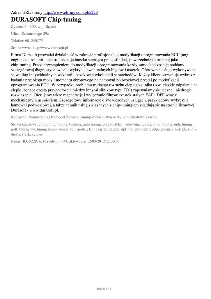 Adres URL strony http://www.efirmy.com.pl/5229 DURASOFT Chip-tuning Żywiec, 34-300, woj. śląskie Ulica: Żeromskiego 29a Telefon: 601240375 Strona www: http://www.durasoft.pl Firma Durasoft prowadzi działalność w zakresie profesjonalnej modyfikacji oprogramowania ECU (ang. engine control unit - elektroniczna jednostka sterująca pracą silnika), powszechnie określanej jako chip-tuning. Przed przystąpieniem do modyfikacji oprogramowania każdy samochód zostaje poddany szczegółowej diagnostyce, w celu wykrycia ewentualnych błędów i usterek. Oferowane usługi wykonywane są według indywidualnych wskazań i oczekiwań właścicieli samochodów. Każdy klient otrzymuje wykres z badania przebiegu mocy i momentu obrotowego na hamowni podwoziowej przed i po modyfikacji oprogramowania ECU. W przypadku problemu trudnego rozruchu ciepłego silnika (tzw. ciężkie odpalanie na ciepło, będące częstą przypadłością między innymi silników typu TDI) zapewniamy skuteczne i niedrogie rozwiązanie. Oferujemy także regenerację i wyłączanie filtrów cząstek stałych FAP i DPF wraz z mechanicznym usunięciem. Szczegółowe informacje o świadczonych usługach, przykładowe wykresy z hamowni podwoziowej, a także cennik usług związanych z chip-tuningiem znajdują się na stronie firmowej Durasoft - www.durasoft.pl. Kategorie: Motoryzacja i transport Żywiec, Tuning Żywiec, Warsztaty samochodowe Żywiec Słowa kluczowe: chiptuning, tuning, tunning, auto tuning, diagnostyka, hamownia, tuning bmw, tuning audi, tuning golf, tuning vw, tuning honda, diesel, tdi, spoiler, filtr cząstek stałych, dpf, fap, problem z odpaleniem, silnik tdi, silnik diesla, śląsk, żywiec Numer ID: 5229, liczba odsłon: 344, aktywacja: 12/03/2012 22:30:57 Strona 1 / 1