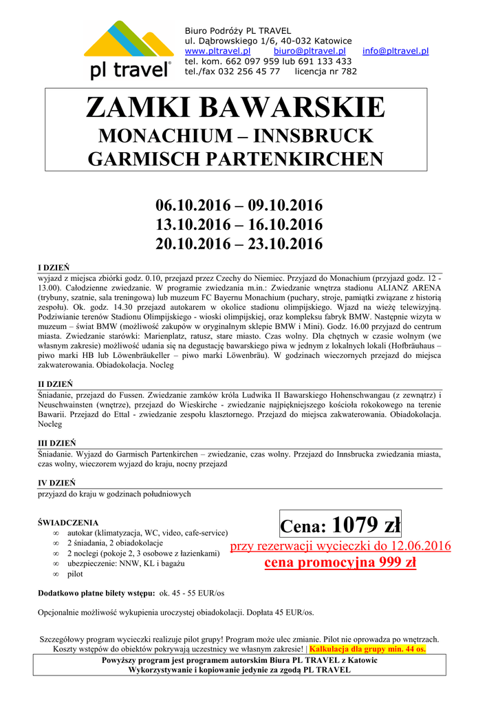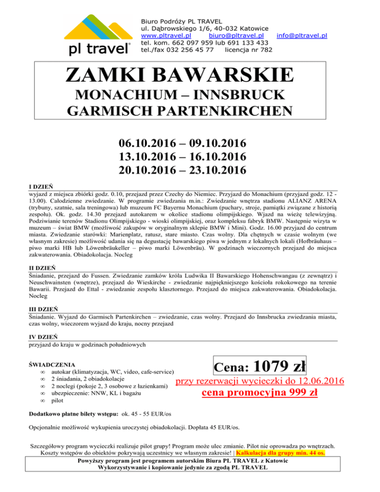 Biuro Podróży PL TRAVEL ul. Dąbrowskiego 1/6, 40-032 Katowice www.pltravel.pl [email protected] [email protected] tel. kom. 662 097 959 lub 691 133 433 tel./fax 032 256 45 77 licencja nr 782 ZAMKI BAWARSKIE MONACHIUM – INNSBRUCK GARMISCH PARTENKIRCHEN 06.10.2016 – 09.10.2016 13.10.2016 – 16.10.2016 20.10.2016 – 23.10.2016 I DZIEŃ wyjazd z miejsca zbiórki godz. 0.10, przejazd przez Czechy do Niemiec. Przyjazd do Monachium (przyjazd godz. 12 13.00). Całodzienne zwiedzanie. W programie zwiedzania m.in.: Zwiedzanie wnętrza stadionu ALIANZ ARENA (trybuny, szatnie, sala treningowa) lub muzeum FC Bayernu Monachium (puchary, stroje, pamiątki związane z historią zespołu). Ok. godz. 14.30 przejazd autokarem w okolice stadionu olimpijskiego. Wjazd na wieżę telewizyjną. Podziwianie terenów Stadionu Olimpijskiego - wioski olimpijskiej, oraz kompleksu fabryk BMW. Następnie wizyta w muzeum – świat BMW (możliwość zakupów w oryginalnym sklepie BMW i Mini). Godz. 16.00 przyjazd do centrum miasta. Zwiedzanie starówki: Marienplatz, ratusz, stare miasto. Czas wolny. Dla chętnych w czasie wolnym (we własnym zakresie) możliwość udania się na degustację bawarskiego piwa w jednym z lokalnych lokali (Hofbräuhaus – piwo marki HB lub Löwenbräukeller – piwo marki Löwenbräu). W godzinach wieczornych przejazd do miejsca zakwaterowania. Obiadokolacja. Nocleg II DZIEŃ Śniadanie, przejazd do Fussen. Zwiedzanie zamków króla Ludwika II Bawarskiego Hohenschwangau (z zewnątrz) i Neuschwainsten (wnętrze), przejazd do Wieskirche - zwiedzanie najpiękniejszego kościoła rokokowego na terenie Bawarii. Przejazd do Ettal - zwiedzanie zespołu klasztornego. Przejazd do miejsca zakwaterowania. Obiadokolacja. Nocleg III DZIEŃ Śniadanie. Wyjazd do Garmisch Partenkirchen – zwiedzanie, czas wolny. Przejazd do Innsbrucka zwiedzania miasta, czas wolny, wieczorem wyjazd do kraju, nocny przejazd IV DZIEŃ przyjazd do kraju w godzinach południowych ŚWIADCZENIA • autokar (klimatyzacja, WC, video, cafe-service) • 2 śniadania, 2 obiadokolacje • 2 noclegi (pokoje 2, 3 osobowe z łazienkami) • ubezpieczenie: NNW, KL i bagażu • pilot Cena: 1079 zł przy rezerwacji wycieczki do 12.06.2016 cena promocyjna 999 zł Dodatkowo płatne bilety wstępu: ok. 45 - 55 EUR/os Opcjonalnie możliwość wykupienia uroczystej obiadokolacji. Dopłata 45 EUR/os. Szczegółowy program wycieczki realizuje pilot grupy! Program może ulec zmianie. Pilot nie oprowadza po wnętrzach. Koszty wstępów do obiektów pokrywają uczestnicy we własnym zakresie! | Kalkulacja dla grupy min. 44 os. Powyższy program jest programem autorskim Biura PL TRAVEL z Katowic Wykorzystywanie i kopiowanie jedynie za zgodą PL TRAVEL