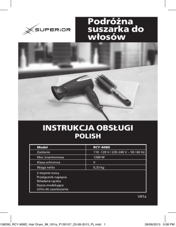 Podróżna suszarka do włosów INSTRUKCJA OBSŁUGI POLISH Model RCY-808D Zasilanie 110 -120 V / 220-240 V ~ 50 / 60 Hz Moc znamionowa 1200 W Klasa ochronna II Waga netto 0,33 kg 2 stopnie mocy Przełącznik napięcia Składana rączka Dysza modelująca Ucho do zawieszania 108290_RCY-808D_Hair Dryer_IM_V01a_P130157_23-08-2013_PL.indd 1 V01a 26/08/2013 5:08 PM SPIS TREŚCI WAŻNE WSKAZÓWKI DOTYCZĄCE BEZPIECZEŃSTWA 02 LISTA CZĘŚCI 05 PIERWSZE WŁĄCZENIE I PRZEŁĄCZNIK NAPIĘCIA 05 OBSŁUGA URZĄDZENIA 05 TRANSPORT06 CZYSZCZENIE I KONSERWACJA 06 UTYLIZACJA 07 SERWIS / GWARANCJA 07 WAŻNE WSKAZÓWKI DOTYCZĄCE BEZPIECZEŃSTWA Podczas użytkowania urządzeń elektrycznych przestrzegać należy podstawowych wskazówek bezpieczeństwa użytkowania. Aby uniknąć niebezpieczeństw poparzeń, porażenia prądem, pożarów i/lub uszkodzenia ciała, przed uruchomieniem urządzenia zapoznać się należy dokładnie z instrukcją obsługi i podczas użytkowania przestrzegać należy wszystkich zawartych w niej wskazówek. Prosimy o staranne przechowywanie tej instrukcji obsługi na wypadek późniejszego użycia. W przypadku przekazania urządzenia osobie trzeciej należy przekazać jej również tą instrukcję. WSKAZÓWKI OGÓLNE • • • • • • • • • • • Urządzenia elektryczne nie są zabawkami! Dzieci trzymać z dala od urządzenia! Urządzenie stosować tylko do przewidzianego dla niego celu. Urządzenie to przeznaczone jest tylko do użytku domowego, nie do zastosowań usługowych. Podczas użytkowania lub jeżeli urządzenie podłączone jest do sieci nie wolno go pozostawiać bez nadzoru. Jeżeli urządzenie nie jest użytkowane, wystąpią zakłócenia lub ma zostać ono wyczyszczone, wyjąć wtyczkę sieciową. Urządzenia nie wolno przenosić za przewód sieciowy. Urządzenie utrzymywać w czystym i wolnym od kurzu stanie. Urządzenia nie wolno użytkować na dworze. Regularnie sprawdzać stan urządzenia pod względem widocznych uszkodzeń. Urządzenia nie wolno w żadnym wypadku używać, jeśli stwierdzone zostały uszkodzenia, jeżeli urządzenie spadło lub nie funkcjonuje bez zarzutu. Nie wolno nigdy dokonywać prób naprawy urządzenia samemu. Naprawy przeprowadzane mogą być tylko przez wykwalifikowany serwis. Gniazdo wtyczkowe musi znajdować się w pobliżu urządzenia, aby w razie sytuacji awaryjnej można było bez problemu wyjąć wtyczkę. 2 108290_RCY-808D_Hair Dryer_IM_V01a_P130157_23-08-2013_PL.indd 2 26/08/2013 5:08 PM ZAGROŻENIA ZE STRONY PRĄDU • • • • • • • • • • • Podane na tabliczce znamionowej urządzenia napięcie musi być zgodne z napięciem w sieci elektrycznej. Urządzenie podłączać tylko do przepisowo zainstalowanego gniazda wtyczkowego. Nie stosować stołowych listew z gniazdami lub przedłużaczy. Urządzenia nie wolno nigdy zasilać przez wyłączniki czasowe lub inne urządzenia zdalnego sterowania. Urządzenia, przewodu zasilającego i wtyczki nie wolno nigdy dotykać wilgotnymi lub mokrymi rękami lub jeśli stoją Państwo na wilgotnym podłożu. Przewodu sieciowego nie wolno nigdy prowadzić przez umywalki. Urządzenia nie wolno nigdy zanurzać w wodzie. Zanurzenie w wodzie lub innych płynach spowodować może zagrożenie dla życia przez porażenie prądem! Urządzenie, przewód zasilający i wtyczkę trzymać z dala od gorących powierzchni, otwartego ognia, bezpośredniego promieniowania słonecznego oraz ostrych krawędzi. Podczas użytkowania należy uważać, aby przewód nie został przyciśnięty (np. w drzwiach). Przy wyjmowaniu wtyczki ciągnąć zawsze za wtyczkę, nigdy za przewód. Jeżeli przewód zasilający nieodłączalny ulegnie uszkodzeniu, to powinien on być wymieniony u wytwórcy lub w specjalistycznym zakładzie naprawczym albo przez wykwalifikowaną osobę w celu uniknięcia zagrożeń. To samo dotyczy wtyczki sieciowej. Jako dodatkowe zabezpieczenie zalecamy wyposażenie instalacji elektrycznej w łazience w prądowy wyłącznik różnicowy o prądzie wyzwalającym nie większym niż 30 mA. W tym celu należy zwrócić się do autoryzowanego specjalisty elektryka. Jeśli suszarka używana jest w łazience należy wyjąć wtyczkę z kontaktu po użyciu gdyż bliskość wody stwarza zagrożenie nawet jeśli suszarka jest wyłączona. ZAGROŻENIE DLA LUDZI: • • • • Niniejszy sprzęt nie jest przeznaczony do użytkowania przez dzieci w wieku 8 lat i poniżej oraz osoby o ograniczonej zdolności fizycznej, czuciowej lub psychicznej lub osoby nie mające doświadczenia lub znajomości sprzętu, chyba, że odbywa się to pod nadzorem lub zgodnie z instrukcją użytkowania sprzętu, przekazaną przez osoby odpowiadające za ich bezpieczeństwo oraz osoby te zrozumieją niebezpieczeństwa wynikające z użytkowania urządzenia. Dzieciom nie wolno bawić się urządzeniem. Czyszczenie i konserwacja nie mogą być dokonywane przez dzieci. Dzieci mogą nie rozpoznać niebezpieczeństwa wynikającego z nieumiejętnego obchodzenia się urządzeniami elektrycznymi. Dzieci 3 108290_RCY-808D_Hair Dryer_IM_V01a_P130157_23-08-2013_PL.indd 3 26/08/2013 5:08 PM • • • • trzymać z dala od urządzenia. Prosimy o szczególną uwagę podczas użytkowania urządzenia, jeżeli w pobliżu znajdują się dzieci! Materiały opakowaniowe jak plastikowe torebki, kawałki styropianu i inne małe części trzymać poza zasięgiem dzieci. Niebezpieczeństwo udławienia! Podczas układania przewodu sieciowego uważać na to, żeby przewód ten nie stał się przyczyną potknięcia. Uważać na to, żeby samo urządzenie nie stało się przyczyną potknięcia. Nie używać w pobliżu wanny, prysznica, zlewozmywaków, lub innych wypełnionych wodą przedmiotów. ZAGROŻENIA CHARAKTERYSTYCZNE DLA URZĄDZENIA • • • • • • • • Przewodu nie wolno owijać wokół uchwytu suszarki. Może to prowadzić do pęknięcia przewodu. Urządzenie stosować wolno tylko do opisanego w tej instrukc