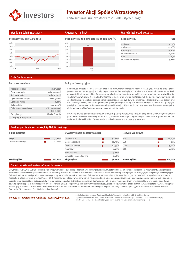 Investor Akcji Spółek Wzrostowych Karta subfunduszu Investor Parasol SFIO - styczeń 2017 Wyniki na dzień 31.01.2017 Stopa zwrotu od 16.03.2015 Aktywa: 7,53 mln zł Wartość jednostki: 109,13 zł Stopa zwrotu za pełne lata kalendarzowe (%) Stopa zwrotu 1 miesiąc 3 miesiące 6 miesięcy od początku roku 1 rok od pierwszej wyceny PLN 4,02% 10,28% 16,12% 4,02% 25,13% 9,18% Opis Subfunduszu Podstawowe dane Początek działalności Polityka inwestycyjna 16.03.2015 Pierwsza wpłata min. 100,00 zł Kolejna wpłata min. 50,00 zł Opłata manipulacyjna max. 5,00 % Opłata za wykup Opłata stała Opłata zmienna od zysku Zarządzający Dostępny w programie 0,00% max. 4,00 % 25% zysku ponad benchmark Maciej Chudzik ISO Subfundusz inwestuje środki w akcje oraz inne instrumenty finansowe oparte o akcje (np. prawa do akcji, prawa poboru, warranty subskrypcyjne, kwity depozytowe) emitentów będących spółkami wzrostowymi głównie na rynkach amerykańskim i europejskim. Dopuszcza się okazjonalne inwestycje w spółki z innych rynków np. azjatyckich. Za spółki wzrostowe uważa się spółki działające w sektorach/branżach o wyróżniających się perspektywach wzrostu, lub spółki mające potencjał silniejszego wzrostu przychodów oraz zysków w porównaniu do średniej z własnej branży oraz do szerokiego rynku, lub spółki generujące ponadprzeciętne zwroty na zainwestowanym kapitale oraz przepływy pieniężne pozwalające na finansowanie ekspansji/rozwoju. Udział akcji oraz instrumentów finansowych opartych o akcje w aktywach Subfunduszu może wynosić od 70% do 100%. Pozostałe aktywa Subfundusz inwestuje w dłużne papiery wartościowe i instrumenty rynku pieniężnego emitowane przez Skarb Państwa, Narodowy Bank Polski, jednostki samorządu terytorialnego i inne władze publiczne (w tym państw członkowskich Unii Europejskiej), przedsiębiorstwa oraz w depozyty bankowe. Analiza portfela Investor Akcji Spółek Wzrostowych Skład portfela Dywersyfikacja sektorowa akcji Pozycje walutowe Akcje 71,86% Informatyka 30,06% PLN Gotówka i depozyty 28,14% Ochrona zdrowia 20,78% EUR 19,21% Dobra luksusowe 10,49% USD 15,62% Finansowy 4,97% DKK 4,50% Przemysłowy 3,08% Usługi telekomunikacyjne Portfel ogółem 100,00% Akcje ogółem 60,67% 2,48% 71,86% Waluta ogółem 100,00% Dane kontaktowe i ważne informacje prawne Dotychczasowe wyniki Subfunduszu nie stanowią gwarancji osiągnięcia podobnych wyników w przyszłości. Investors TFI S.A. ani Investor Parasol SFIO nie gwarantują osiągnięcia założonych celów inwestycyjnych Subfunduszu. Niniejszy materiał ma charakter informacyjny i nie zawiera pełnych informacji niezbędnych do oceny ryzyka związanego z inwestycją w Subfundusz i nie stanowi przekazu reklamowego. Przy nabyciu jednostek uczestnictwa Subfunduszu pobierana jest opłata manipulacyjna na zasadach i w wysokości określonej w Prospekcie Informacyjnym Investor Parasol SFIO. Prezentowane stopy zwrotu z inwestycji nie uwzględniają opłat manipulacyjnych pobieranych przy nabyciu lub konwersji jednostek uczestnictwa. Szczegółowy opis czynników ryzyka, zasady sprzedaży jednostek uczestnictwa Subfunduszu, tabela opłat manipulacyjnych oraz szczegółowe informacje podatkowe zawarte są w Prospekcie Informacyjnym Investor Parasol SFIO, dostępnym w punktach dystrybucji Funduszu, siedzibie Towarzystwa oraz na stronie www.investors.pl. Zyski osiągnięte z inwestycji w jednostki uczestnictwa Subfunduszu obciążone są podatkiem od dochodów kapitałowych, na podst. Ustawy z dnia 26 lipca 1991 r. o podatku dochodowym od osób fizycznych, (Dz. U. 00.14.176 z późniejszymi zmianami). Investors Towarzystwo Funduszy Inwestycyjnych S.A. ul. Mokotowska 1 I 00-640 Warszawa I Infolinia 801 00 33 70 I +48 22 588 18 45 I investors.pl Sąd Rejonowy dla M.St. Warszawy w Warszawie XII Wydział Gospodarczy I KRS 0000227685 I NIP 1070001525 REGON 140027134 I Kapitał zakładowy jest równy kapitałowi wpłaconemu i wynosi 7 257 190 zł