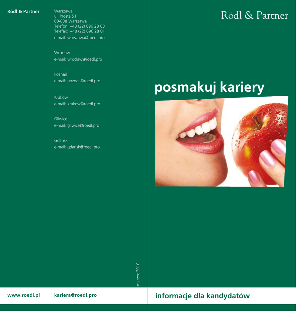 Rödl & Partner Warszawa ul. Prosta 51 00-838 Warszawa Telefon: +48 (22) 696 28 00 Telefax: +48 (22) 696 28 01 e-mail: [email protected] Wrocław e-mail: [email protected] Poznań e-mail: [email protected] Kraków e-mail: [email protected] Gliwice e-mail: [email protected] Gdańsk marzec 2010 e-mail: [email protected] www.roedl.pl [email protected] informacje dla kandydatów SZANOWNI PAŃSTWO, Rödl & Partner jest jedną z pierwszych firm doradczych niemieckiego pochodzenia obecnych na polskim rynku. Naszą działalność rozpoczęliśmy w Polsce w 1992 r. jako kompetentny doradca w zakresie audytu, outsourcingu usług finansowo - księgowych, doradztwa podatkowego i prawnego oraz konsultingu personalnego i informatycznego. Jesteśmy obecni w sześciu miastach Polski. Można nas znaleźć w Warszawie, Gdańsku, Gliwicach, Krakowie, Poznaniu, Wrocławiu. Wszystkie nasze usługi świadczymy pod jedną marką Rödl & Partner, a to stanowi dla naszych Klientów sygnał, że jakość naszych usług ma jednolity charakter. W Polsce działamy według zasady „niemiecka jakość w doradztwie”, a wyróżniającym nas kryterium są wysoko wykwalifikowani specjaliści bardzo dobrze posługujący się językiem niemieckim. Potwierdzeniem wysokiego poziomu świadczonych przez nas usług jest wielokrotne nagradzanie nas „Medalem Europejskim dla Usług”. Z roku na rok zajmujemy w Polsce coraz wyższe pozycje w prestiżowych rankingach na łamach Rzeczpospolitej i Gazety Prawnej. Jesteśmy obecni wśród najlepszych kancelarii prawnych oraz plasujemy się w czołówce firm doradztwa podatkowego. W kategorii „spółek audytorskich” jesteśmy piątą pod względem przychodów finansowych grupą zajmującą się badaniem sprawozdań finansowych i od lat stanowimy alternatywę dla spółek Wielkiej Czwórki. Od samego początku istotę rozwoju naszej firmy stanowią pracownicy, którzy w sposób otwarty i twórczy podejmują wyzwania stawiane przez przyszłość. Nasi pracownicy wiedzą, że na udaną pracę zespołową składają się, poza wysokimi kwalifikacjami, również indywidualne predyspozycje pozwalające osiągać stałe sukcesy. Możliwość rozwoju, jasno określona ścieżka kariery, praca w zespole doświadczonych księgowych, doradców podatkowych, biegłych rewidentów, adwokatów, radców prawnych i doradców podatkowych sprawiają, że Rödl & Partner to przedsiębiorstwo, w którym warto pracować. Partnerzy Rödl & Partner KIM JESTEŚMY? Rödl & Partner jest jedną z wiodących firm audytorskich, doradztwa prawnego i podatkowego. Wspiera przedsiębiorstwa na całym świecie w prowadzonej przez nie działalności i jest reprezentowany we wszystkich ważnych centrach gospodarczych świata. Szczególną pozycję osiągnął w Europie Środkowo-Wschodniej i Zachodniej oraz w Azji, Chinach i USA. Obecnie 3000 pracowników doradza klientom w 84 kancelariach na całym świecie. CATL AUDYT AUDYT Dział audytu w grupie Rödl & Partner zajmuje się badaniem sprawozdań finansowych według polskich [PSR], amerykańskich [US GAAP], niemieckich [HGB] oraz międzynarodowych [MSR] standardów rachunkowości finansowej, sporządzaniem pakietów konsolidacyjnych i świadczeniem innych usług „około-audytowych”. Pracę wykonuje się w zespołach wykwalifikowanych specjalistów i biegłych rewidentów. Sukces działalności Rödl & Partner zapewnia tu zespół ponad 100 pracowników merytorycznych pracujących dla klientów z różnych branż. OUTSOURCING DORADZTWO IT FINANSOWOKSIĘGOWY CONSULTING PERSONALNY Nasze doświadczenia znajdują swoje odzwierciedlenie w publikacjach i szkoleniach przygotowywanych przez naszych pracowników. Jestesmy m.in. autorem tłumaczenia na język niemiecki polskiej ustawy o rachunkowości. CORPORATE AND TAX LAW [CATL] CONSULTING PERSONALNY Kancelarię prawno - podatkową tworzy zespół specjalistów świadczących usługi z zakresu bieżącego doradztwa prawnego i podatkowego, prawa handlowego, cywilnego, karnoskarbowego, podatku VAT. Ponadto nasi specjaliści (radcy prawni i doradcy podatkowi) to wykładowcy wielu prestiżowych uczelni, to również autorzy opracowań dotyczących prawa podatkowego. W ramach consultingu personalnego świadczymy dla naszych klientów usługi z zakresu doradztwa personalnego, głównie rekrutacji. Oprócz tego pośredniczymy w nawiązaniu kontaktów spółek krajowych i zagranicznych z urzędami, instytucjami i przedsiębiorstwami. OUTSOURCING FINANSOWO - KSIĘGOWY DORADZTWO INFORMATYCZNE Outsourcing finansowo - księgowy to także jedna z oferowanych naszym klientom usług. Świadczymy ją w zespołach wysoko wykwalifikowanych księgowych posiadających certyfikat Ministra Finansów i specjalistów z zakresu prawa pracy i ubezpieczeń społecznych. Profesjonalny cykl szkoleń przeprowadzany w trakcie pracy oraz precyzyjnie określona ścieżka kariery pozwalają nam stać się - również w zakresie księgowości - atrakcyjnym pracodawcą. W ramach doradztwa informatycznego świadczymy dla naszych klientów usługi szeroko rozumianego outsourcingu i doradztwa IT. KARIERA W GRUPIE RÖDL & PARTNER PRACOWNICY PODSTAWĄ NASZEGO SUKCESU Siłą Rödl & Partner są ludzie. To dzięki naszym pracownikom jesteśmy w stanie świadczyć dla klientów usługi najwyższej jakości. Przyznajemy: wymagania stawiane kandydatom są wysokie. Jednocześnie jednak zaangażowani pracownicy znajdują u nas korzystne warunki do zbudowania własnej udanej kariery. Szybkie przekazywanie odpowiedzialności, krótkie procedury decyzyjne, przestrzeń do zawodowego i osobistego dokształcania się ma na celu stworzenie takiego otoczenia pracy, które umożliwi Wam samodzielną i odpowiedzialną pracę - w pewnym sensie - tak jakbyście prowadzili własną firmę. Praca w Rödl & Partner otwiera przed Wami nowe możliwości. Do dyspozycji będziecie mieli know - how międzynarodowej grupy firm, świadczącej usługi na całym świecie. Dzięki temu bę