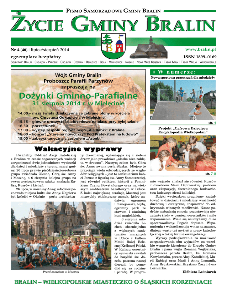 PISMO SAMORZĄDOWE GMINY BRALIN ŻYCIE GMINY BRALIN Nr 4 (40) | lipiec/sierpień 2014 www.bralin.pl egzemplarz bezpłatny ISSN 1899–0169 SOŁECTWA: BRALIN · CHOJĘCIN - PARCELE · CHOJĘCIN · CZERMIN · DZIAŁOSZE · GOLA · MNICHOWICE · NOSALE · NOWA WIEŚ KSIĄŻĘCA · TABOR MAŁY · TABOR WIELKI · WERONIKOPOLE Wójt Gminy Bralin Proboszcz Parafii Parzynów zapraszają na W numerze: Nowa sportowa przestrzeń dla młodzieży Dożynki Gminno-Parafialne 31 sierpnia 2014 r. w Mielęcinie 14.00 – msza święta dziękczynna za zebrane plony w kościele pw. Chrystusa Odkupiciela w Mielęcinie 15.15 – główne uroczystości obrzędowe na placu przy byłej szkole 16.30 – poczęstunek 17.00 – występ zespołu regionalnego „Ale Babki” z Bralina 18.00 – koncert „Stare na nowo, czyli Pod Pretekstem na ludowo” 19.00 – zabawa taneczna z zespołem „Aspekt” str. 4 Projekt „Cyfrowa Dziecięca Encyklopedia Wielkopolan” Wakacyjne wyprawy Parafialny Oddział Akcji Katolickiej z Bralina w czasie tegorocznych wakacji zorganizowałdwiejednodniowewycieczki dladzieciimłodzieżyzterenunaszejgminy. 26 lipca prawie pięćdziesięcioosobowa grupa zwiedzała Olesno, Górę św. Anny i Mosznę, a 6 sierpnia kolejna grupa na swymwycieczkowymszlakuznalazłaKalisz,RussówiLicheń. 26lipca,wimieninyAnny,młodzieżpoznawałamiejscakultuśw.Anny.Najpierw był kościół w Oleśnie – perła architektu- ry drewnianej, wyłaniająca się z zieleni drzewjakoprawdziwa„oleskaróżazaklęta w drewno”. Naszym celem była Góra św.Anny,zwanaperłąŚląska.Miejsceto przyciągawieluodwiedzającychzewzględówreligijnych–jesttosanktuariumbabciJezusazfigurkąśw.AnnySamotrzeciej, jest również reliktem historii z Pomnikiem Czynu Powstańczego oraz największym amfiteatrem bazaltowym w Polsce. Z kolei największą atrakcją Mosznej jest niezwykły eklektyczny zamek, który zadziwia ogromem i disnejowskąbryłą, ogromny park ze stawem i stadniną koniangielskich. 6 sierpnia młodzież zwiedziła Licheń–obecniejedno z większych sanktuariów maryjnych w Polsce z kultem Matki Bożej BolesnejKrólowejPolski. W Kaliszu uczestnicywycieczkizawitali do bazyliki św. Józefa, patrona naszej diecezji, by pomodlić się za rodziny Przed zamkiem w Mosznej i parafię. W progra- str. 7-8 mie wyjazdu znalazł się również Russów z dworkiem Marii Dąbrowskiej, parkiem oraz ekspozycją drewnianego budownictwaludowegoziemikaliskiej. Dzięki wycieczkom pragniemy kształtować w dzieciach i młodzieży wrażliwość duchową i estetyczną, inspirować do odkrywania własnych możliwości. Nasze podróżewzbudzająemocje,pozostawiająniezatarteśladywpamięciuczestnikówimiłe wspomnienia.Wielesięnauczyliśmy,dużo spacerowaliśmy. Pogoda dopisała. Wspomnieniazwakacjizostająw nasnazawsze, dlategowartoteżmyślećwpracykatechetycznejotakiejformieewangelizacji. Wyrazy podziękowania za możliwość zorganizowania obu wyjazdów, za wszelkiewsparciekierujemydoUrzęduGminy Bralin i pana wójta Romana Wojtysiaka, proboszcza parafii Bralin, ks. Romana Krzyżaniaka,prezesAkcjiKatolickiej,Marii Rabiegi oraz Marii i Anny Lemanik, AnnyRyczkowskiej,KrystynyŻaryiJana Leśniarka. Elżbieta Leśniarek BRALIN – WIELKOPOLSKIE MIASTECZKO O ŚLĄSKICH KORZENIACH Z życia urzędu 2 Inwestycje, które ruszą niebawem Rozbudowa sieci kanalizacji sanitarnej Jeszcze w tym roku mieszkańcy ulicy Kępińskiej i Rzemieślniczej w Bralinie będą mieli możliwość podłączenia swoich gospodarstw domowych do sieci kanalizacji sanitarnej. Inwestycja ta jest możliwa dzięki pozyskanym przez samorząd środkom finansowym pochodzącym z Unii Europejskiej w ramach działania „Podstawowe usługi dla gospodarki i ludności wiejskiej” objętego PROW na lata 2007-2013. A jej celem jest poprawa jakości życia i zdrowia mieszkańców oraz poprawa stanu środowiska naturalnego na terenach zurbanizowanych. Na początku lipca wójt gminy Bralin Roman Wojtysiak przy kontrasygnacie skarbnik Grażyny Mosch podpisał umowę z Samorządem Województwa Wielkopolskiego na dofinansowanie inwestycji pn. „Rozbudowa sieci kanalizacji sanitarnej w miejscowości Bralin”. Umowa dofinansowania opiewa na kwotę 451 tys. zł. W połowie sierpnia ogłoszony został przetarg na roboty budowlane. Prace rozpoczną się niezwłocznie po wyłonieniu wykonawcy robót, tak, by do końca roku mieszkańcy mogli korzystać z przyłącza kanalizacyjnego. Już wkrótce budynek czekają duże zmiany wewnątrz i na zewnątrz Budowa chodnika w Nowej Wsi Książęcej 13 sierpnia br. Gmina Bralin ogłosiła zapytanie ofertowe na budowę chodnika w Nowej Wsi Książęcej przy drodze powiatowej nr 5682 P i nr 6680 P. Jesienią mieszkańcy bloków i posesji usytuowanych przy drodze w kierunku Żurawińca będą mogli bezpiecznie przemieszczać się wzdłuż drogi powiatowej. Tabor Mały otrzyma wyposażenie kuchni Niebawem do szkoły, kościoła i sklepu wreszcie wiódł będzie chodnik Po wcześniejszych uzgodnieniach z Powiatem Kępińskim i Powiatowym Zarządem Dróg w Kępnie, zawartymi porozumieniami i podjętymi uchwałami powiat przekazał na ten cel dotację w wysokości 25 tys. zł. Reszta środków niezbędnych do przeprowadzenia tej inwestycji pochodzić będzie z budżetu Gminy Bralin. Chodnik z kostki betonowej zostanie wybudowany na odcinku 0,25 km, a jego szerokość wynosić będzie zasadniczo 1,65 m. Jeszcze w sierpniu powinniśmy znać wykonawcę tych robót. Zgodnie z zapytaniem ofertowym pożądany termin realizacji zamówienia to 10 października br., a nieprzekraczalny czas wykonania robót to 7 listopada. Zakres inwestycji obejmuje budowę chodnika, przebudowę zjazdów, odwodnienie oraz wykonanie nowego oznakowania pionowego i poziomego. Budowa chodnika poprawi komfort ruchu pieszych, ale przede wszystkim będzie miała wpływ na bezpieczeństwo ruchu przy drodze powiatowej. Inwestycje w Taborze Wielkim i Taborze Małym 23 lipca br. w drodze